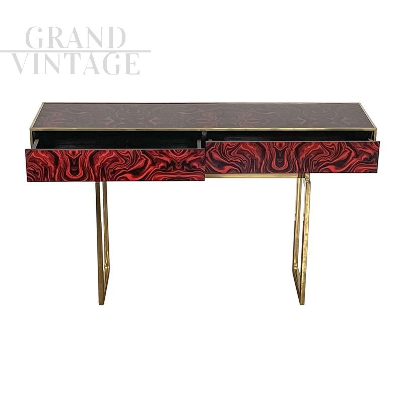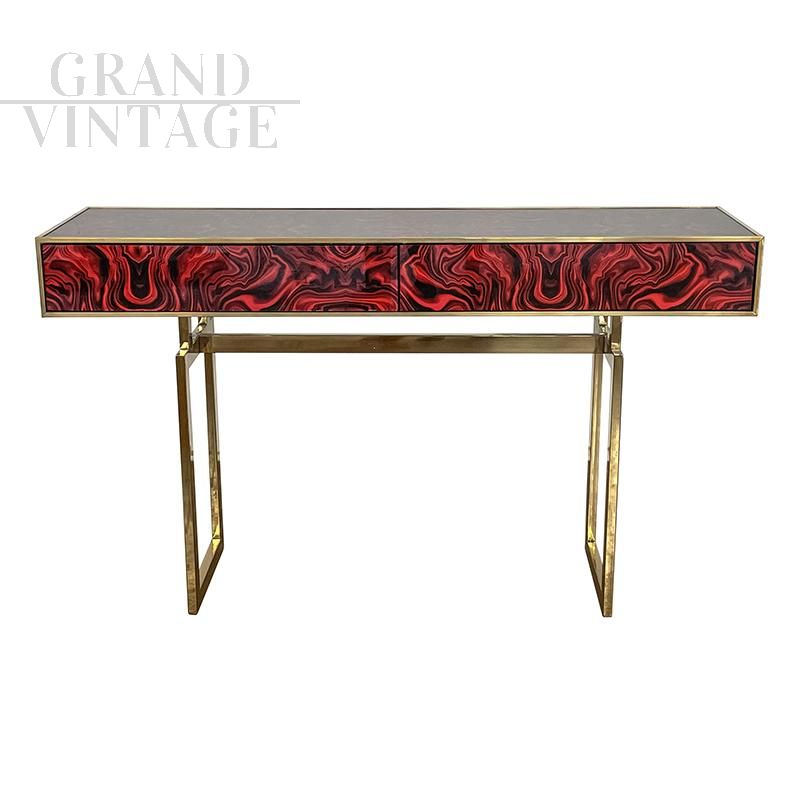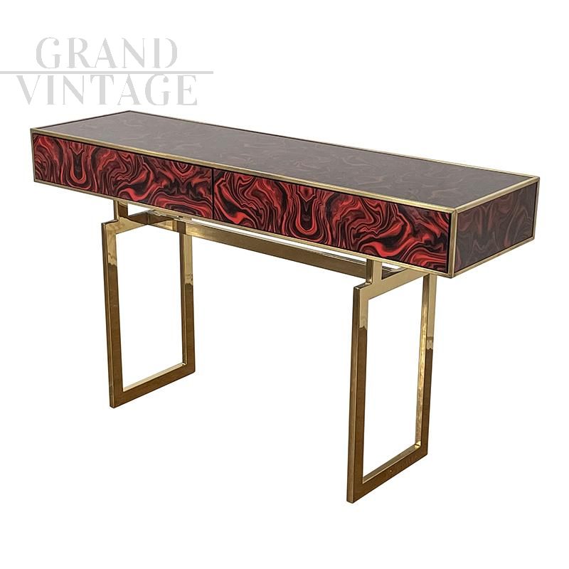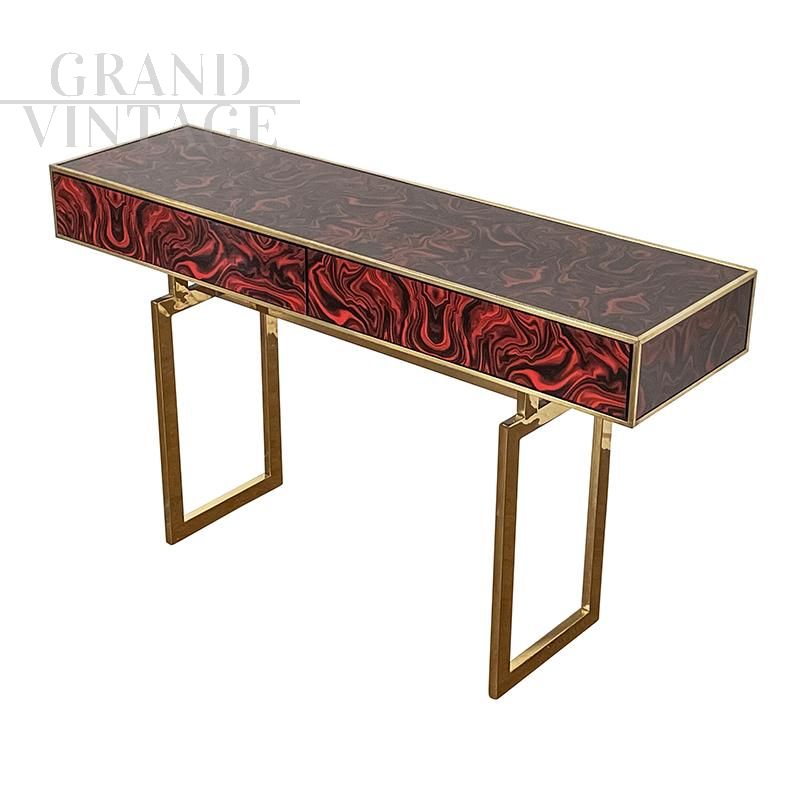 Modern design console in wood covered in red marbled glass, gold chromed tubular structure and brass details, gilded with two push-pull drawers.