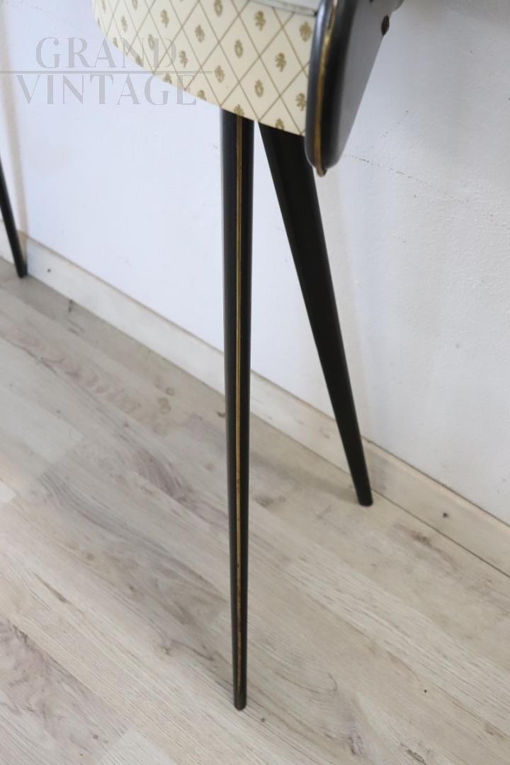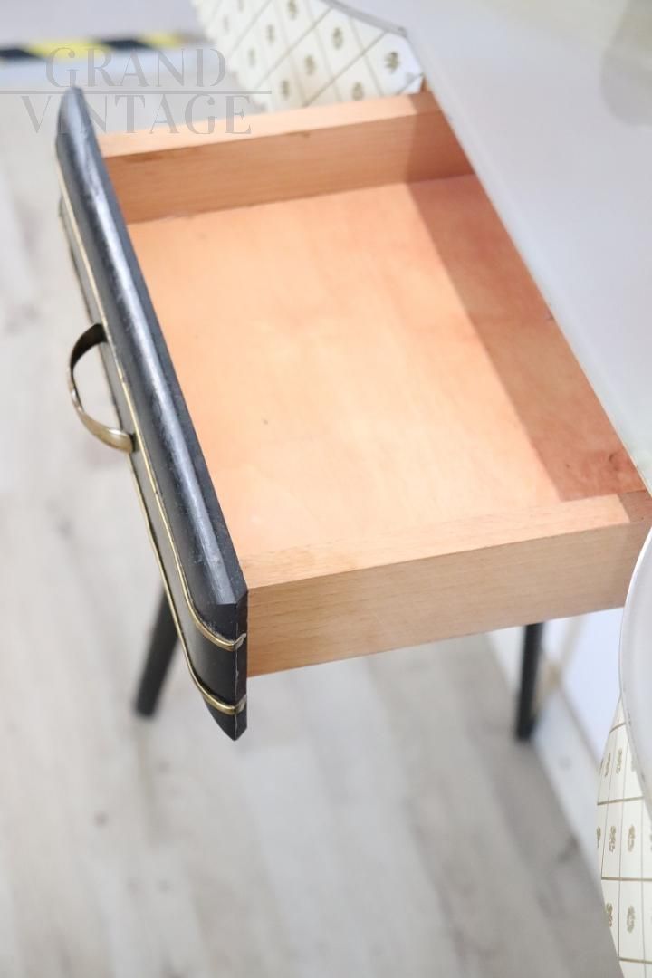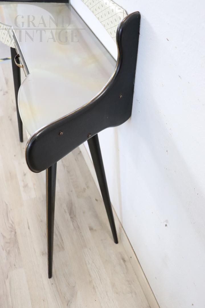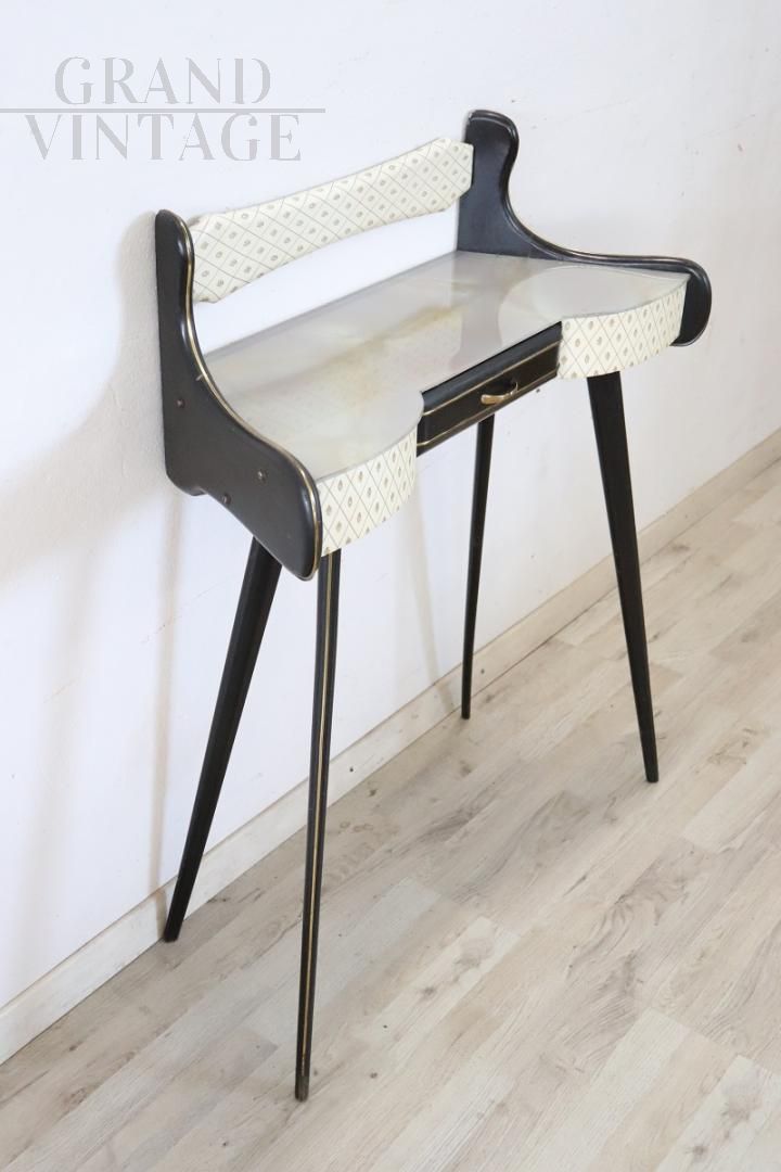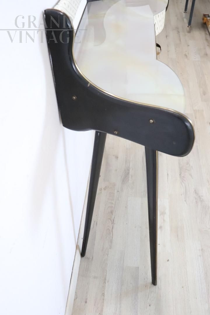 Particular vintage console from the 1950s made of black lacquered wood with a beautiful wavy line on the front and equipped with a practical drawer. The top is in marble-effect decorated glass, the front is covered in plastic with printed decoration. Delicious golden brass decorations highlight the black lacquered parts. Perfect for a modern environment, wall mounting is recommended, but not strictly necessary, for greater stability. Small natural signs of wear, excellent price negotiable.