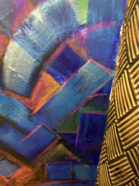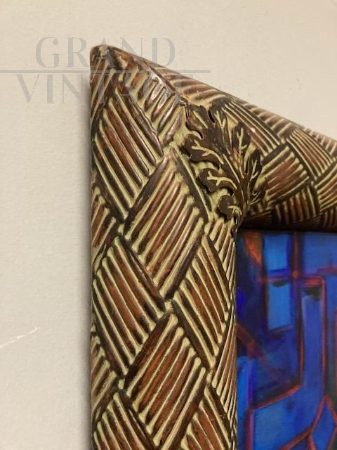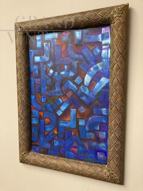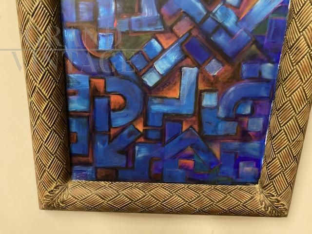 Contemporary art painting with geometries made with polychrome enamels on metal, with a background in shades of red and purple and then in shades of blue. Beautiful carved metal frame. 21st century artist, work signed on the back.