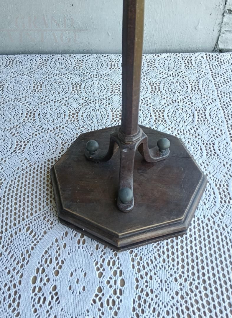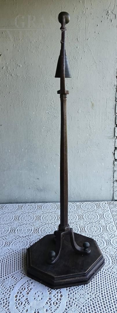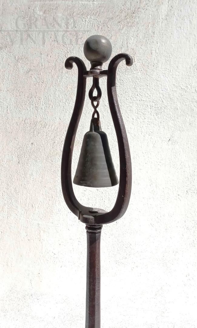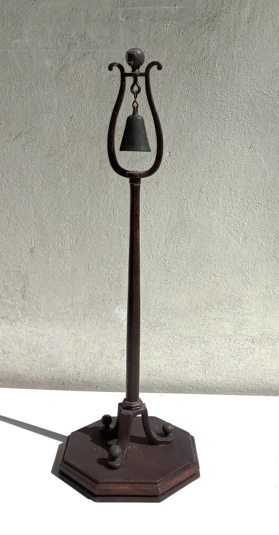 A 1920s pillar-mounted service bell used in a convent refectory to alert the monks that meals were ready. It lacks a clapper, but it makes a pleasant sound when shaken on its metal supports. The knob is brass, while the metal part is finely wrought iron. The base is made of chestnut wood, likely replaced recently. The overall condition is excellent; the object appears stable and suitable for use.