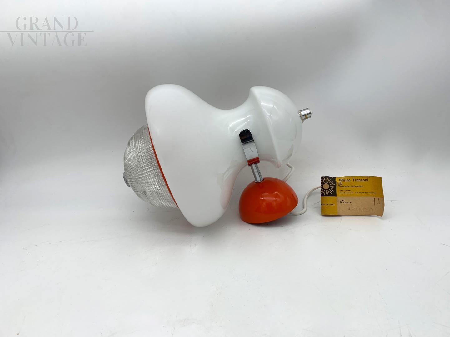 Fantastic and rare pair of Arancio model wall lights by the Tronconi company in orange - red metal with white and transparent glass parts, complete with Enrico Tronconi production certificate. These are one-of-a-kind pieces, with few natural signs of aging and in their original orange paint, the glasses are in perfect condition. Each lamp contains 2 light points with connections for E14 type bulbs, electrical system redone.