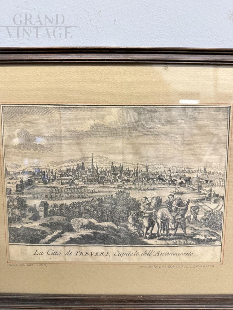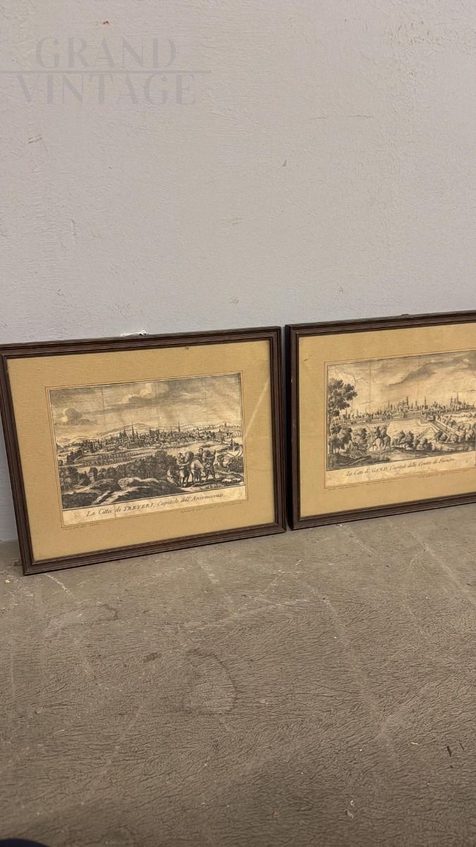 Coppia di antichi quadri con incisioni raffiguranti due città del Belgio, Gand e Treveri, realizzati nell'800. 26 x 31cm, in ottimo stato.