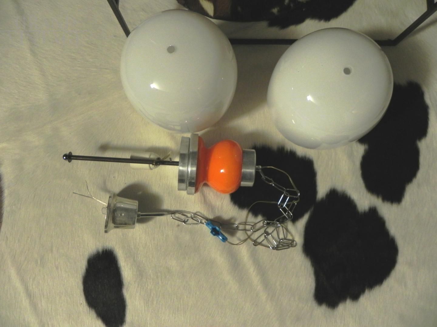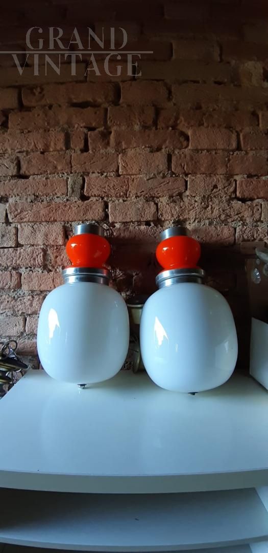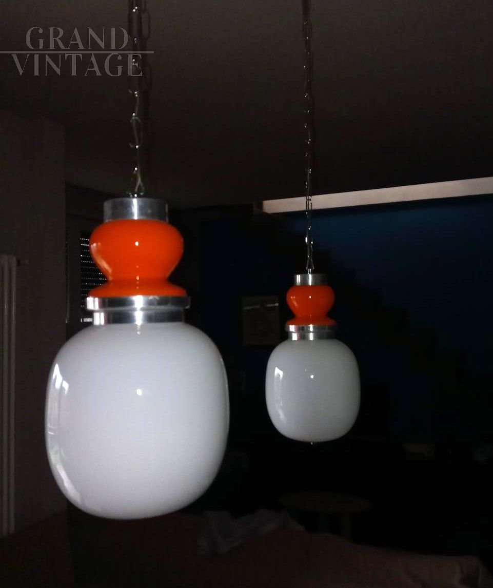 Pair of pendant lights from the 70s in white and red glass with metal details, in very good condition, in working order, with E27 bulb socket.
