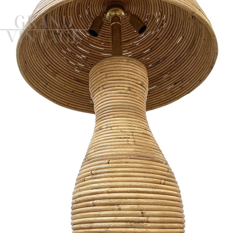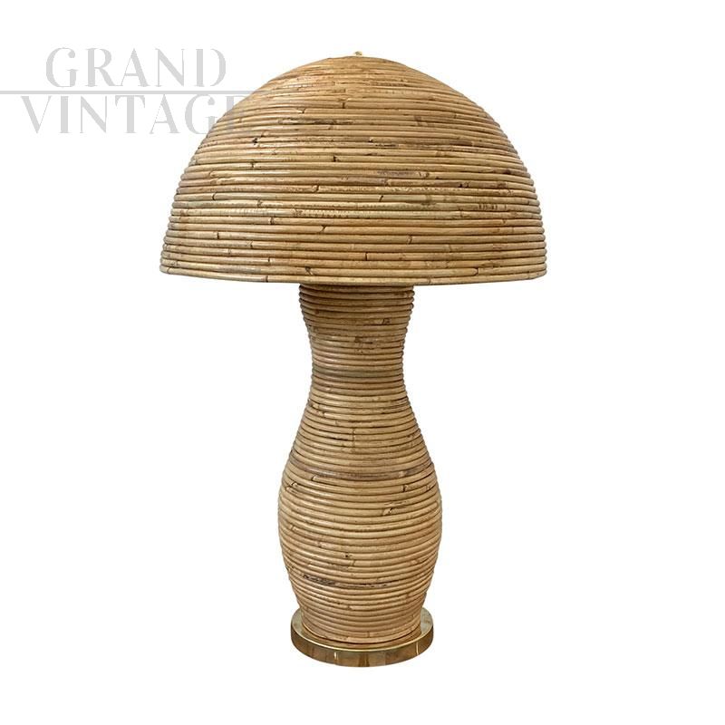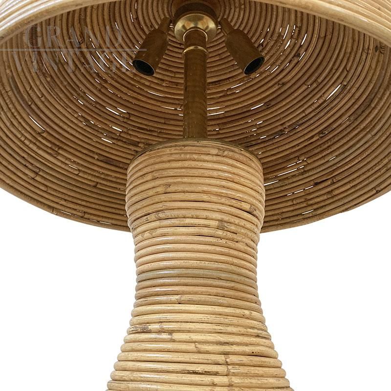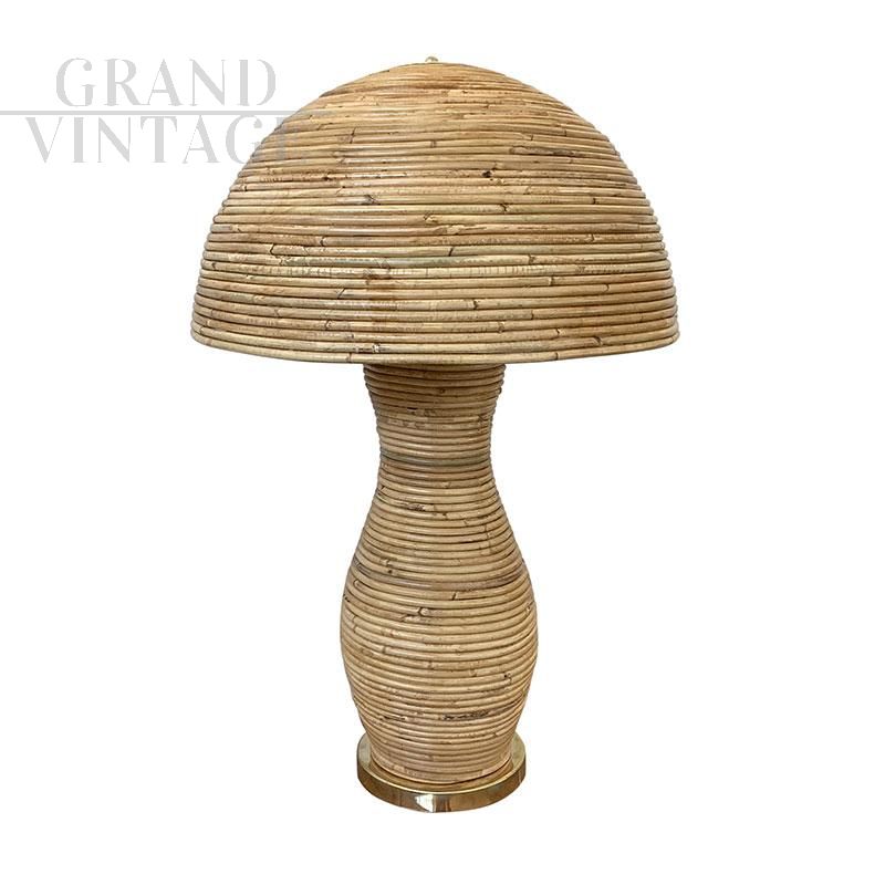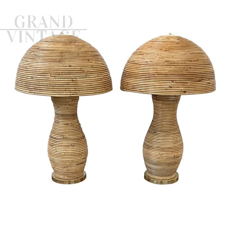 Pair of mushroom-shaped bamboo table lamps with brass base, each lamp is characterized by two adjustable light points for E14 type bulbs.