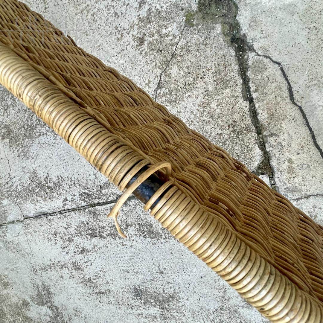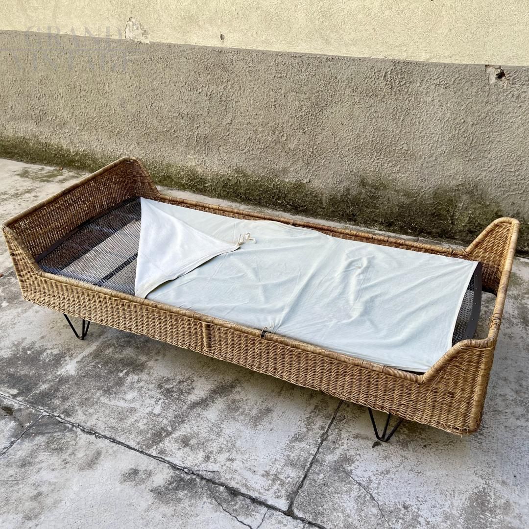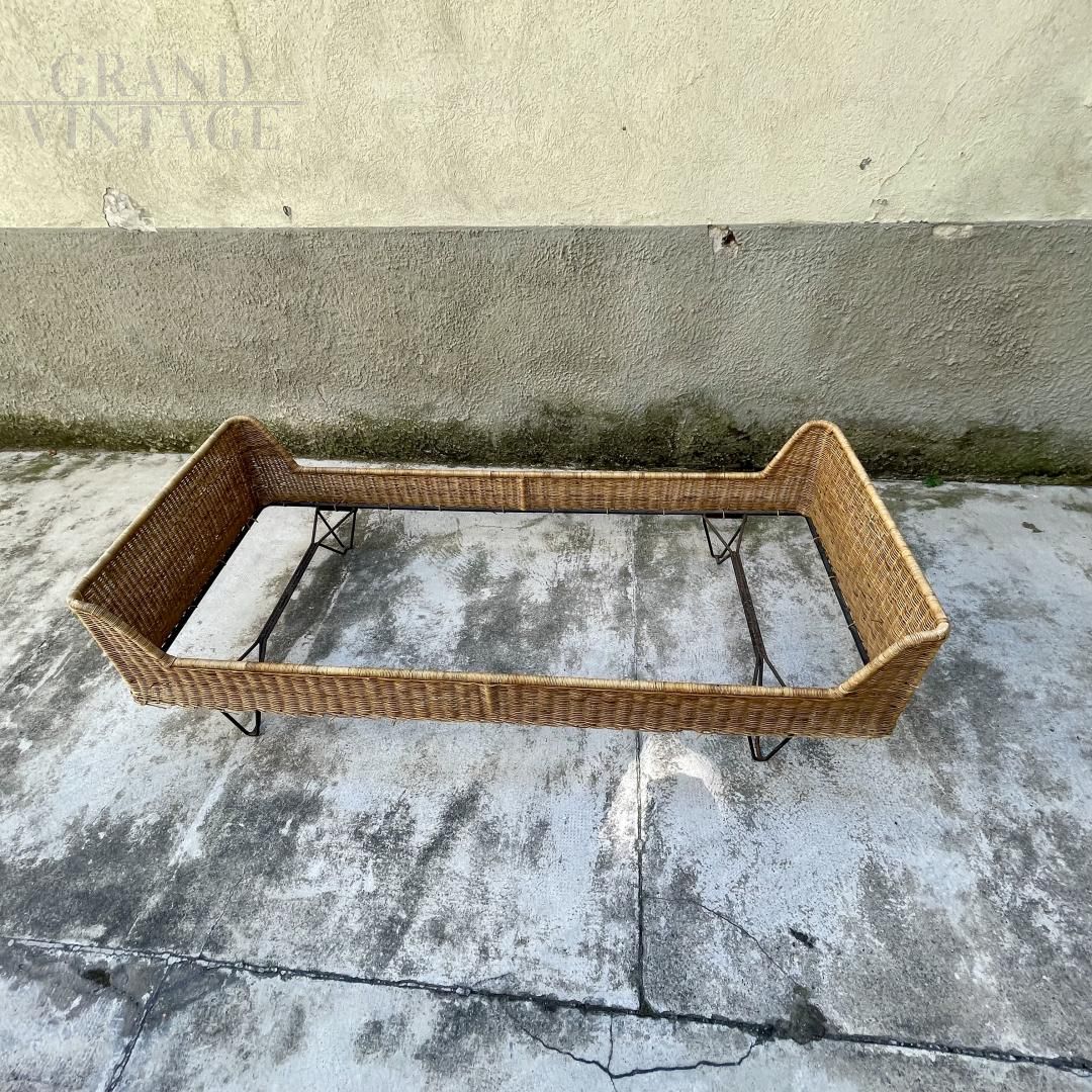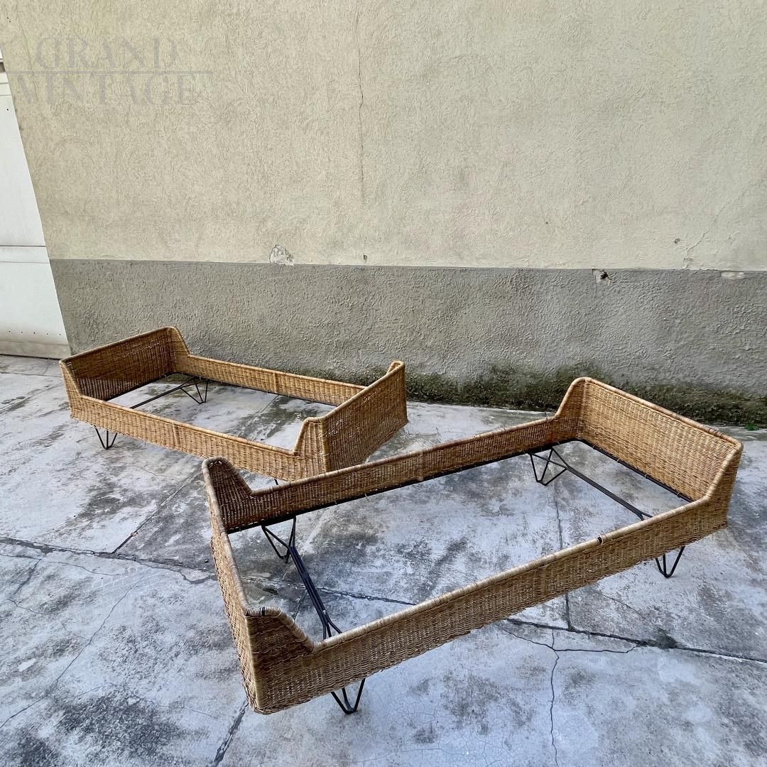 Beautiful pair of 50's beds in hand-woven wicker, with a solid iron structure painted in black and inverted pyramid feet, typical of the time, equipped with the original (optional) bases. In original condition, never been polished, painted or restored, they have some defects in the wicker part, which needs some interventions, as some serial coils need to be restored or replaced (details in the photos).