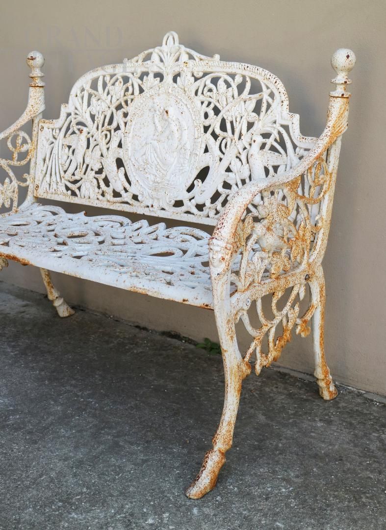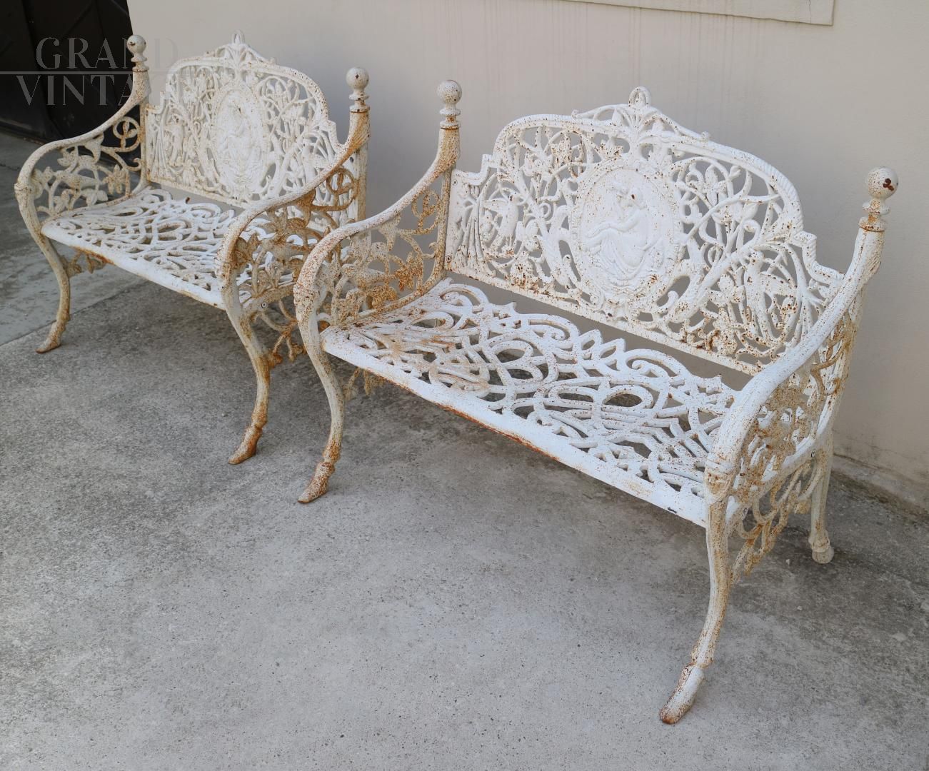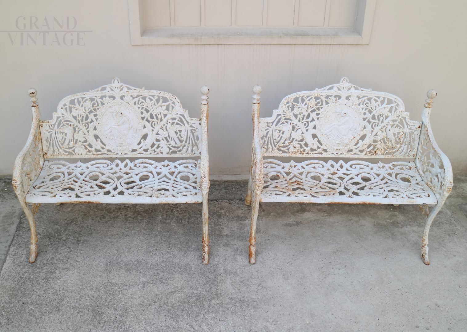 Pair of vintage white cast iron garden benches, with an elegant circular decorative plate on the back. These gorgeous garden benches are extraordinarily decorative and heavy, and fit well in antique, vintage or shabby chic style gardens.
