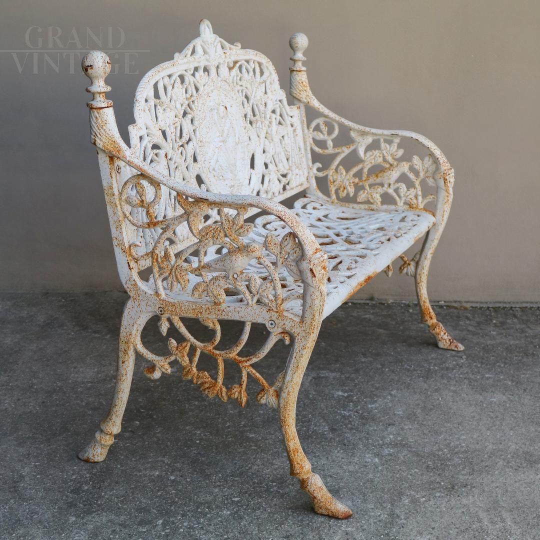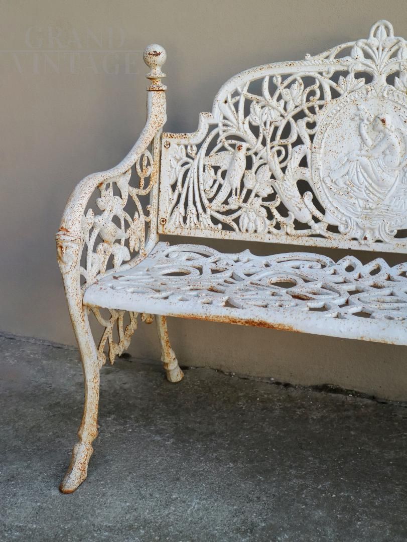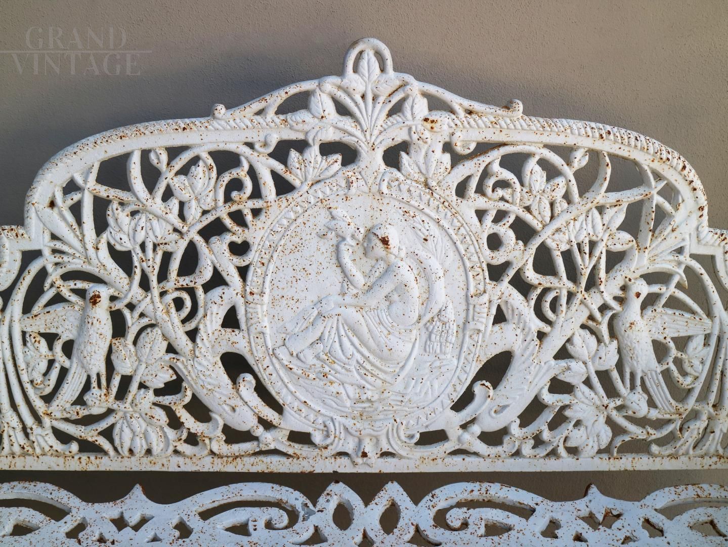 Pair of vintage white cast iron garden benches, with an elegant circular decorative plate on the back. These gorgeous garden benches are extraordinarily decorative and heavy, and fit well in antique, vintage or shabby chic style gardens.