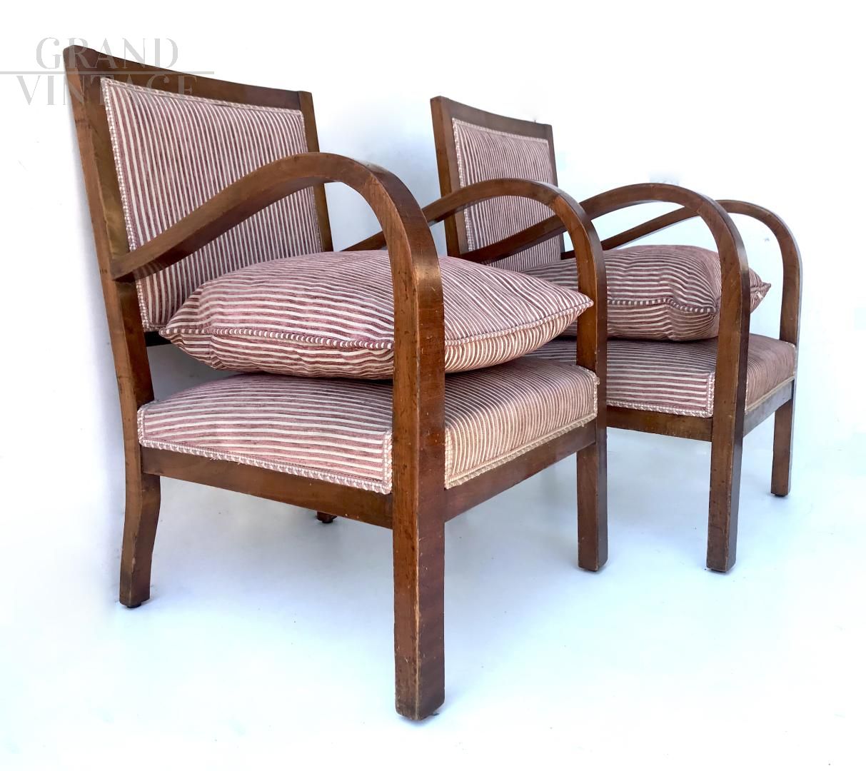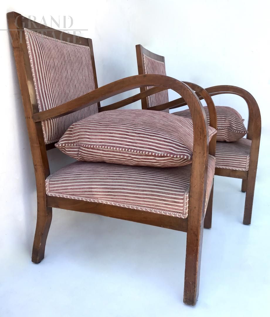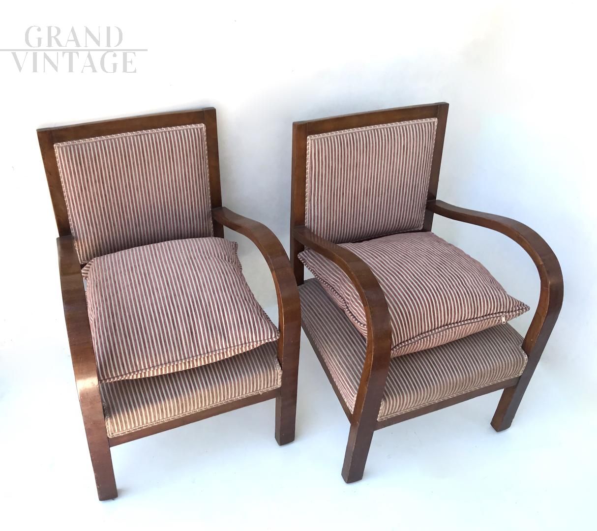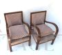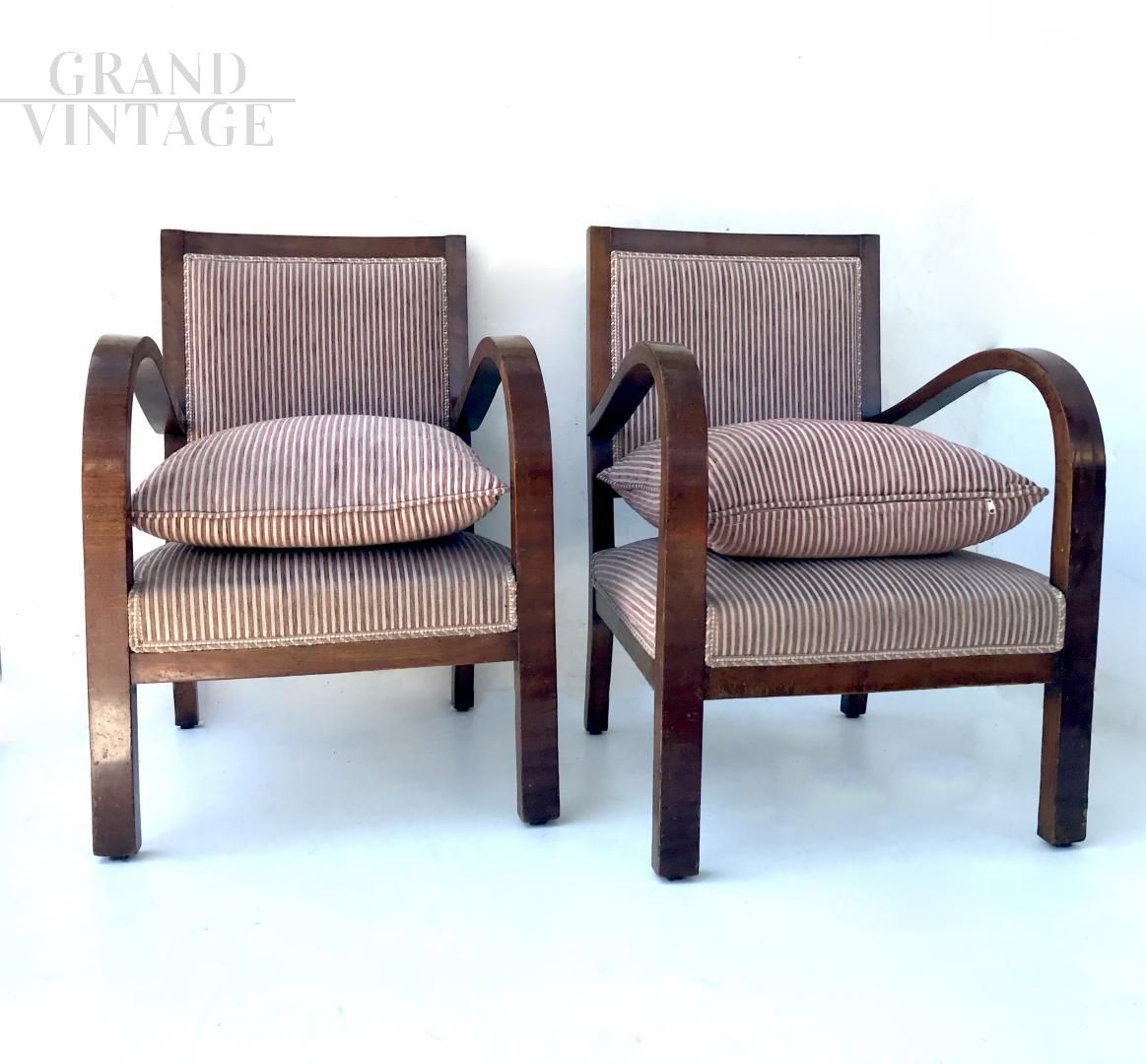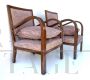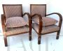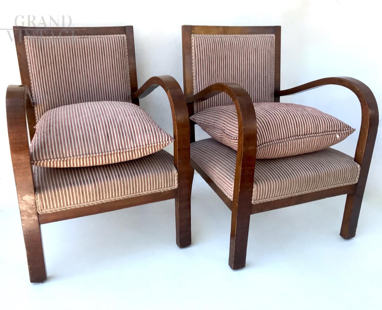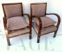 Coppia di poltroncine vintage italiane anni '50 in legno di ciliegio con braccioli curvi tipici dello stile Art Déco, imbottitura in buone condizioni.