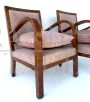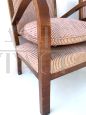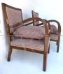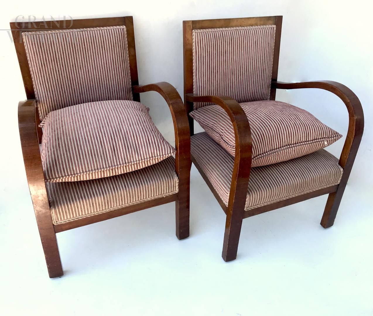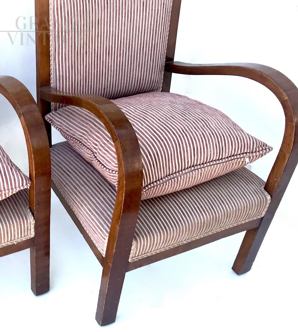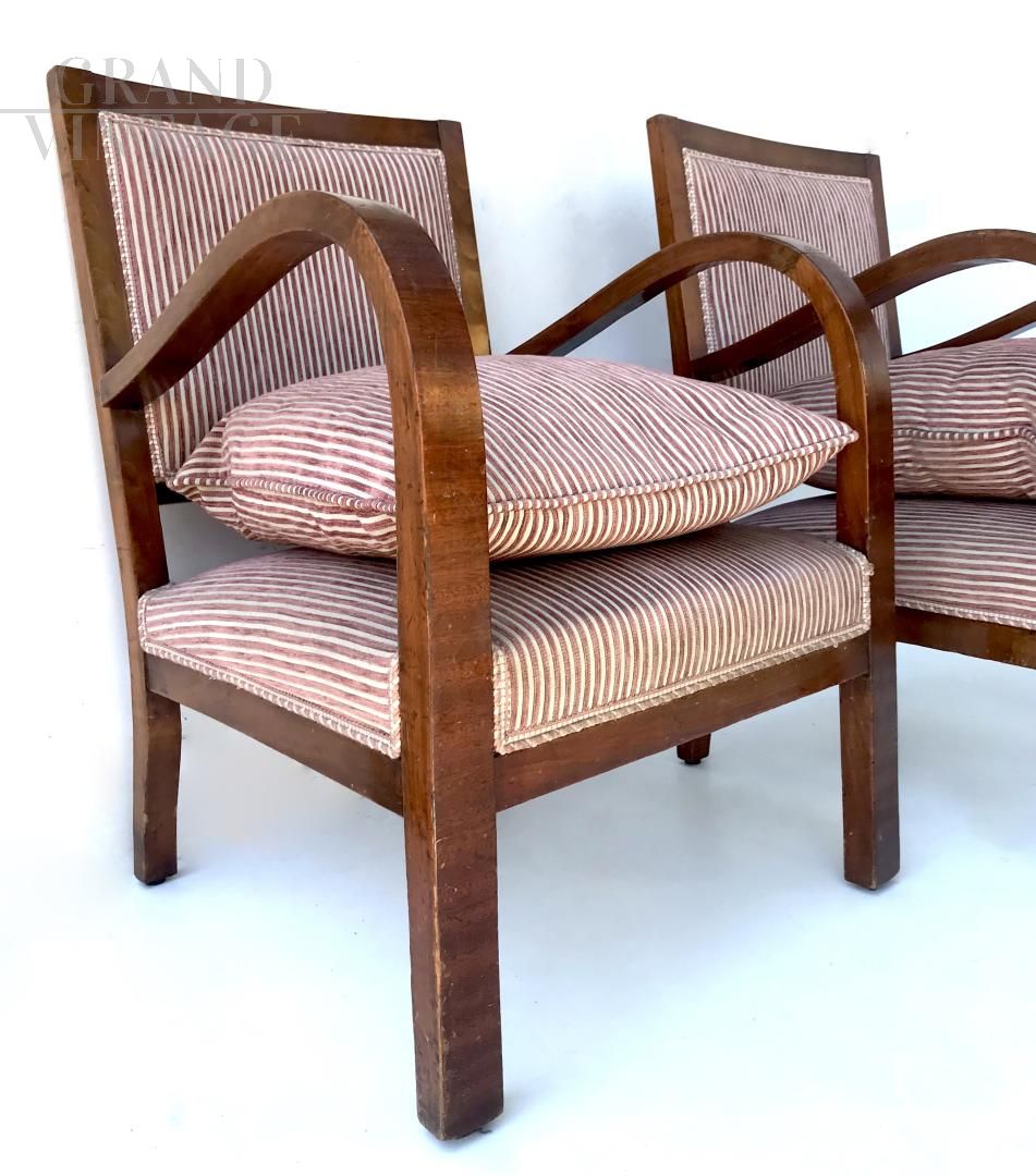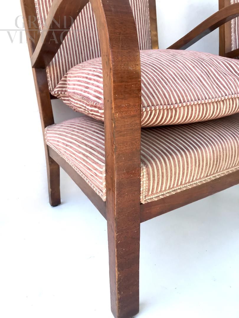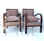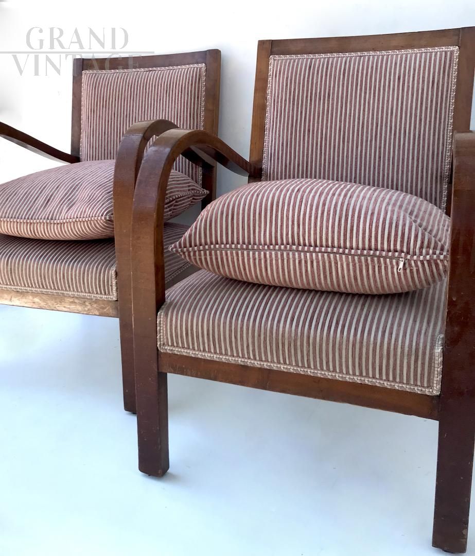 Coppia di poltroncine vintage italiane anni '50 in legno di ciliegio con braccioli curvi tipici dello stile Art Déco, imbottitura in buone condizioni.