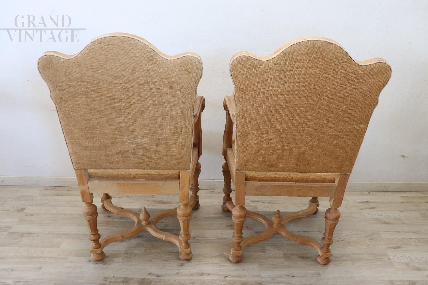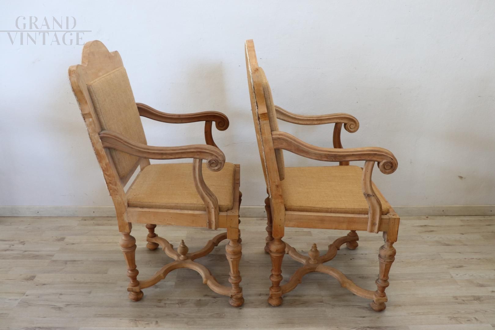 Pair of very comfortable particular armchairs, made of carved poplar wood and left with a natural finish, without color or paint. Perfectly restored padding with jute upholstery. The use of natural materials without modifications or alterations gives these armchairs a special effect, and makes them perfect for use at the head of the table or on the sides of a fireplace. Excellent condition, excellent negotiable price.