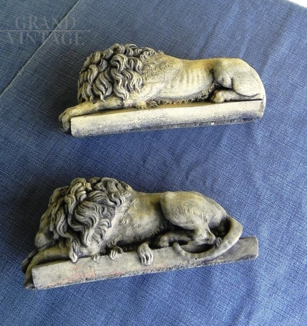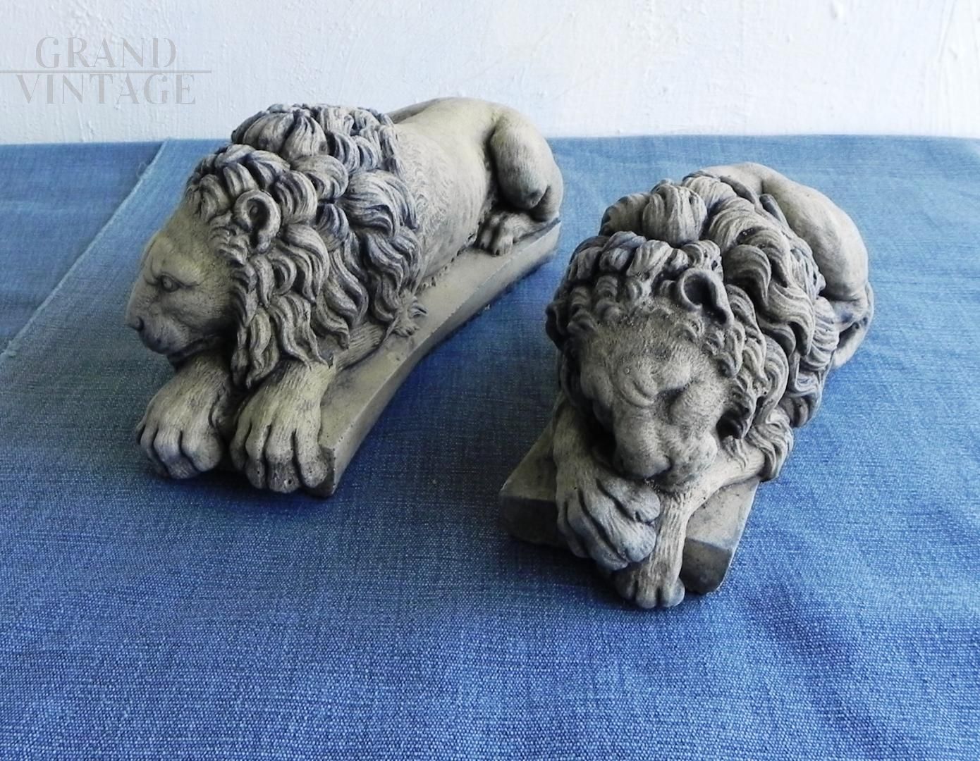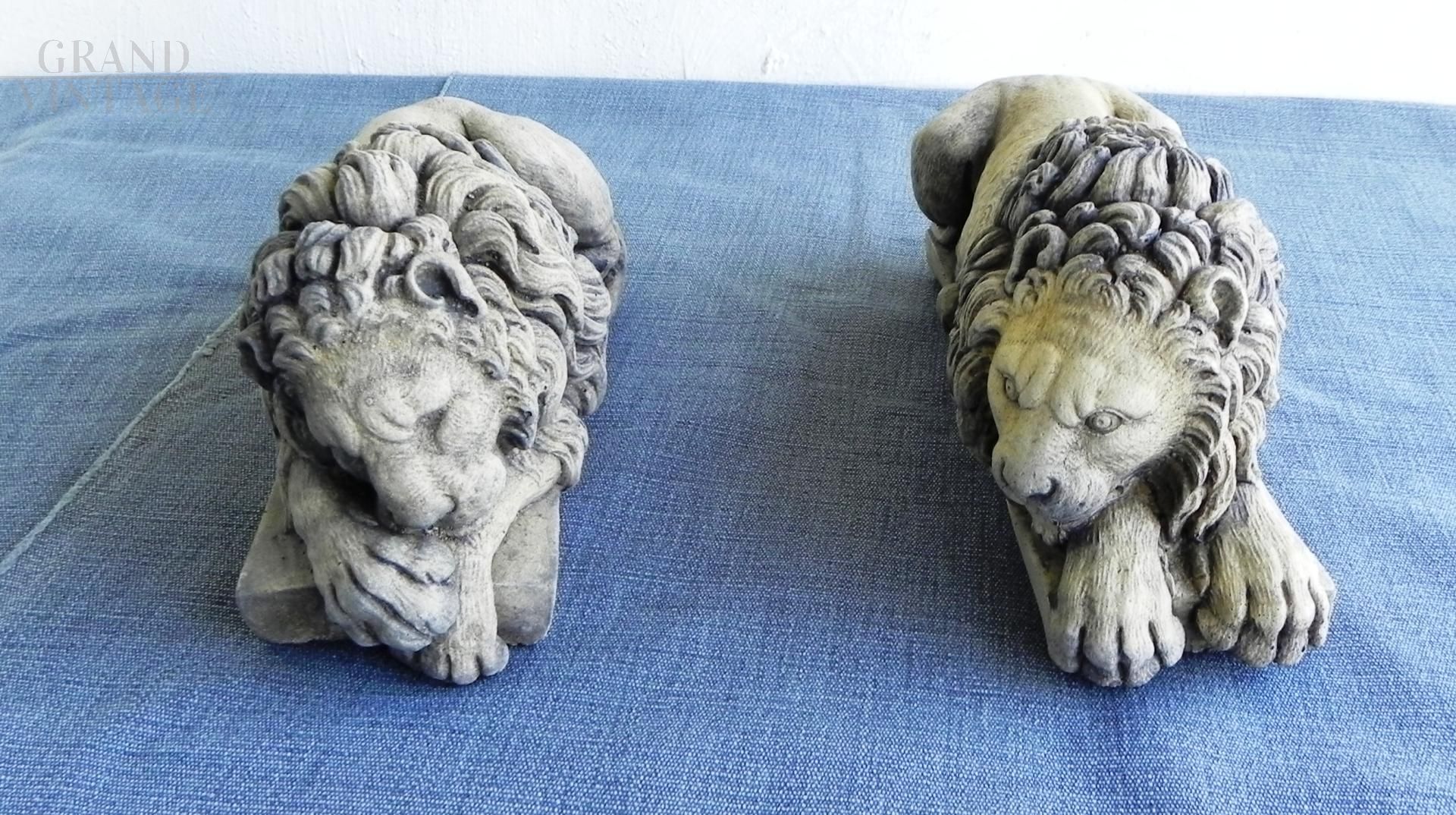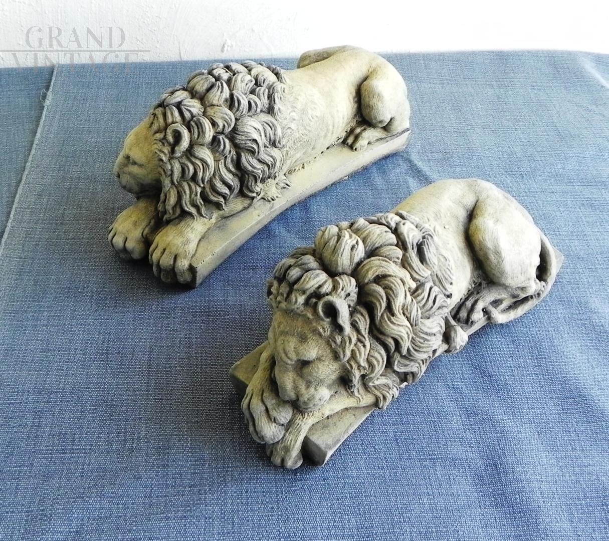 Pair of sculptures depicting sleeping lions in reconstructed stone, ground and cast in a mould, inspired by the original 19th century statues by Antonio Canova located in Chatsworth House in England. Small in size but with perfect execution, weight 3 kg each.