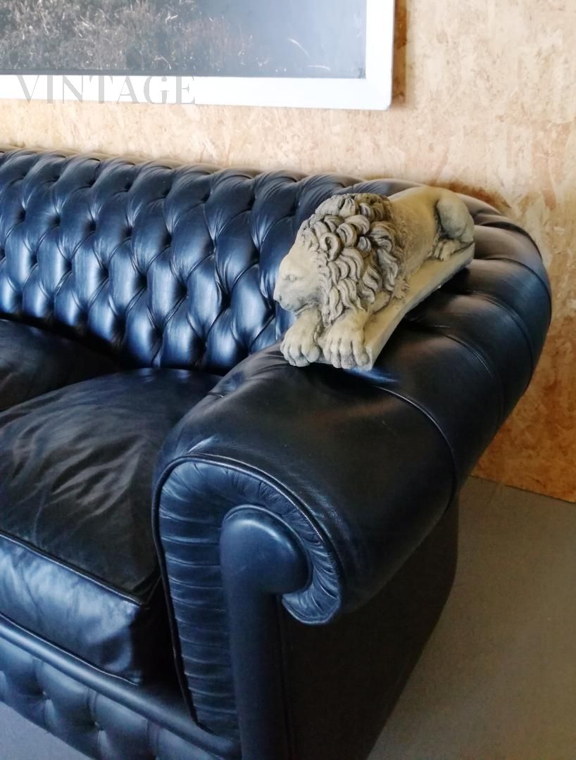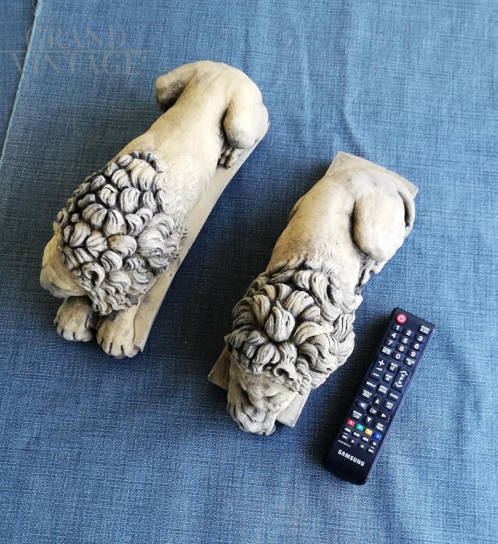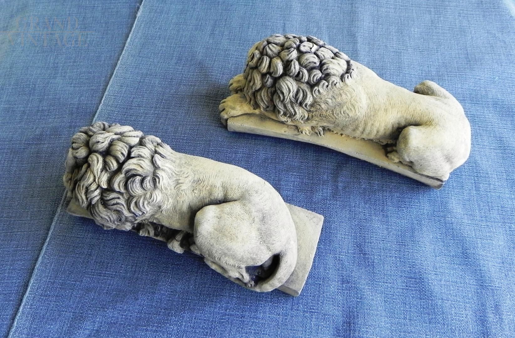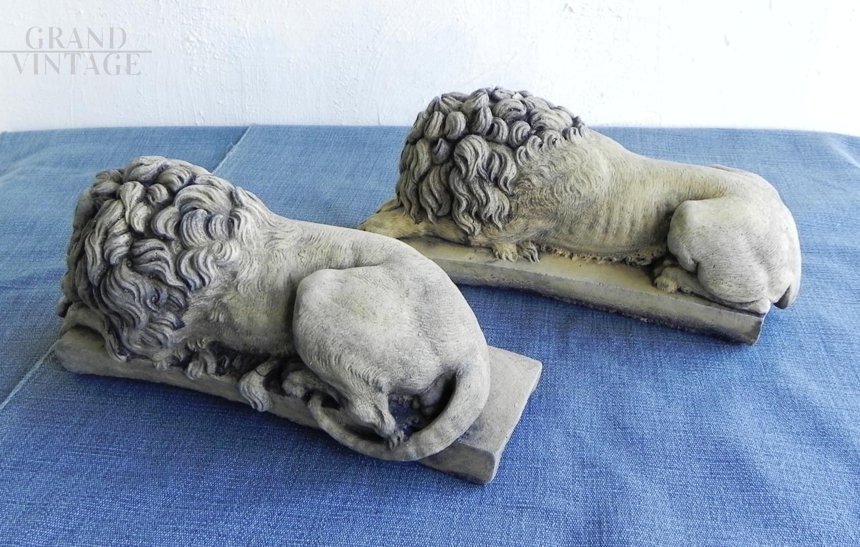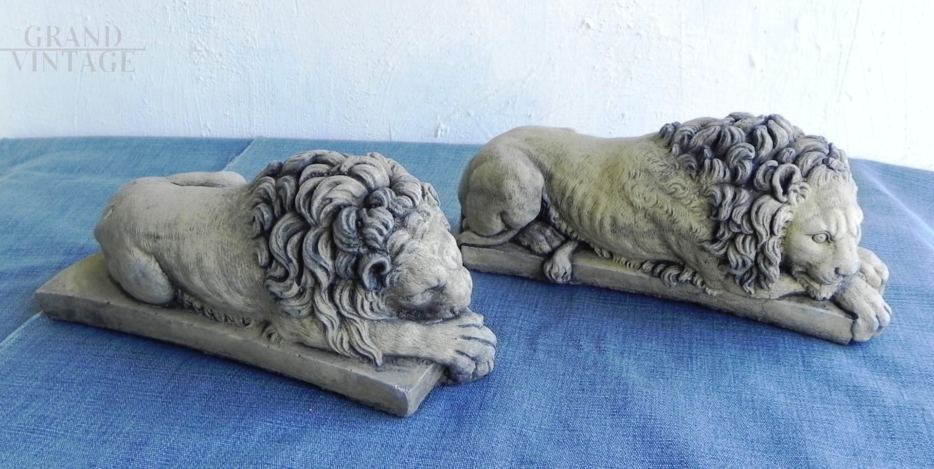 Pair of sculptures depicting sleeping lions in reconstructed stone, ground and cast in a mould, inspired by the original 19th century statues by Antonio Canova located in Chatsworth House in England. Small in size but with perfect execution, weight 3 kg each.