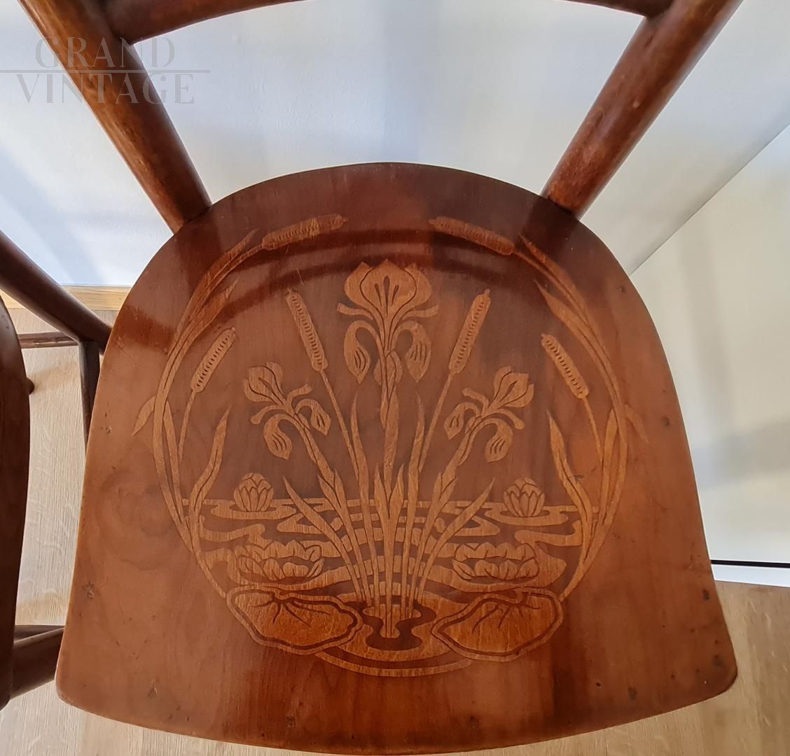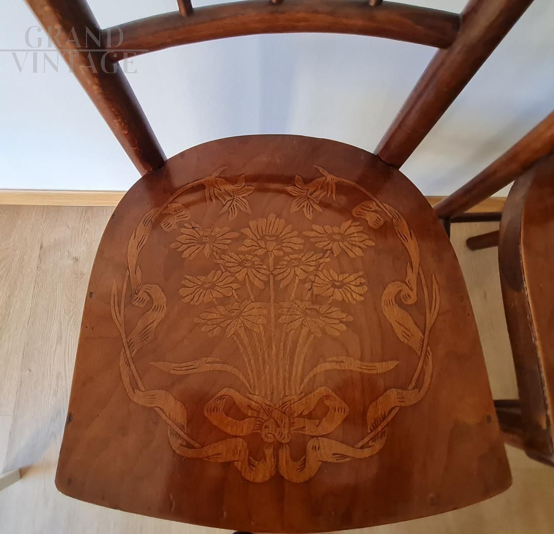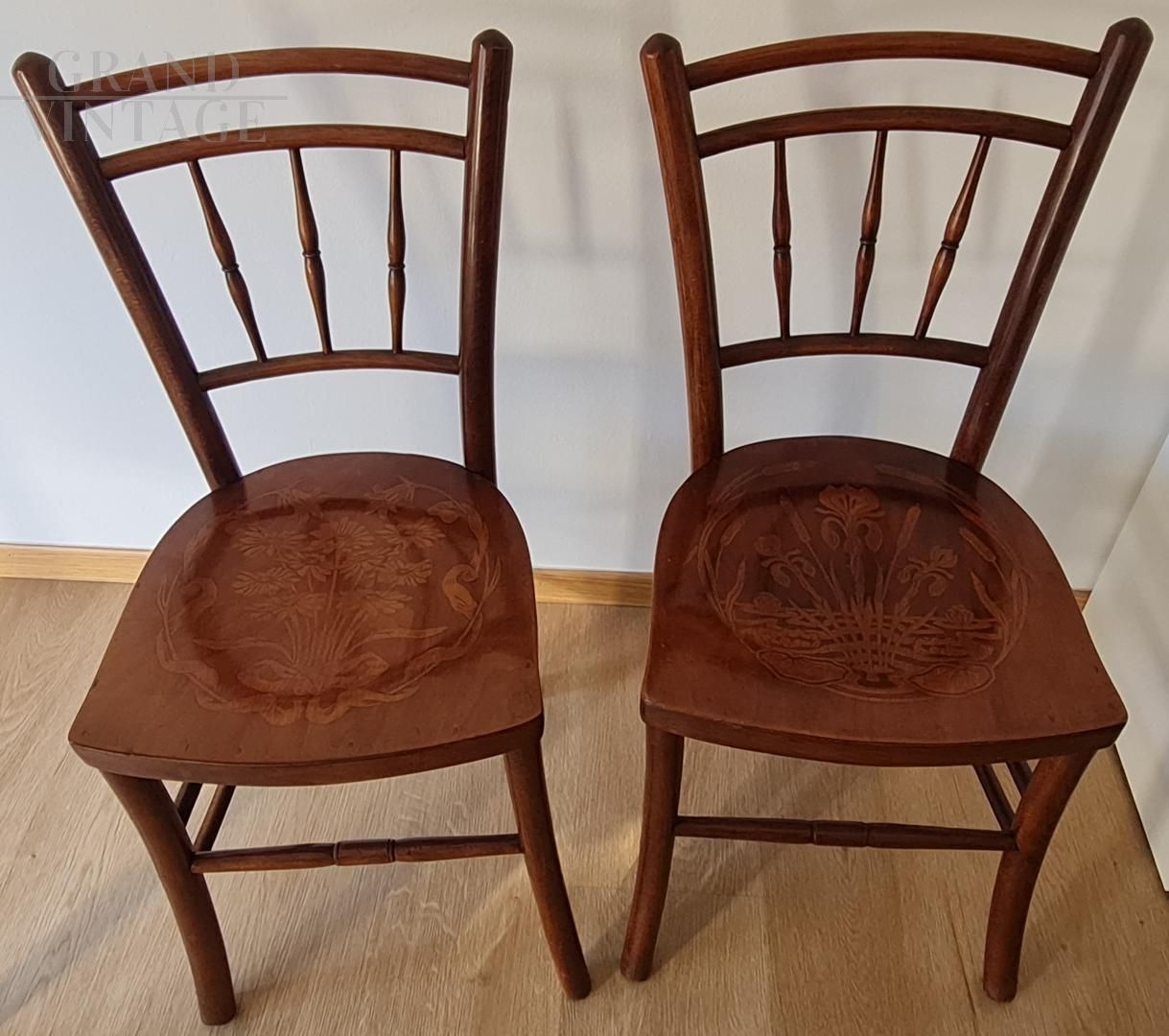 Splendid pair of Austrian Thonet style chairs with floral carvings on the seat, the carvings are different between the two seats. In good condition.