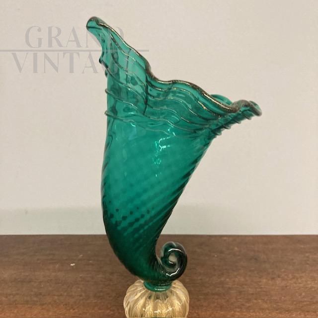 Cornucopia in emerald green artistic glass with gold dust, Italy 1950s