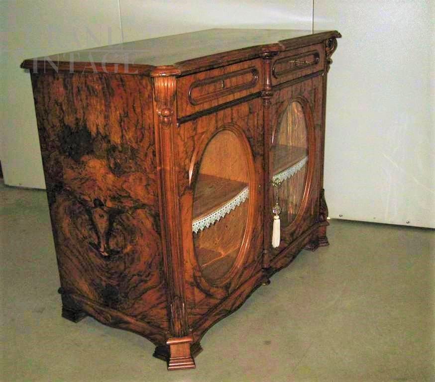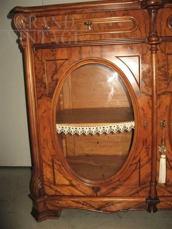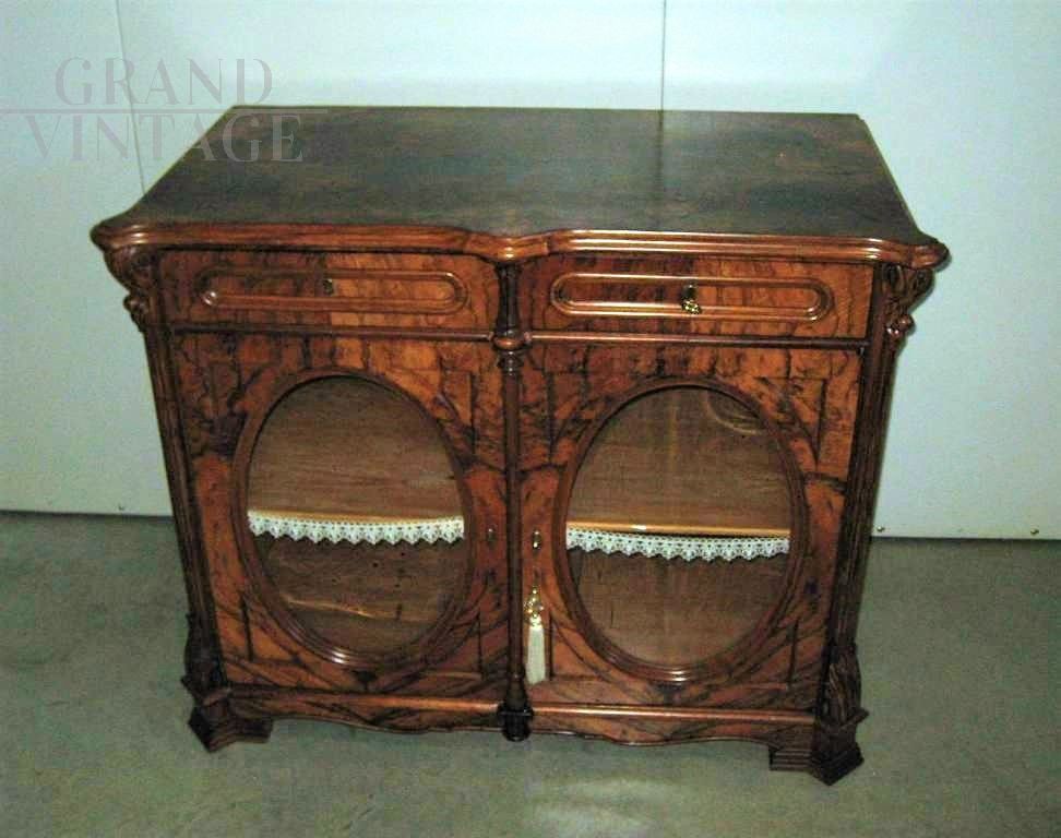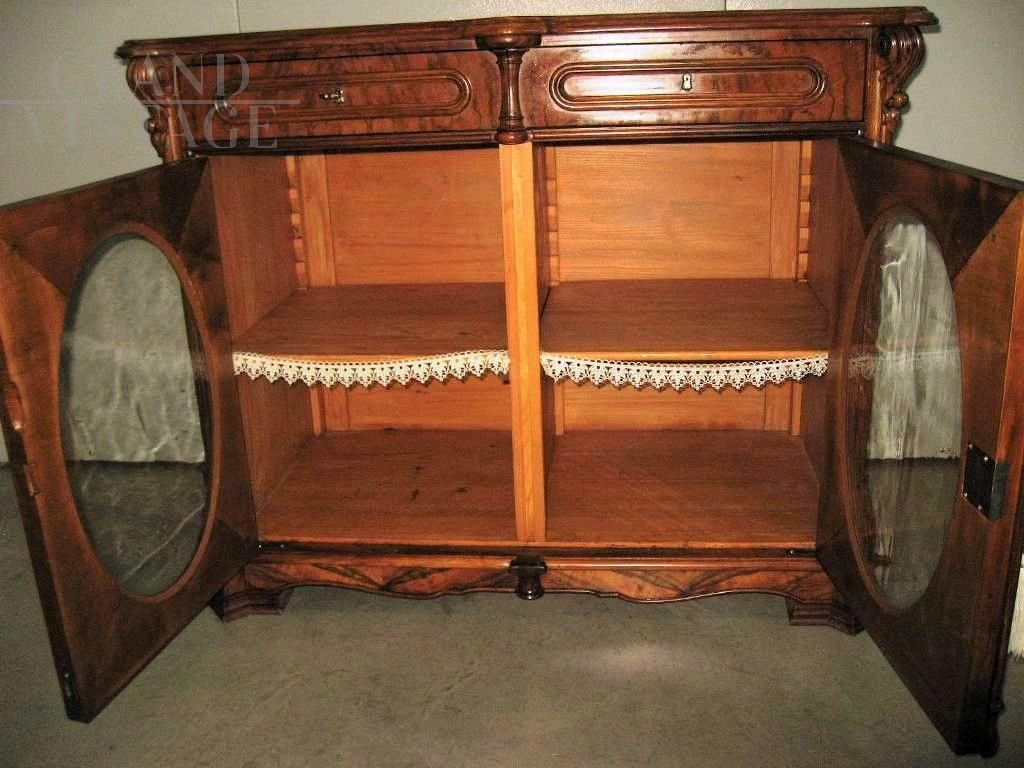 Antique sideboard in walnut briar from the end of the 19th century, from northern Europe. The sideboard is veneered in flamed walnut briar, of excellent cabinet-making, and is characterized by two doors with oval glass in the center and two drawers. Restored some time ago, in excellent general condition. Keys and locks replaced and working.
