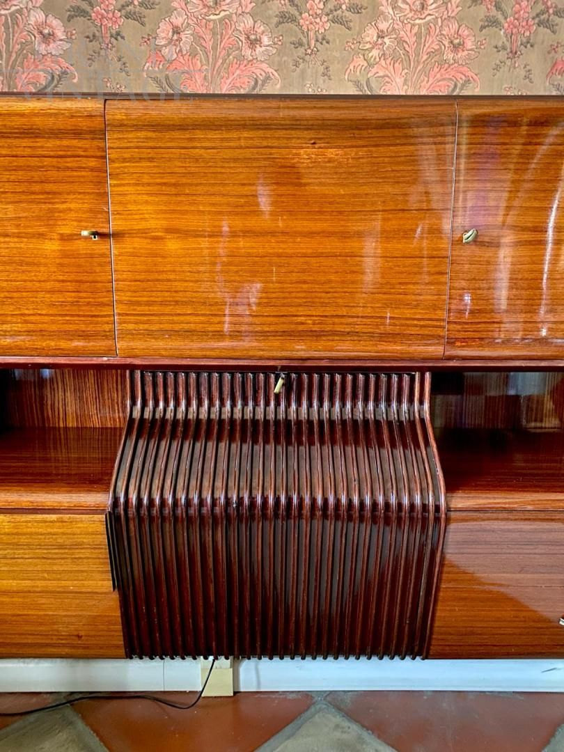 Vintage sideboard from the 1950s with wet bar, designed by Osvaldo Borsani for the Atelier Borsani Varedo. Part of a complete living room set (large sideboard with mirror, dining tables and six chairs) all by Osvaldo Borsani. The sideboard has a solid maple and mahogany wood structure, veneered with fine rosewood. Brass feet and keys. Product of the best quality and Italian manufacturing, the piece of furniture is made up of four refined drawers, a black flap door and an elegant sliding door system. The bar cabinet part is made of refined solid maple, brass and glass columns in classic style. Excellent and completely restored.