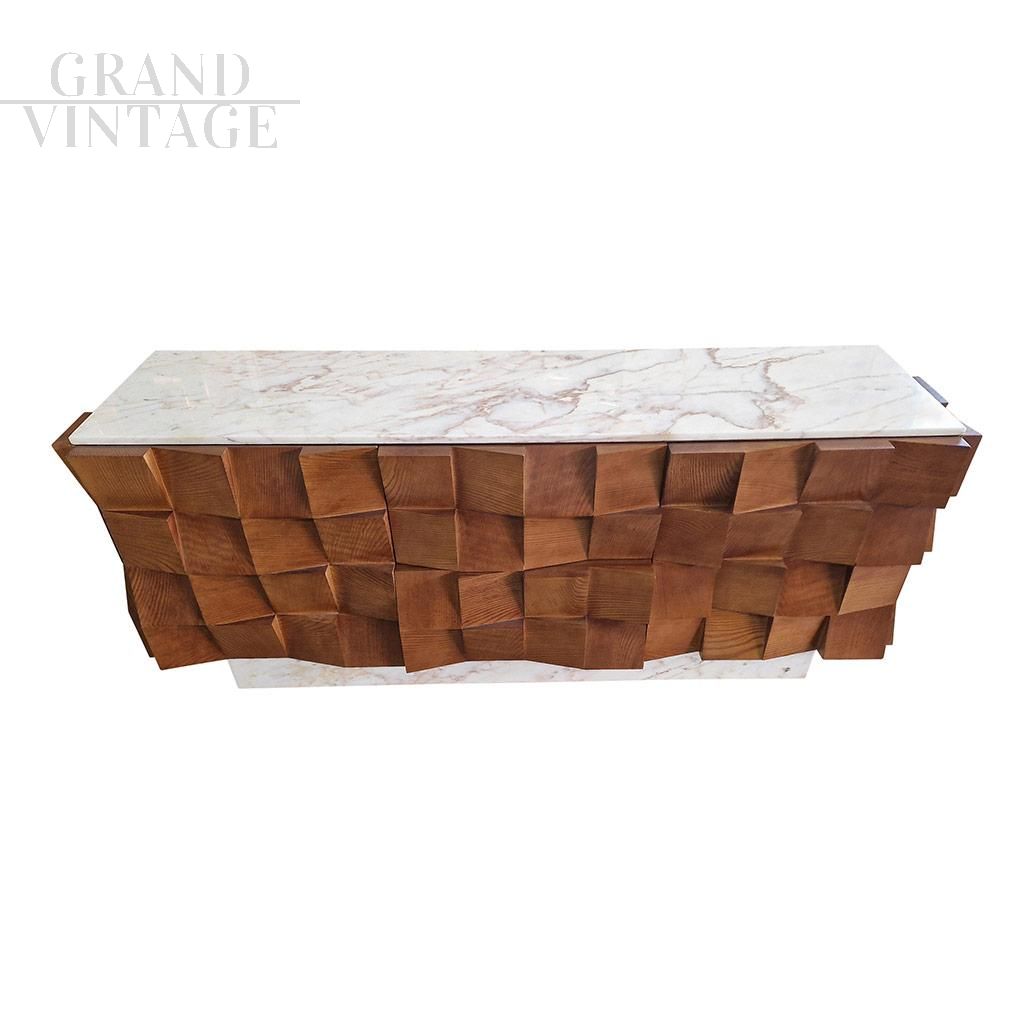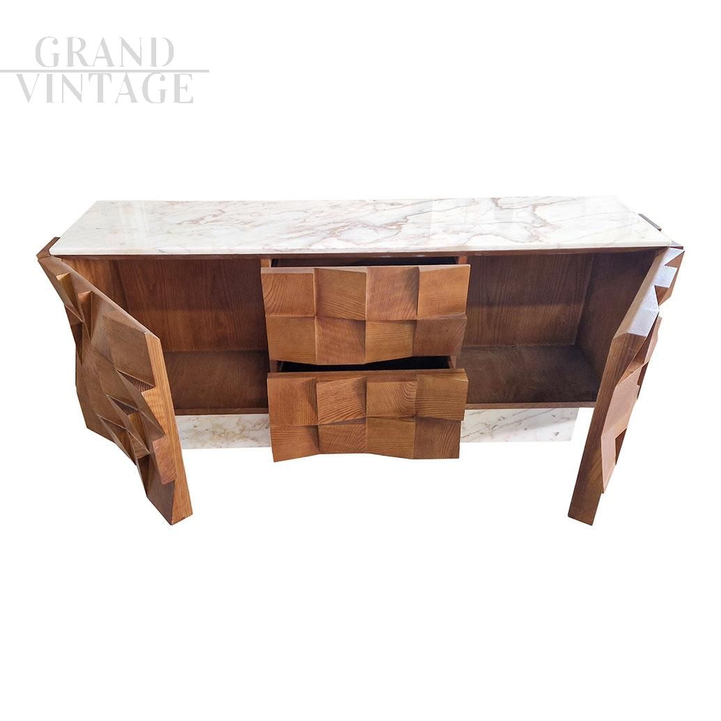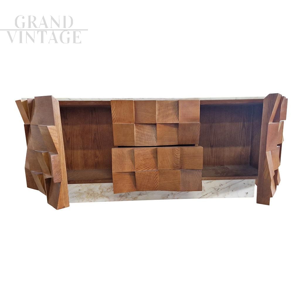 Particolare credenza vintage italiana, composta da due ante a libro e due cassetti centrali, realizzata con struttura in legno massello di noce. Il design molto particolare della parte superiore delle ante centrali, dei frontali dei cassetti e dei fianchi è caratterizzato da numerosi riquadri di legno combinati insieme a diverse angolazioni per mostrare la consistenza e la profondità spaziale. La parte superiore della credenza e la base rettangolare che la sostiene sono rivestiti di marmo Bianco Carrara. Realizzata in Italia tra gli anni '70 e '80.