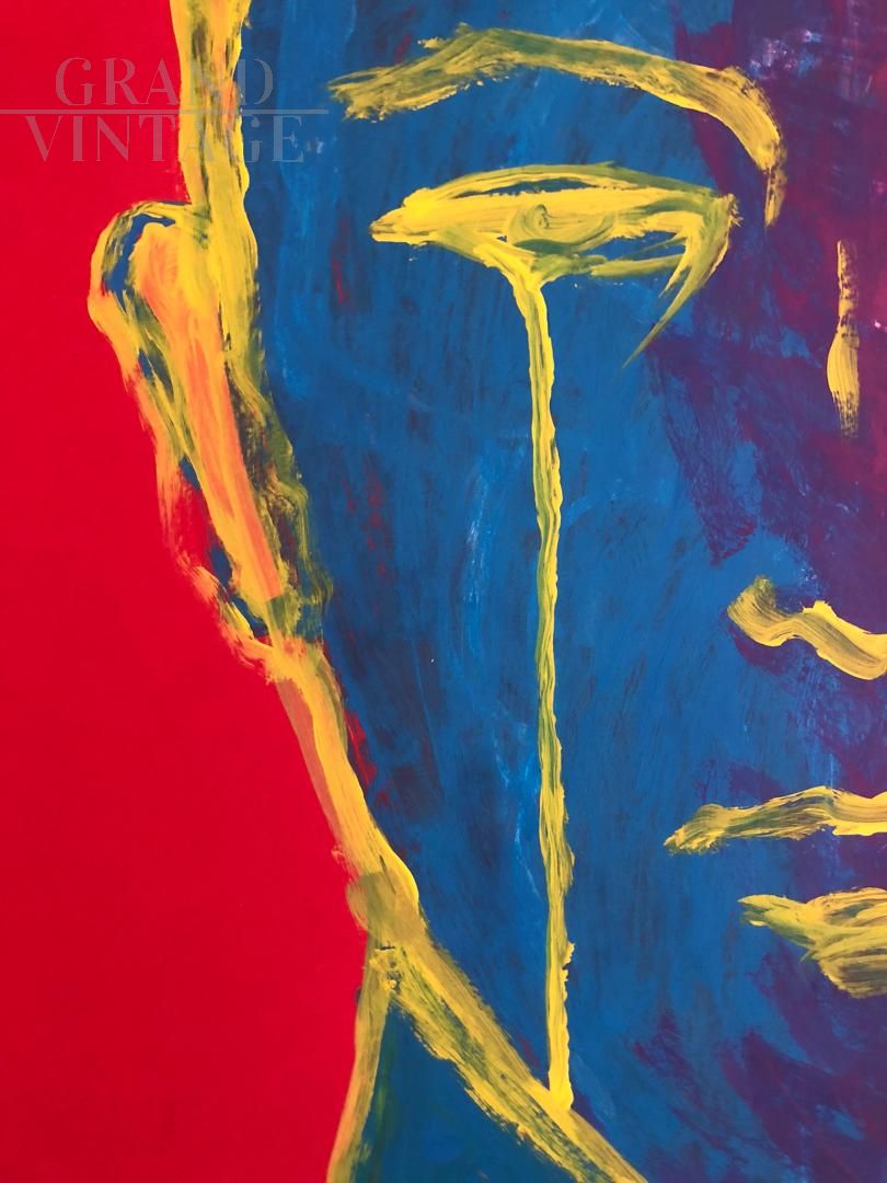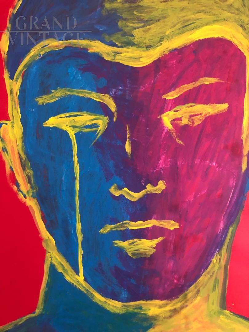Painting by Salvo Pillitteri entitled Boy crying in 1977, oil and tempera on cardboard. An artwork that comes from the artist's past experiences, emotional, sensitive but, at the same time, bright and full of colors, in a style that always refers to the 80s genre and Urban Art. originality signed by the artist, ideal for modern and urban environments.