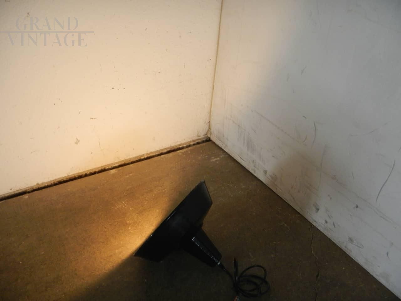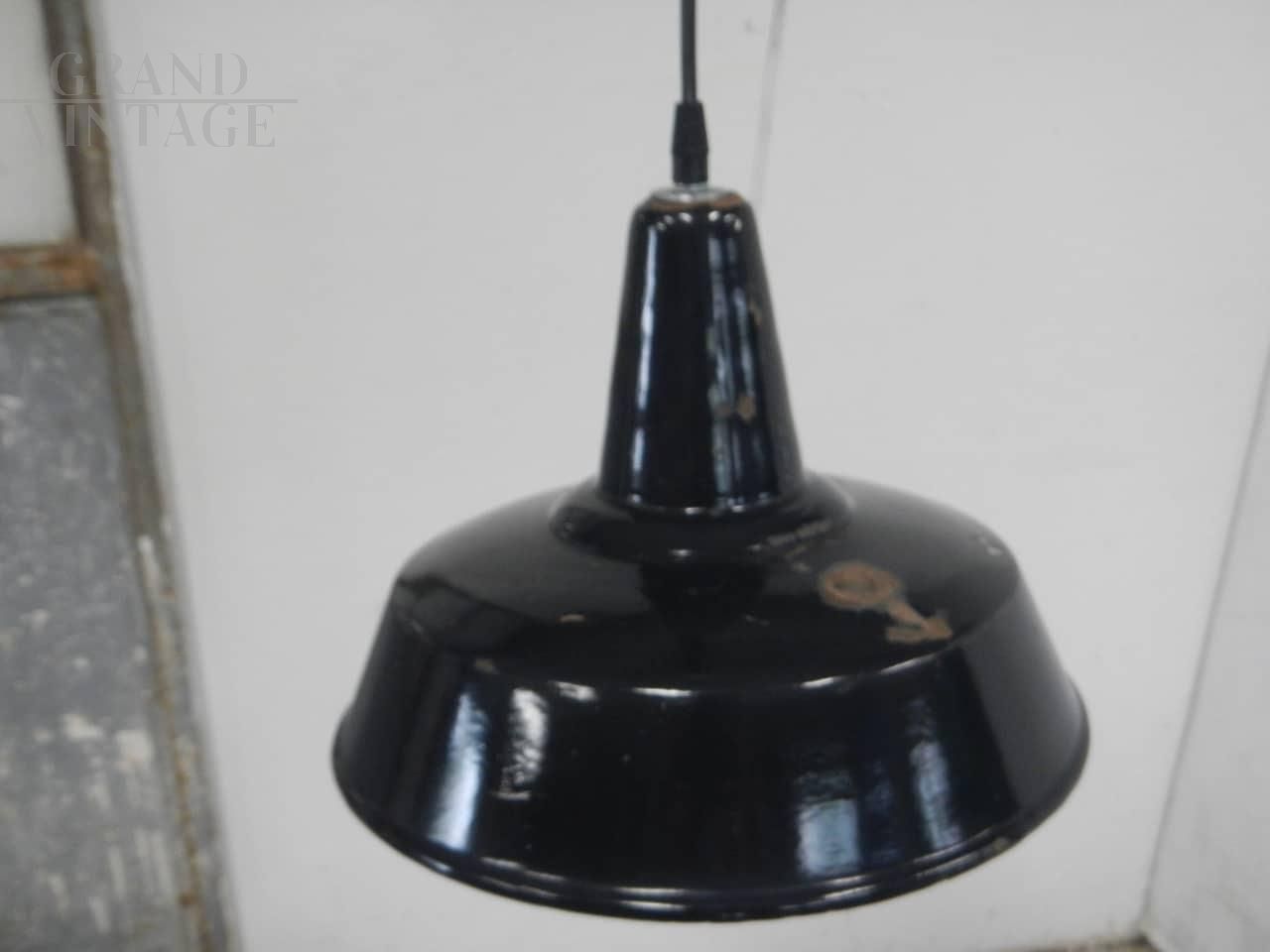 Industrial funnel pendant lamp in black metal with white interior, 1950s, electrical system rewired and working, socket for E27 bulb. In good condition with signs of use, especially on the inside. Sold without bulb.