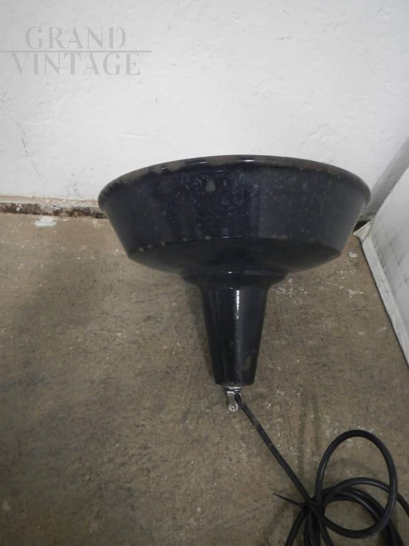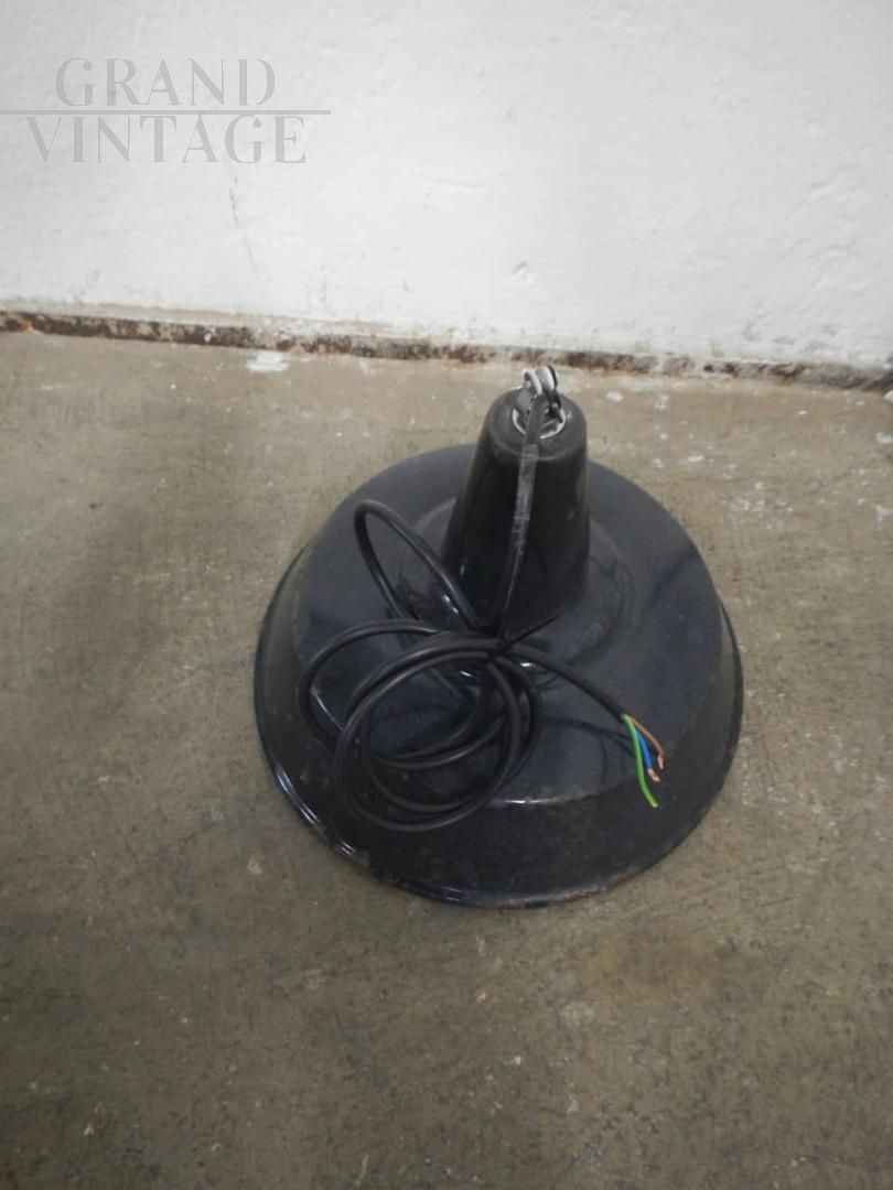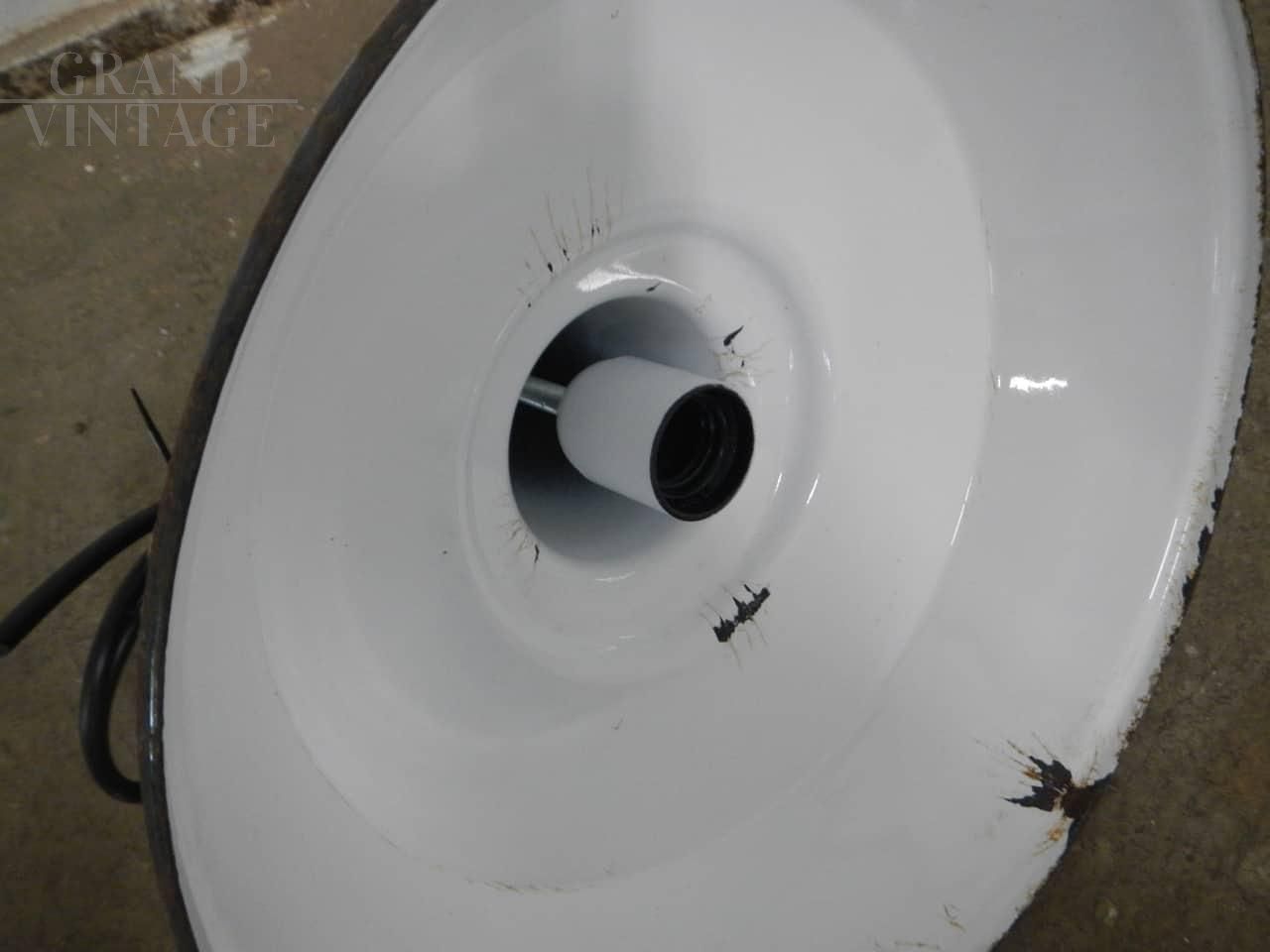 Industrial pendant lamps in black metal with white interior and ceramic hook, working electrical system with E27 bulb connection. Clearly visible signs of use, which enrich its charm.