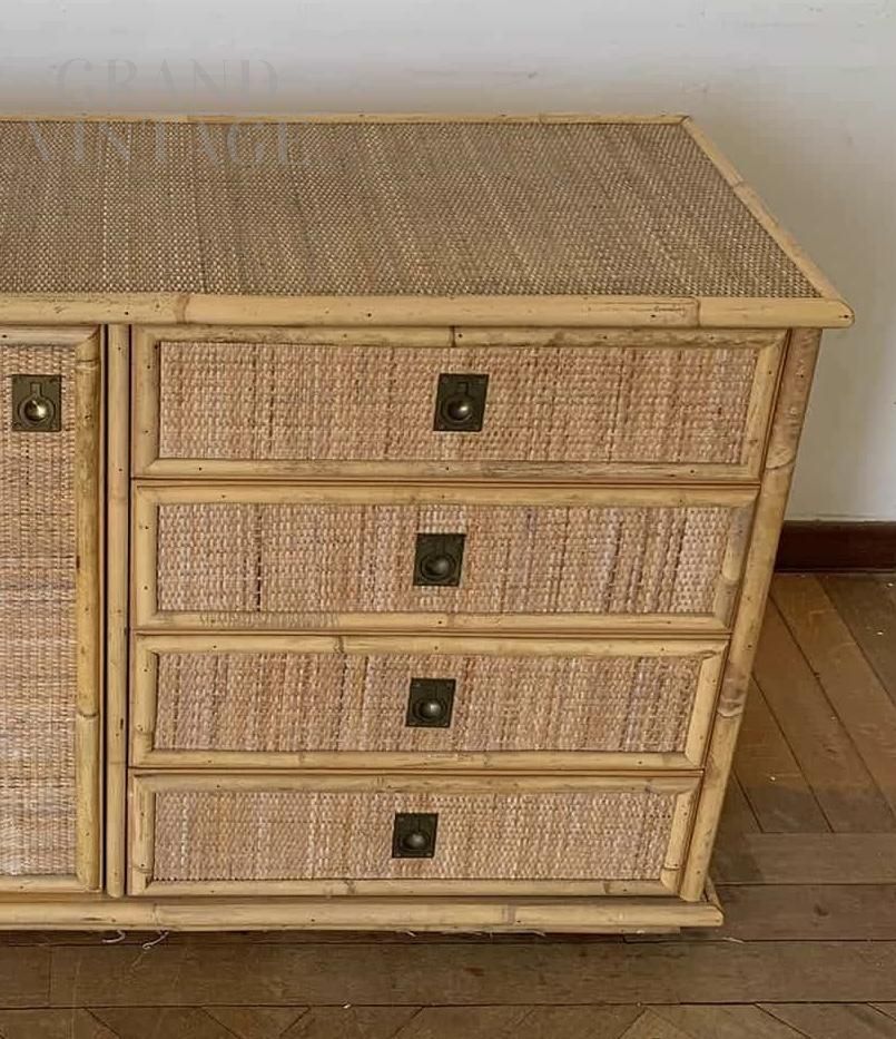 Original 1970s Dal Vera sideboard or dresser in woven wicker with a wood and bamboo frame and brass handles. The piece features a door with an internal shelf and a side chest of drawers with four drawers. It bears the manufacturer's mark and is in excellent vintage condition. The handles show some signs of oxidation consistent with the age of the piece. Finally, its compact size makes the sideboard particularly suitable for versatile use in a bedroom, a bright entryway, or a dining room.