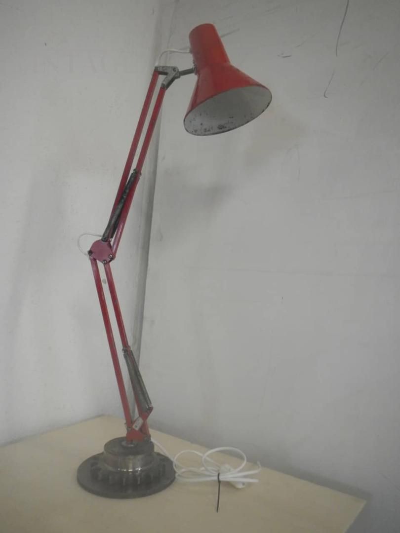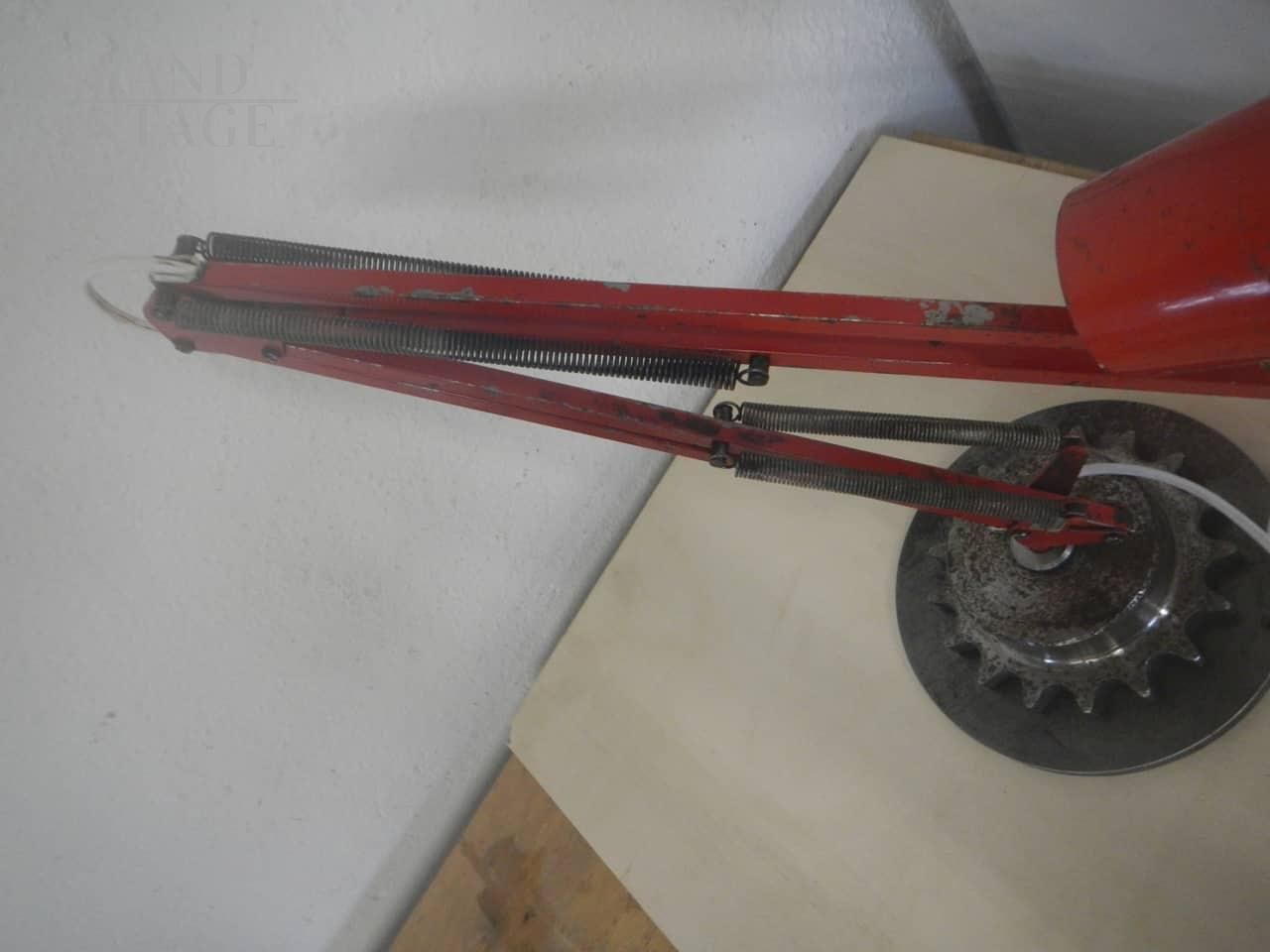 Industrial table or desk lamp in red and white metal produced by LB Denmark, a metal gear support has been applied to the base. Adjustable in various heights, works with switch. Bell diameter 18 cm. In good condition, with signs of use.