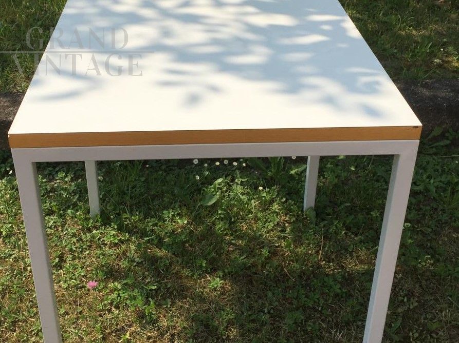 De Padova style design dining table with square top in white marine plywood measuring 70 x 70 cm and legs in white painted steel. Available in 3 pieces, joinable to form a single table with an overall length of 210 cm. In very good condition, the tables were arranged in the window of a designer shop.