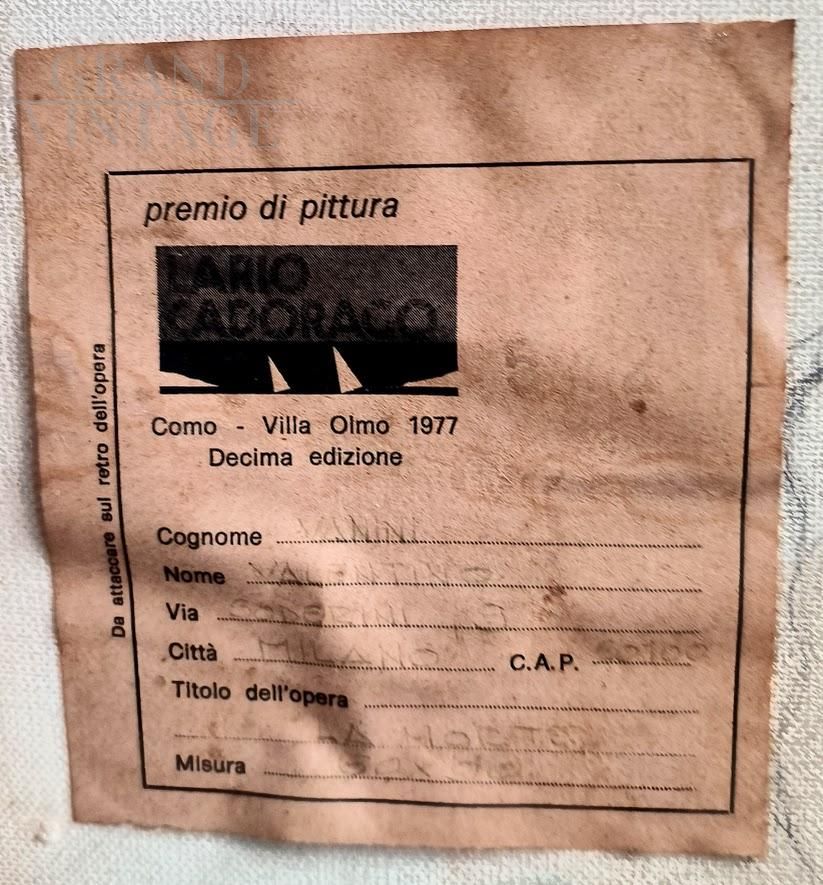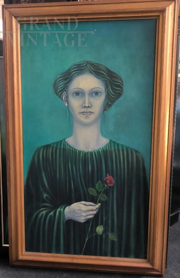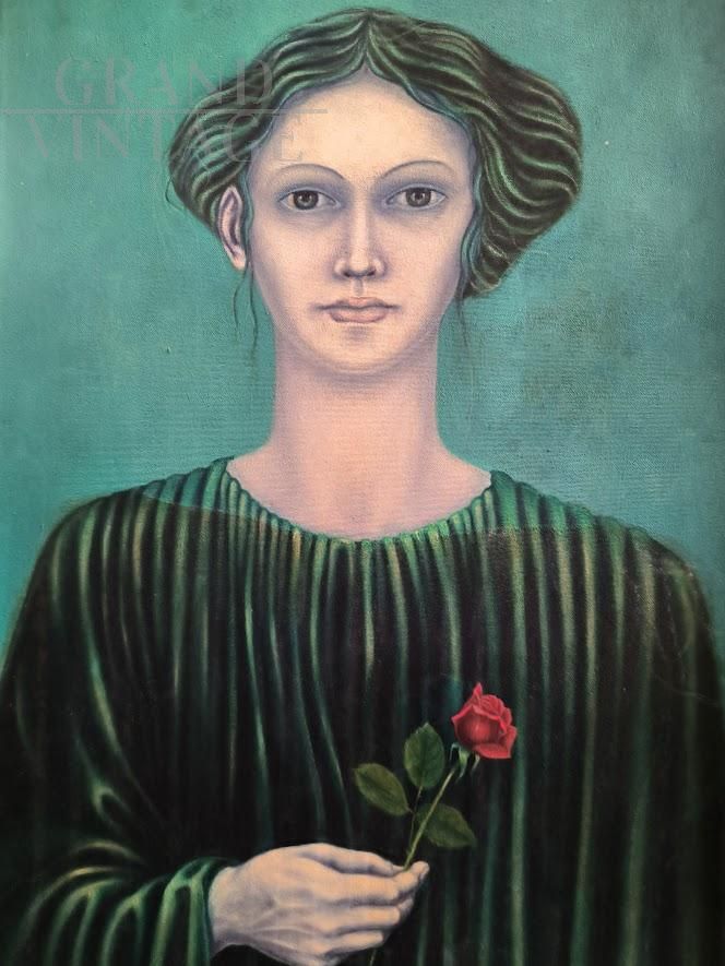 An unusual painting for collectors, this artwork by Valentino Vanini (Milan) from 1977 is titled "La Morte" - "Death" and depicts a beautiful woman with a red rose in her hand, oil on canvas 50 x 90 cm with frame 64 x 104 cm. The painting was exhibited at the Premio Lario in Villa Olmo (Como) in the 10th edition. Few artists have had the courage to represent Death.
