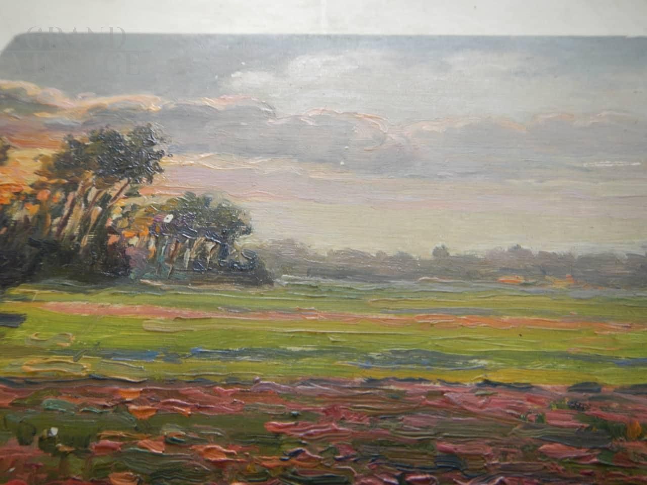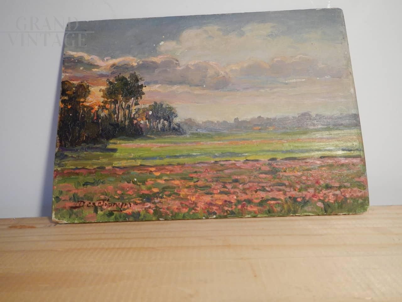 Painting by the French painter Deschamps with sunset on a beautiful spring meadow. The artwork was made in oil on panel, specifically on the lid of a box of colors that still bears the production mark, and is titled and signed on the back. Datable between the end of the 19th century and the beginning of the 20th century.
