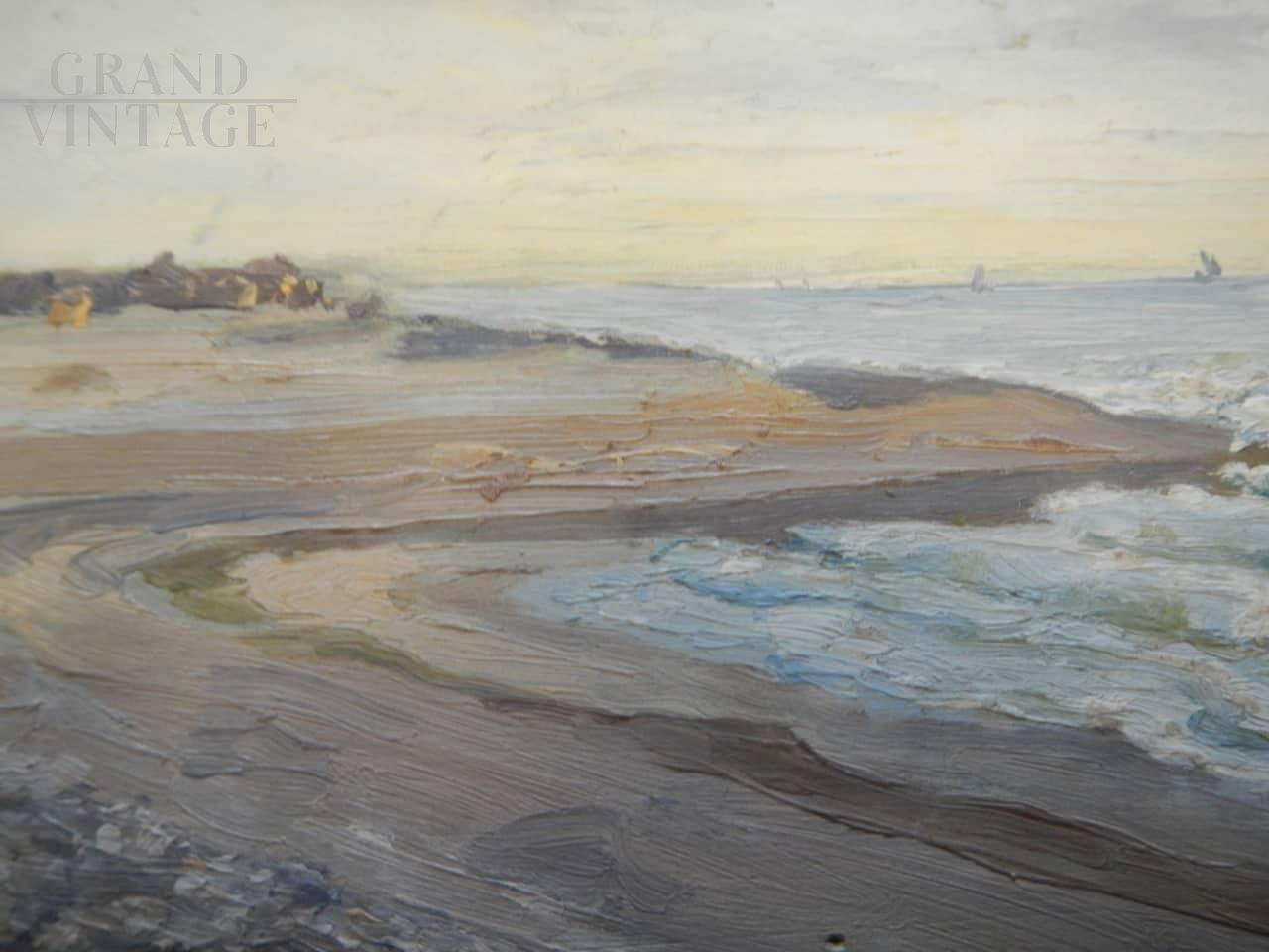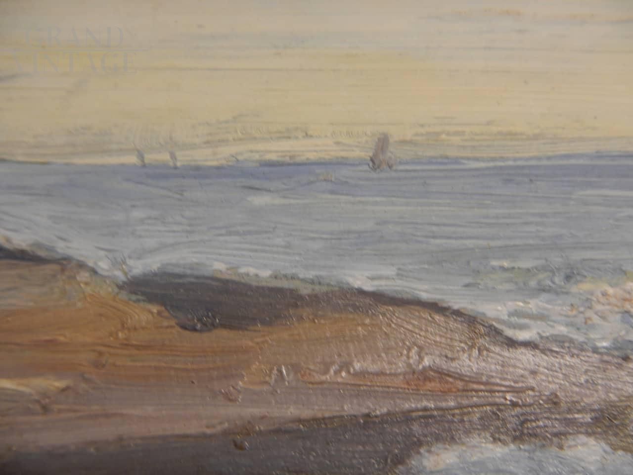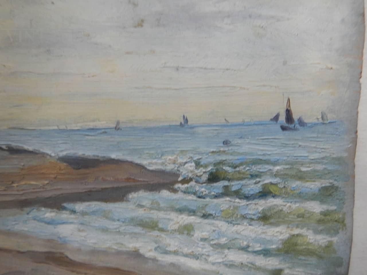 Painting by French painter Deschamps with the subject of a beach in Cayenne, in the ocean of Guyana. The artwork is made in oil on panel, specifically on the lid of a color box, between the end of the 19th century and the beginning of the 20th century. Signed on the back.