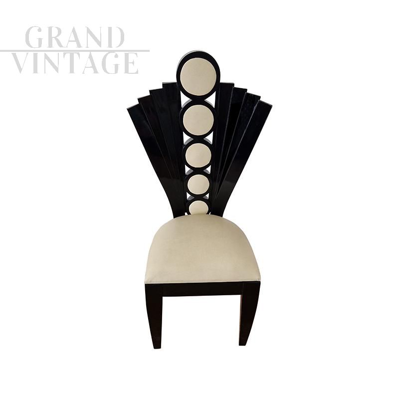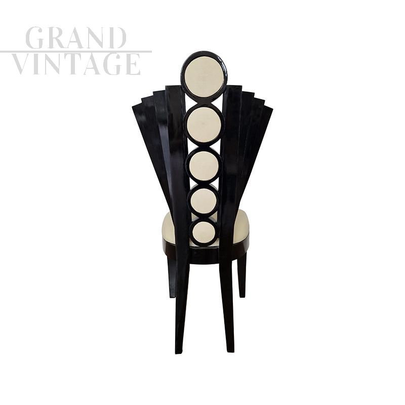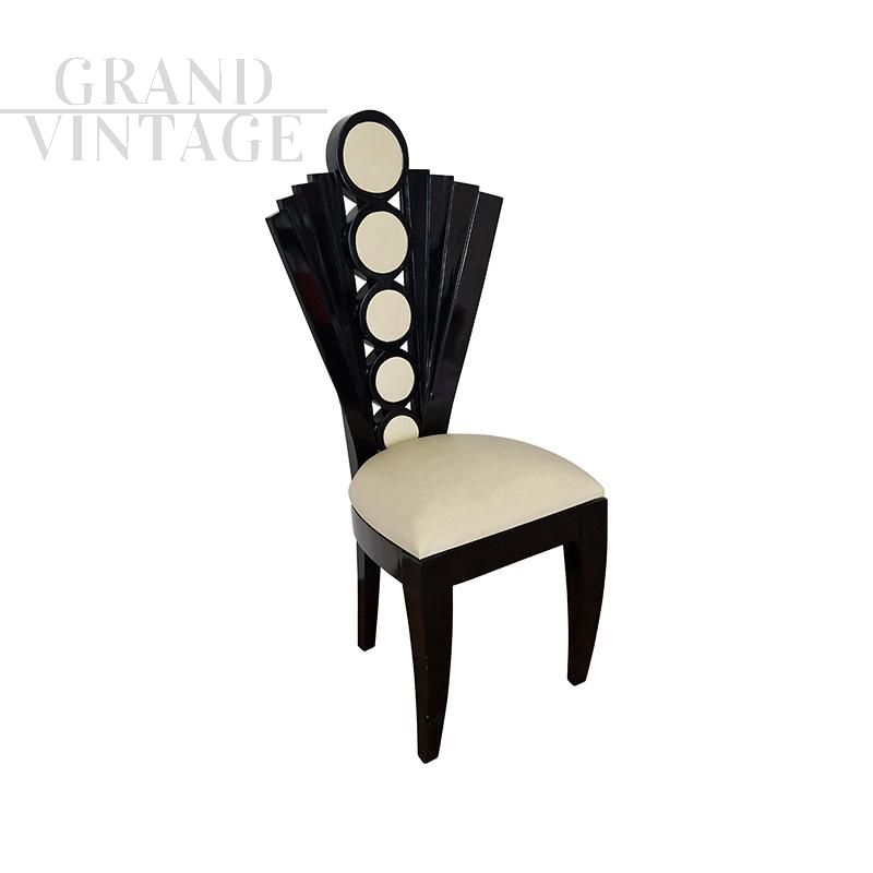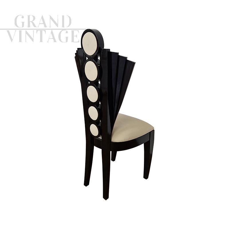 Design chair in black wood with padded seat in white leather and fan-shaped backrest with round-shaped white leather paddings.