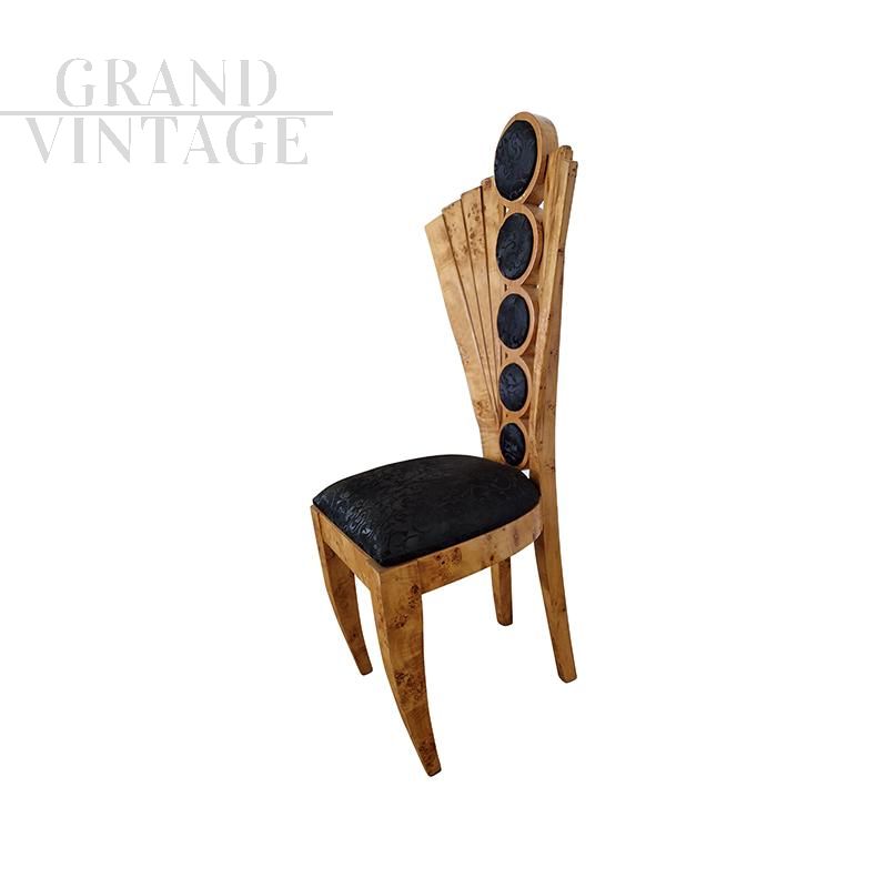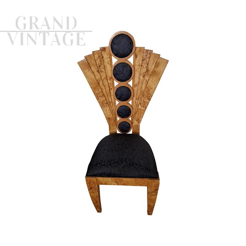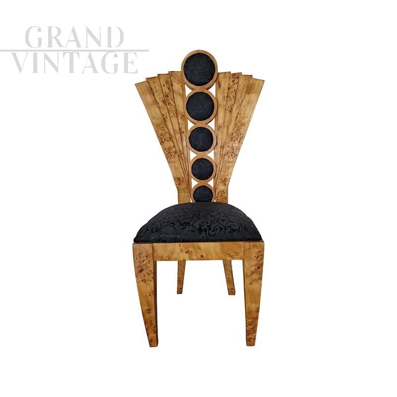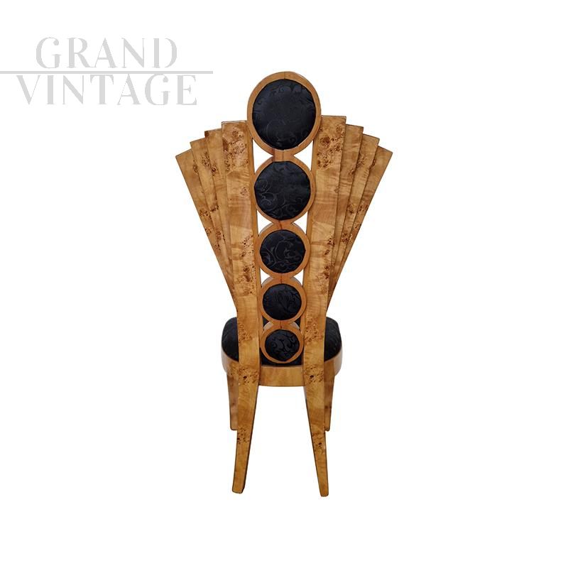 Design chair in briarwood and black leather with fan-shaped backrest