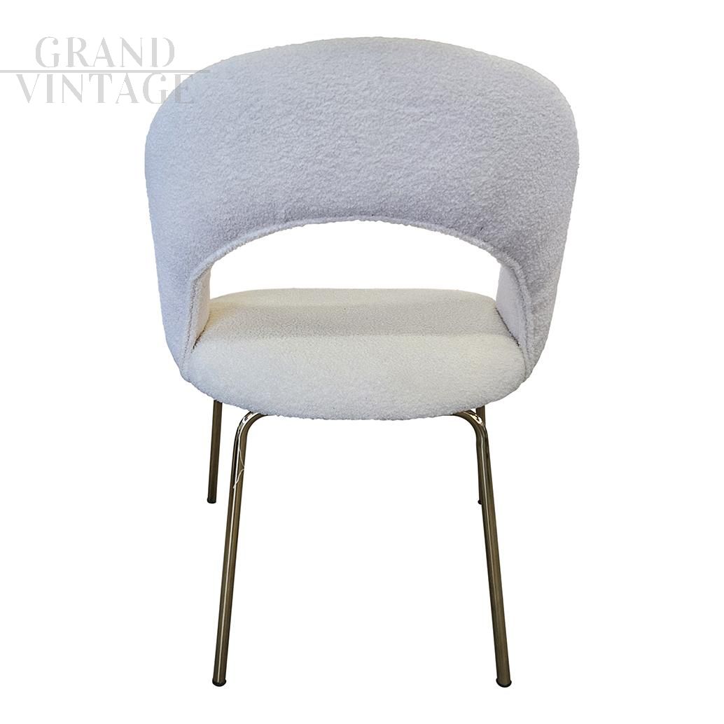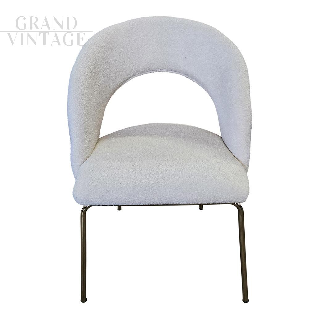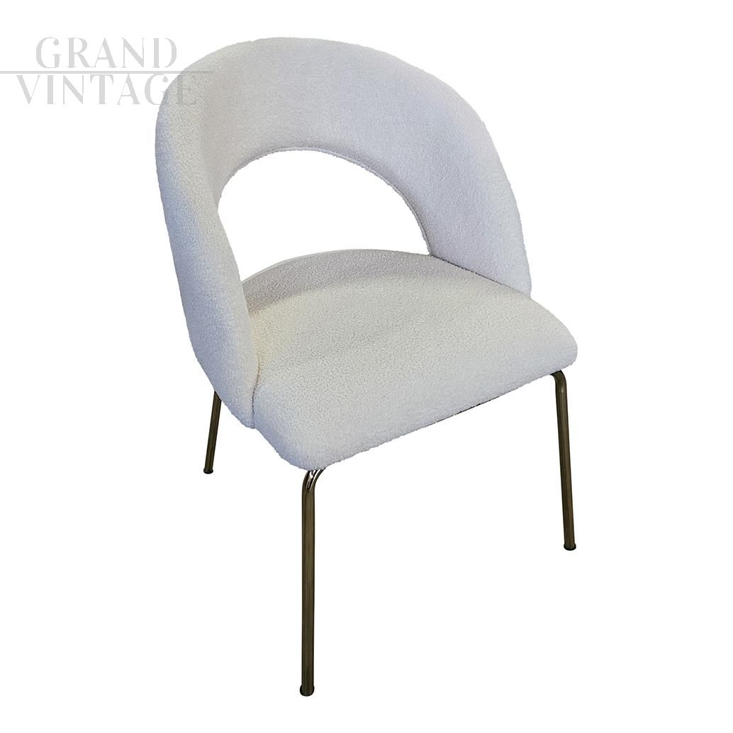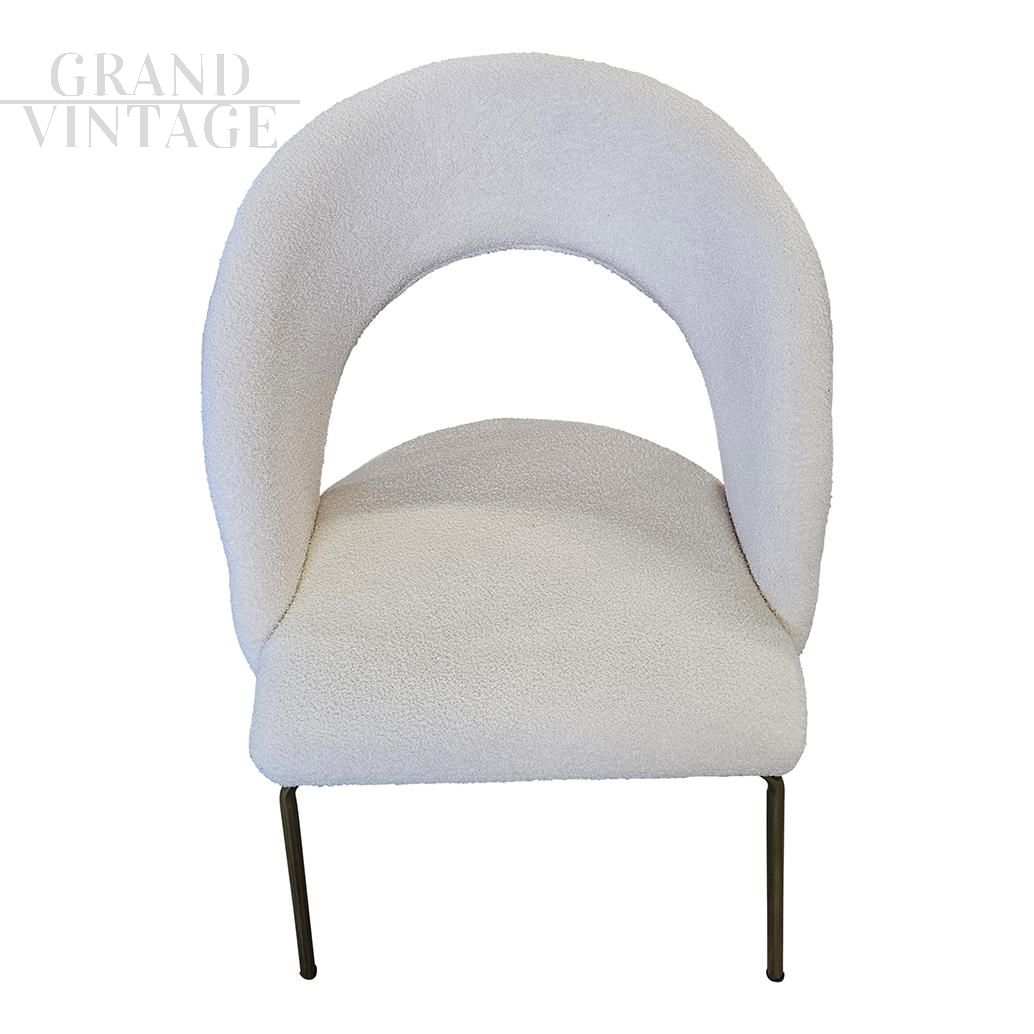 Elegant padded design armchair, with brass structure and white bouclé fabric covering.