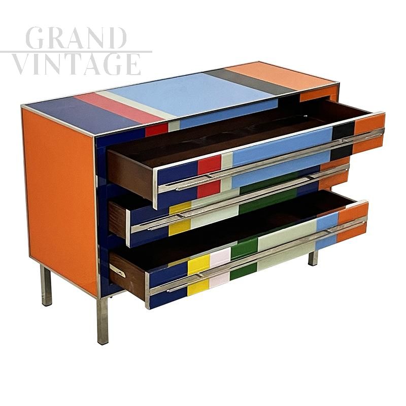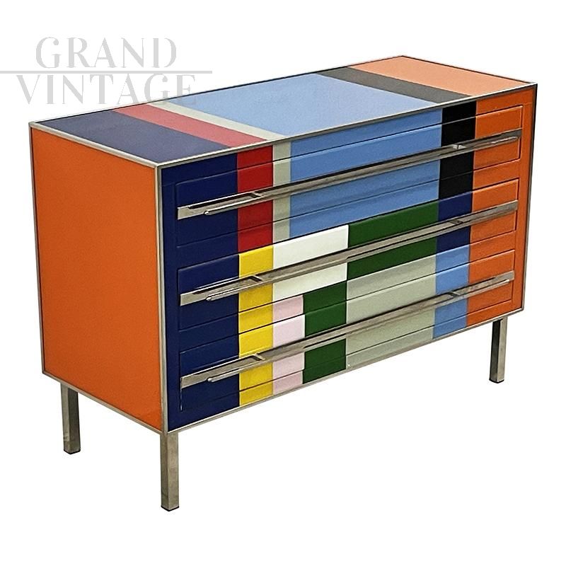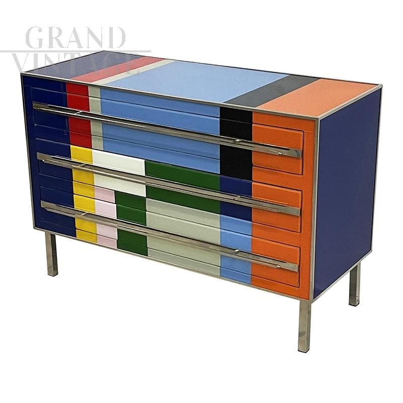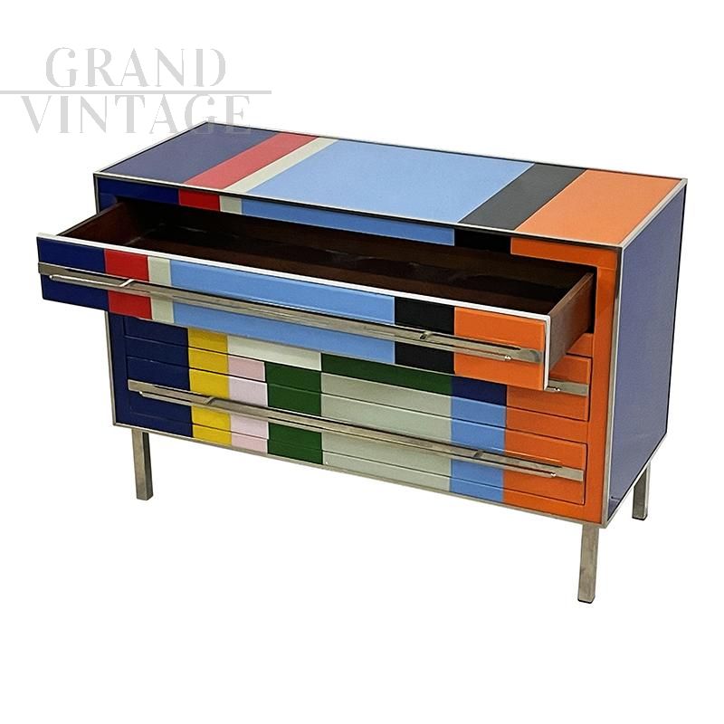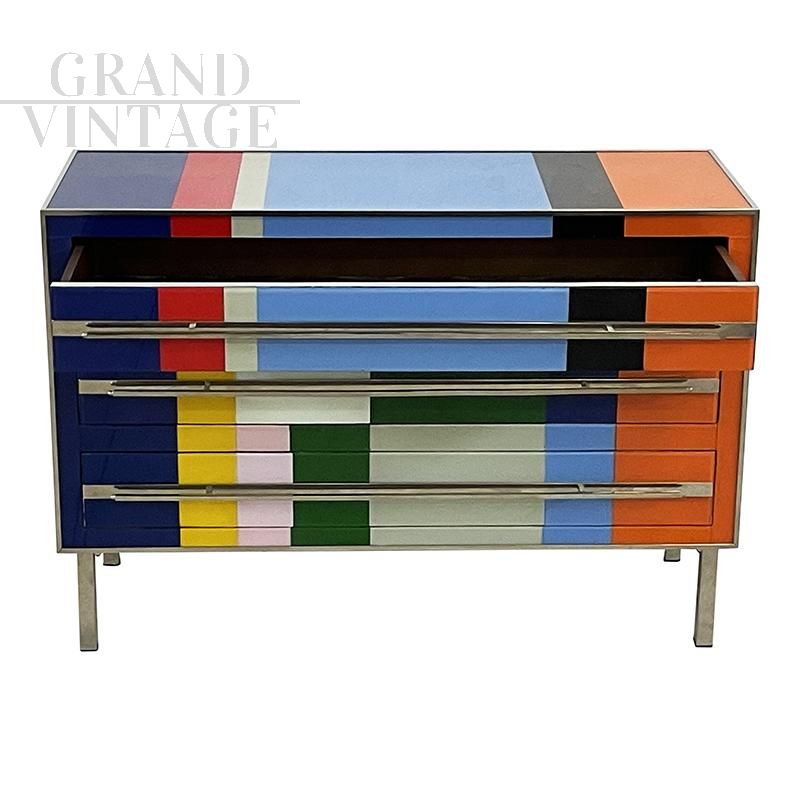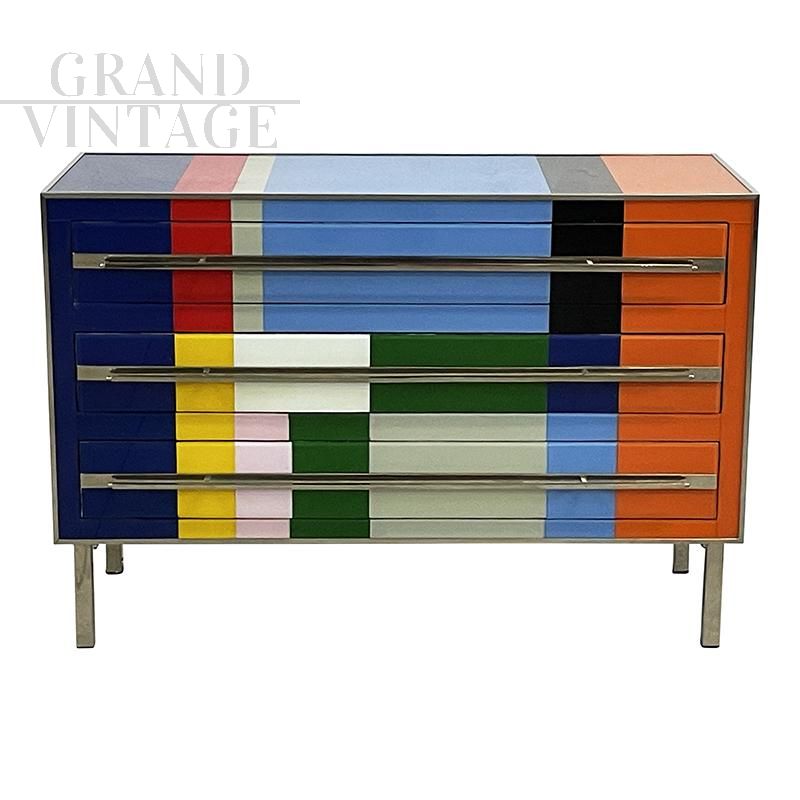 Design chest of drawers entirely handmade with wooden structure and surface finishes in multicolored Murano glass with geometric sections; profiles, handles and feet in chromed metal.