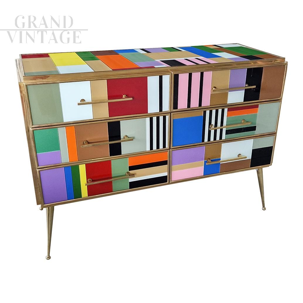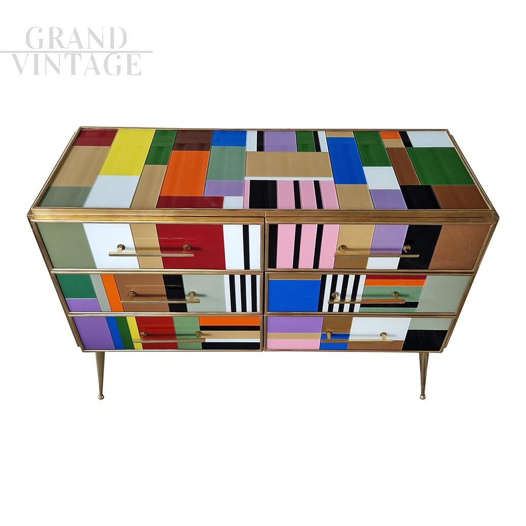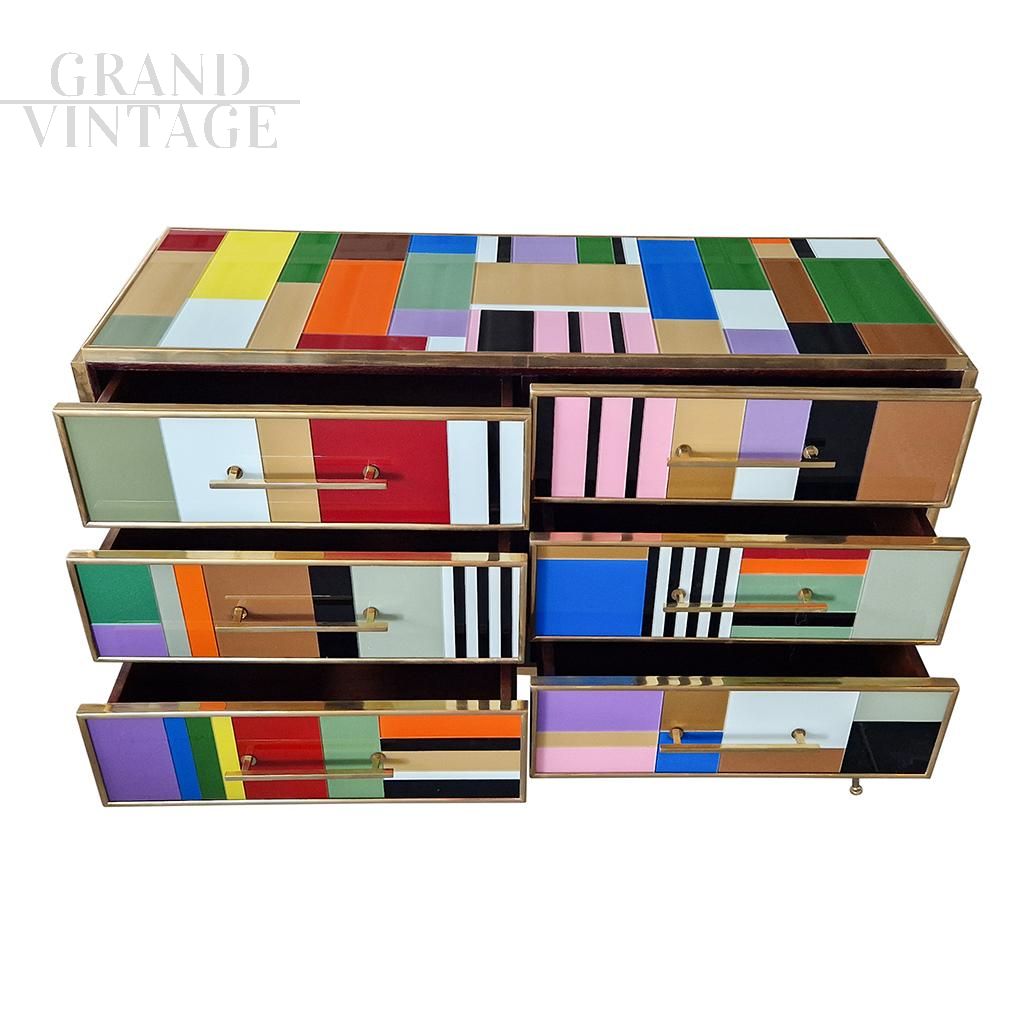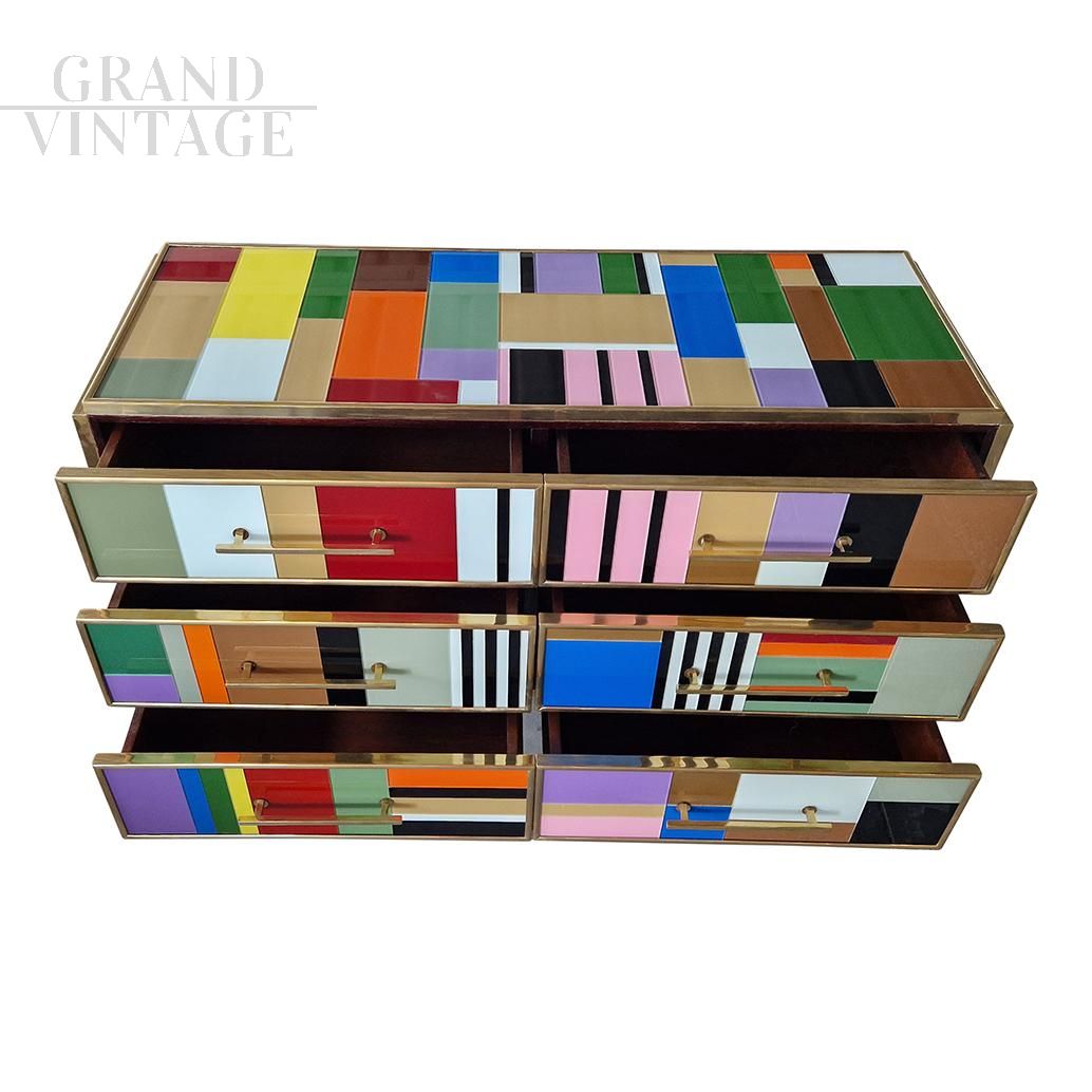 Design dresser with six drawers covered in multicolored glass