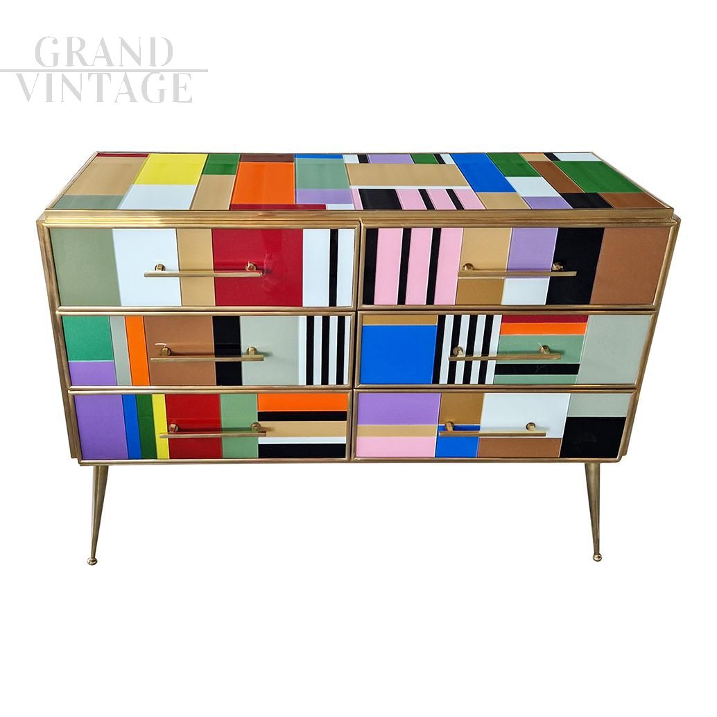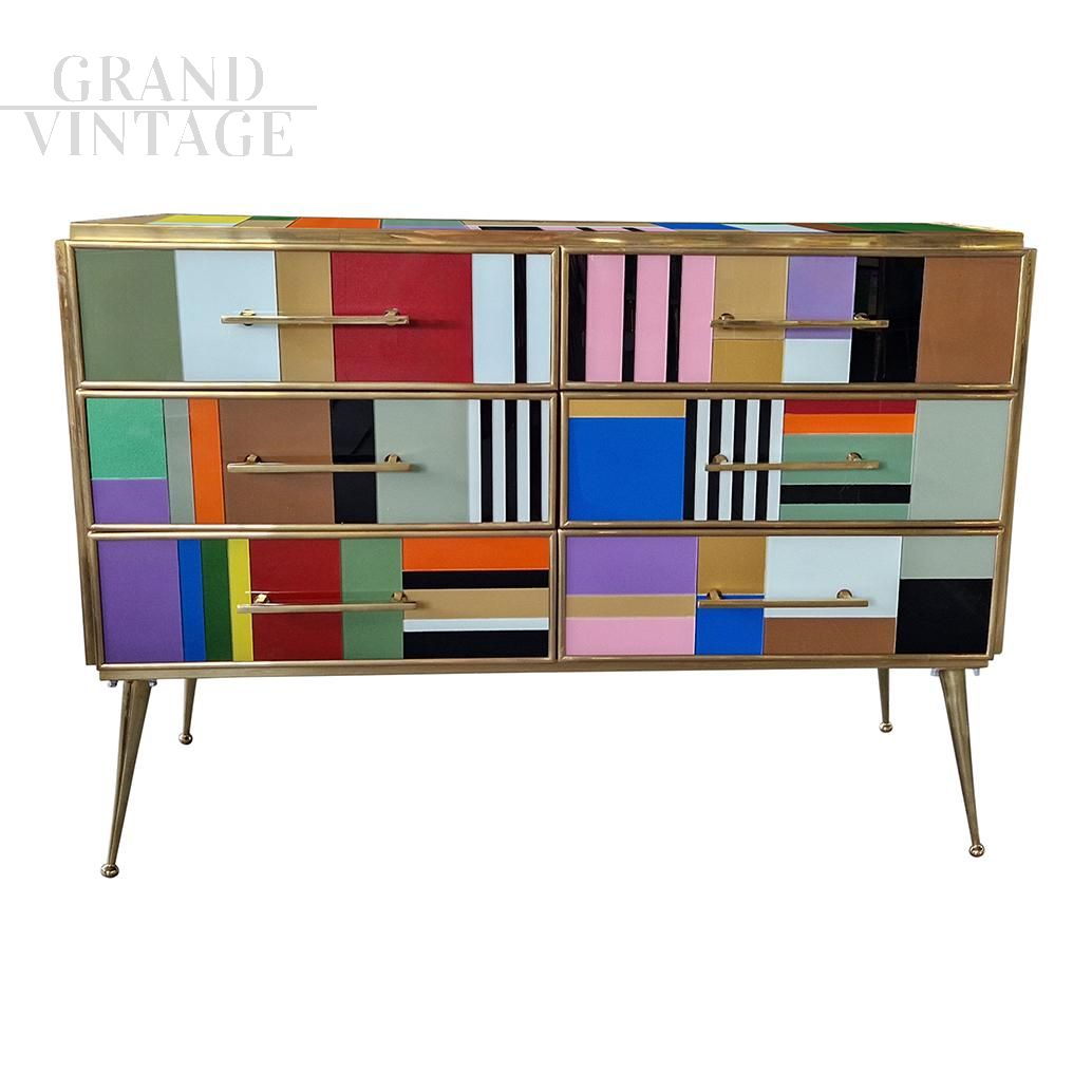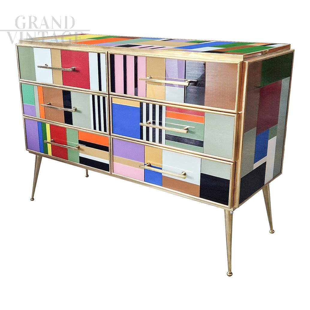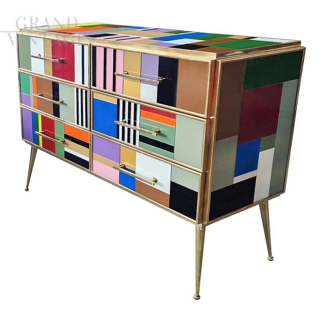 Design dresser with six drawers covered in multicolored glass