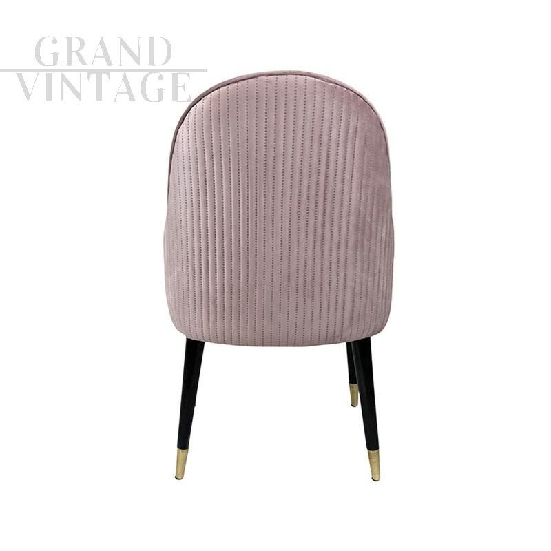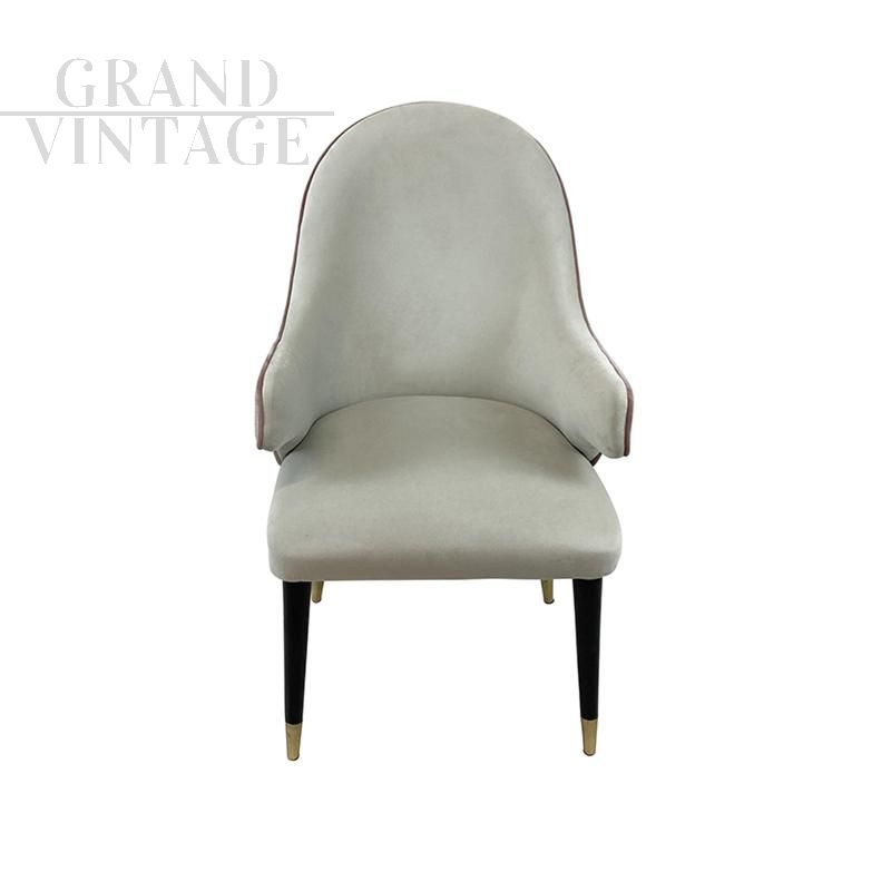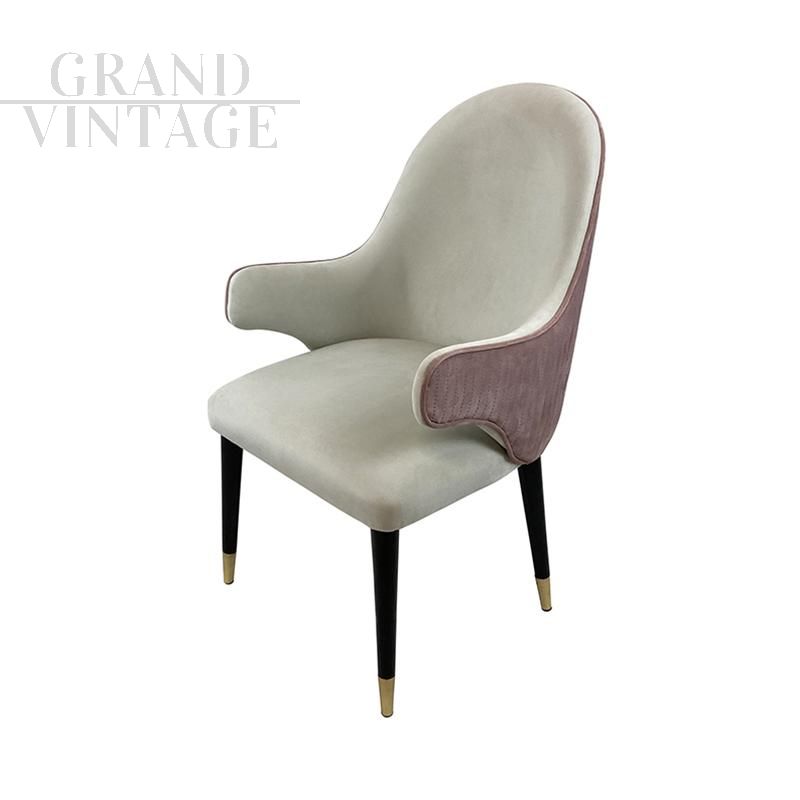 Design end chair - armchair at the head of the table in pale pink and white velvet, with black lacquered wooden feet and brass feet. Several pieces available.