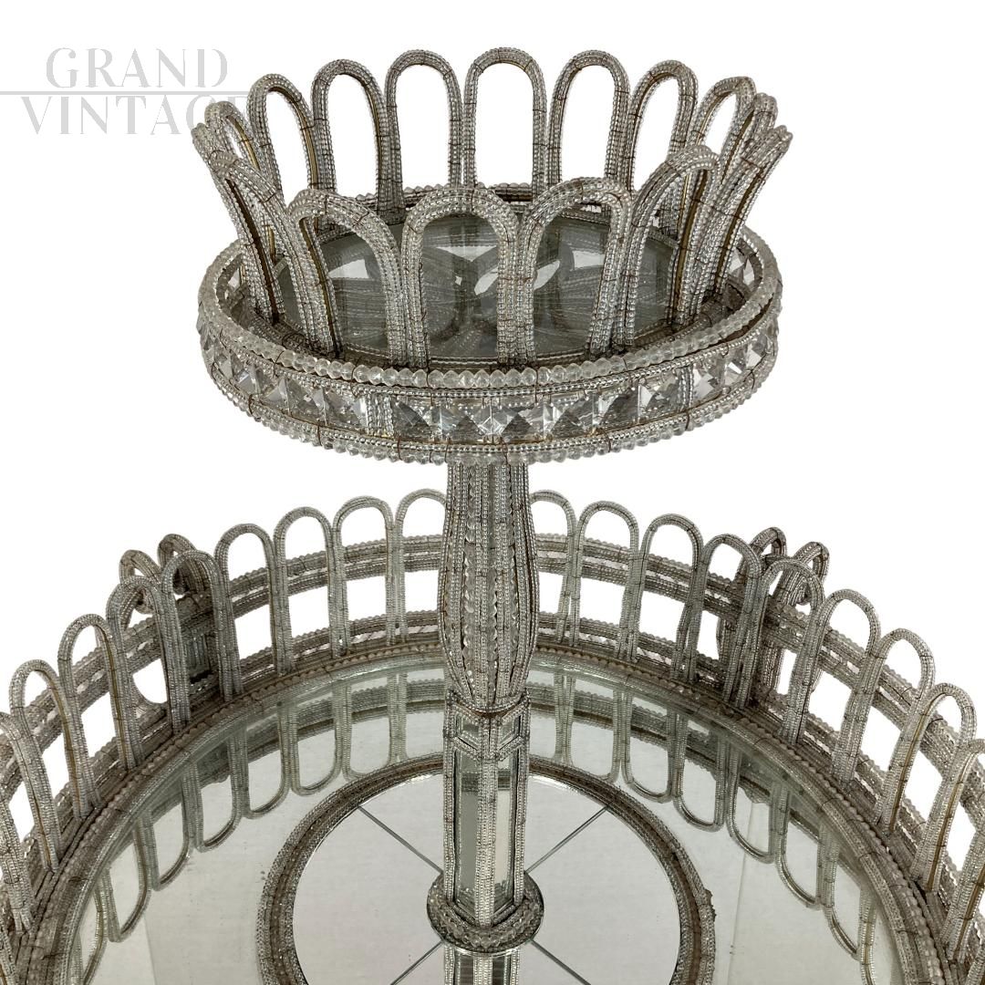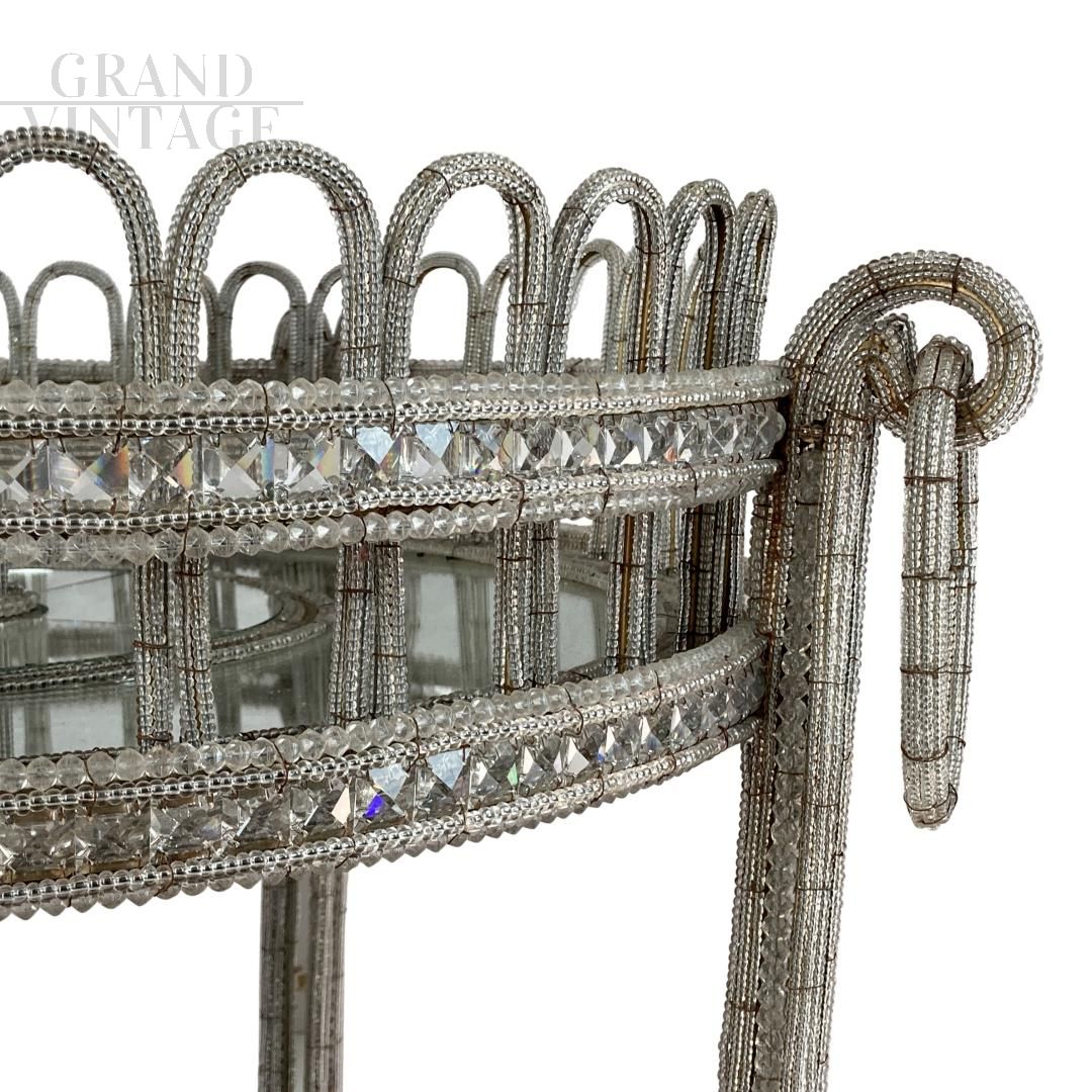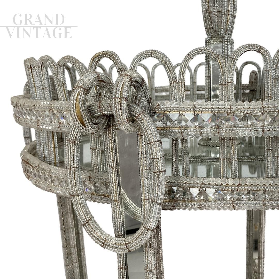 Beautiful and luxurious plant stand - floor lamp with planter, with metal structure covered with glass beads and mirrored glasses. On a square base the four slightly conical mirrored legs come together in a central basket. Above, a handsome round mirrored top is framed by a semicircular arched gallery divided by looped handles, and is topped by a baluster with gallery tableau. Under the main shelf there are two sockets for E14 type bulbs, while on the shelf below there is an E14 type bulb.