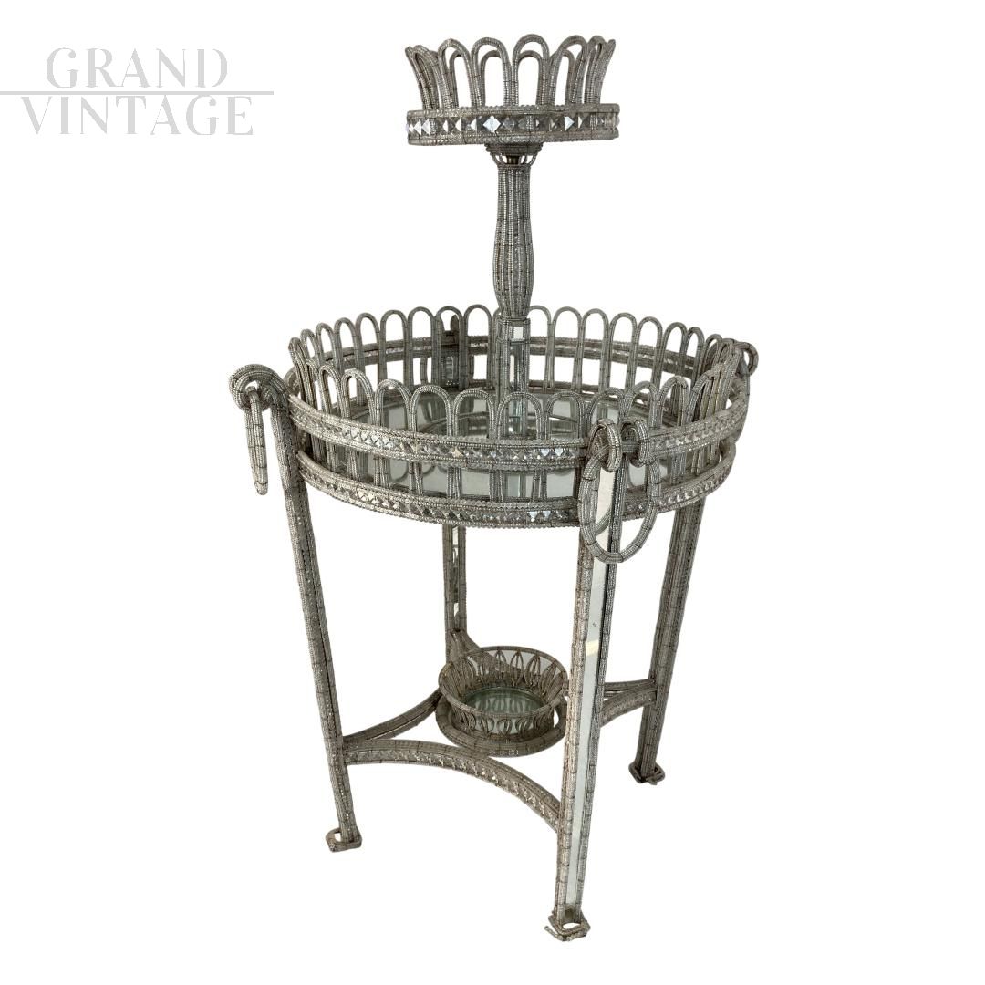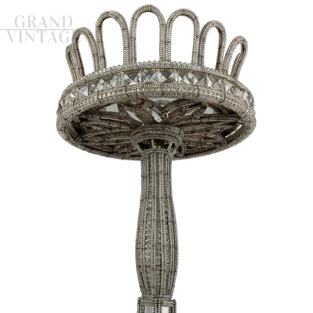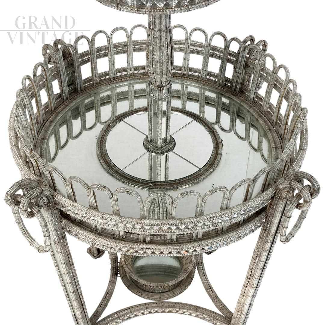 Beautiful and luxurious plant stand - floor lamp with planter, with metal structure covered with glass beads and mirrored glasses. On a square base the four slightly conical mirrored legs come together in a central basket. Above, a handsome round mirrored top is framed by a semicircular arched gallery divided by looped handles, and is topped by a baluster with gallery tableau. Under the main shelf there are two sockets for E14 type bulbs, while on the shelf below there is an E14 type bulb.