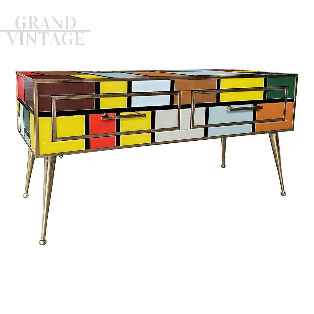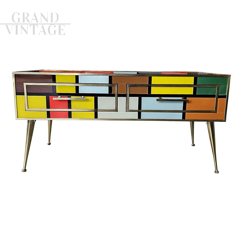 Low coffee table completely handmade, with wooden structure, covered in colored glass. Profiles, handles and feet in golden brass.