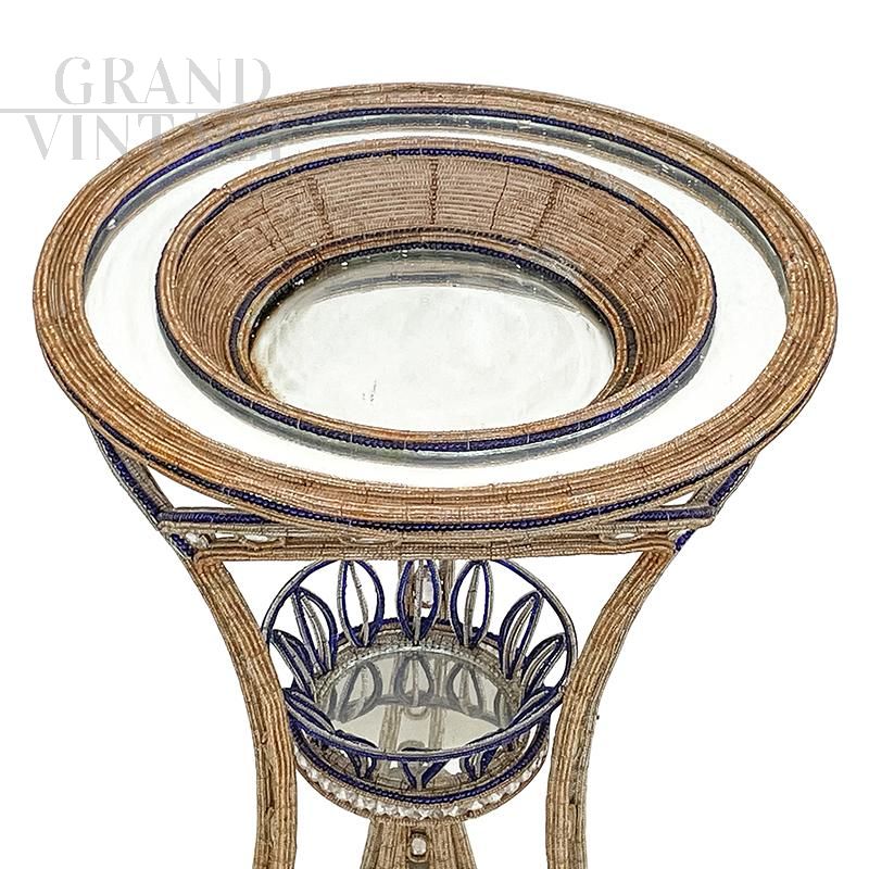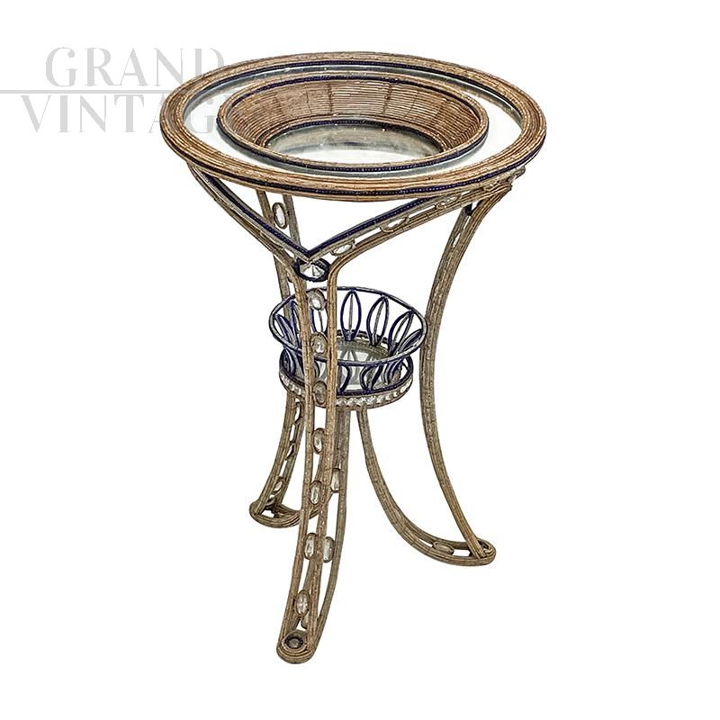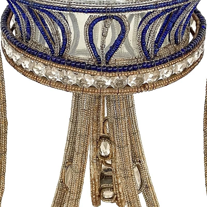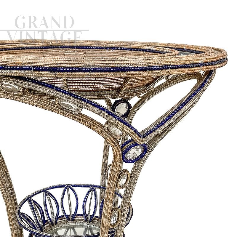 Design side table entirely made by hand, with metal structure completely covered with transparent and blue Murano glass beads and decorative elements in cut glass; the two shelves (middle and upper) have a mirror surface finish.