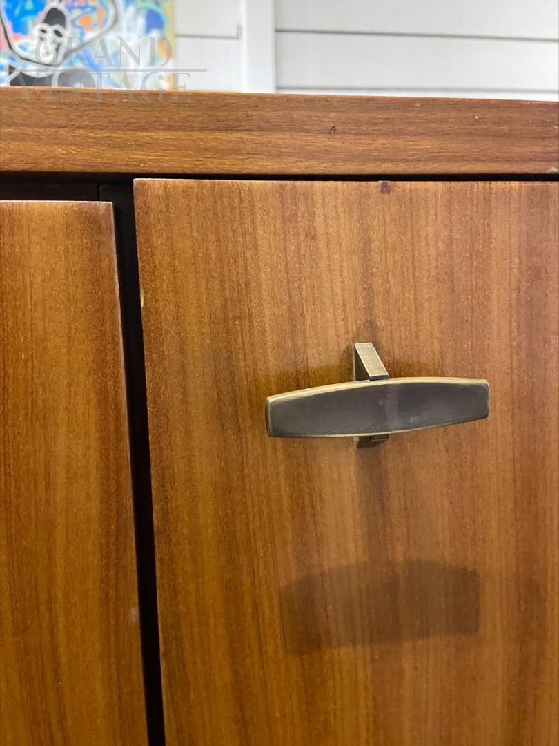 Design sideboard attributed to Marcel Gascoin, 1960s, in solid teak wood with mahogany veneer. The cabinet consists of three compartments with doors, a bar section and a drawer, and rests on a square section black lacquered metal tubular base. In excellent condition, it has small signs of use, visible in the photos.