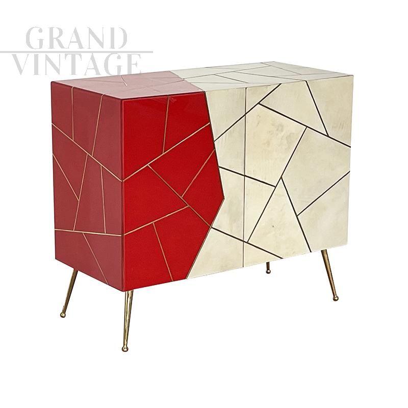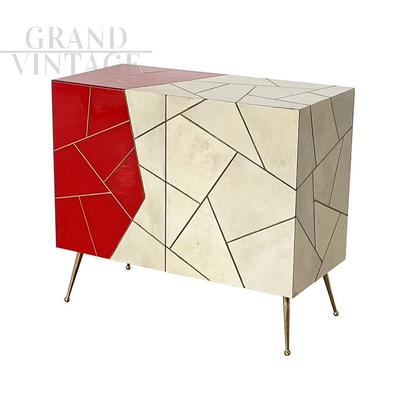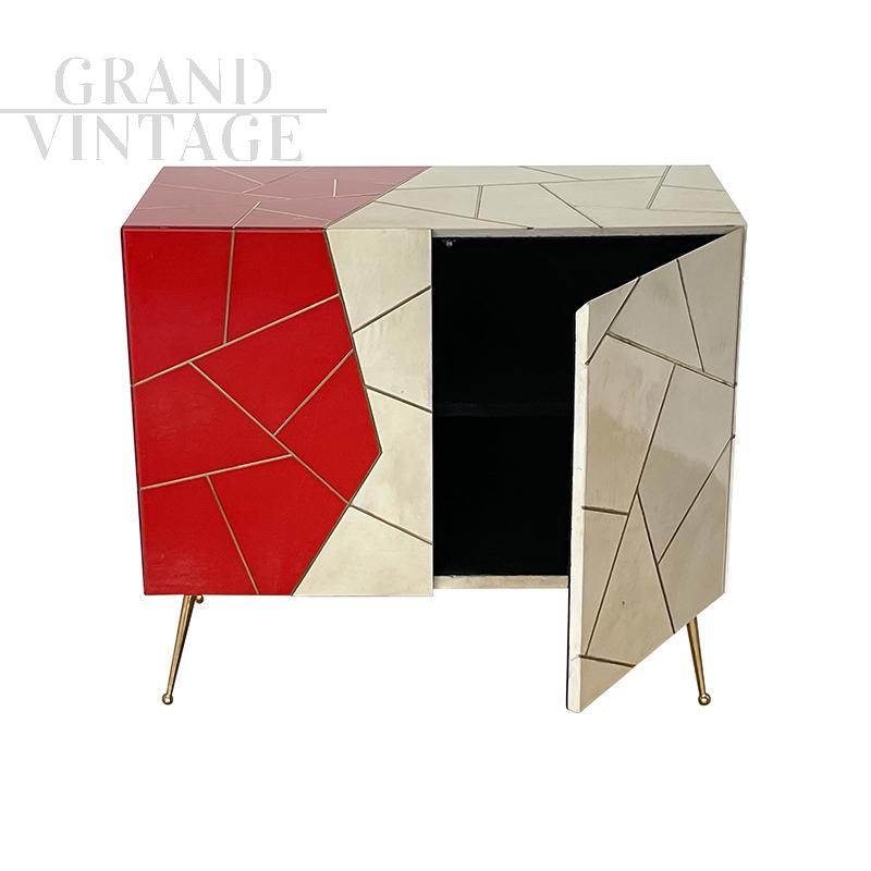 Design wooden sideboard covered in red and natural parchment colored glass tiles, characterized by two doors with push-pull opening with internal shelf, brass profiles and feet.