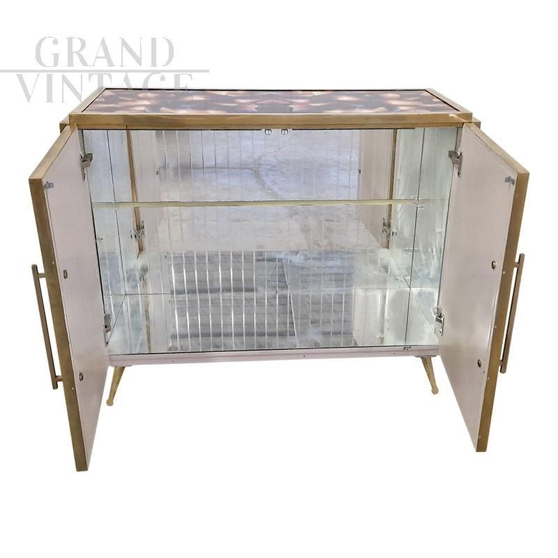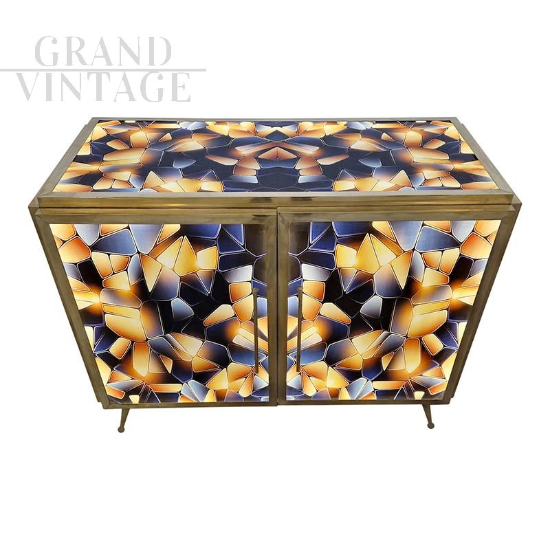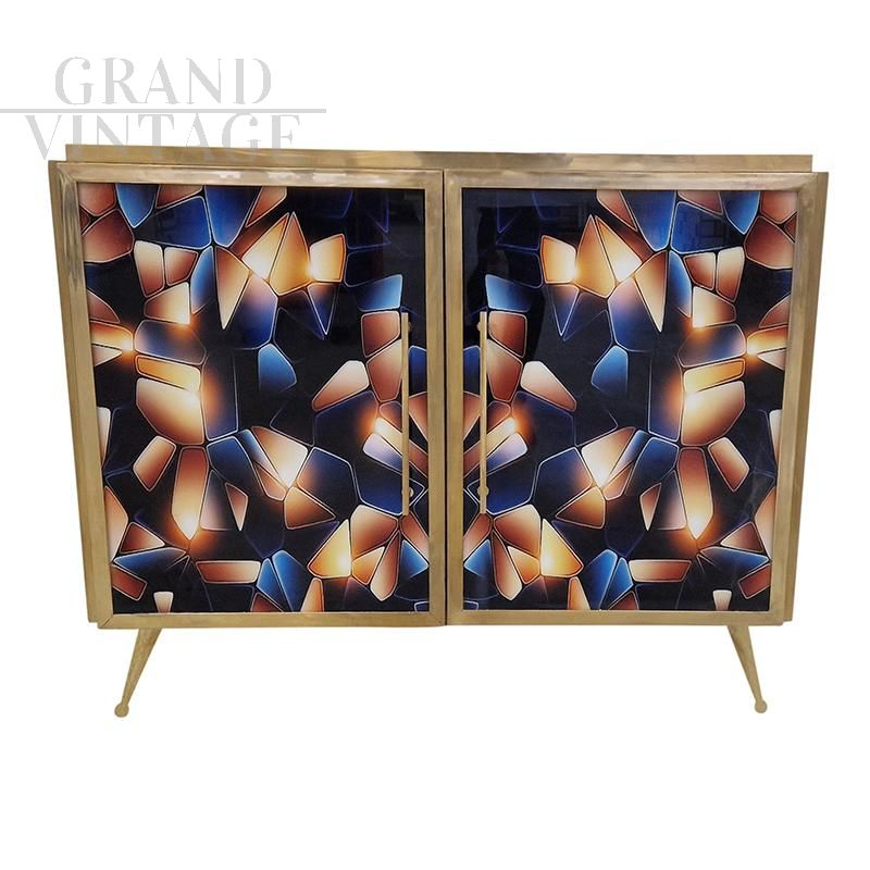 Sideboard in multicolored artistic glass with two doors and internal glass shelf, entirely handmade, wooden structure covered with printed glass in shades of blue, brown and gold, handles, profiles and feet in golden brass. Mirrored and illuminated interior. The structure lights up with graduated light with a special remote control.