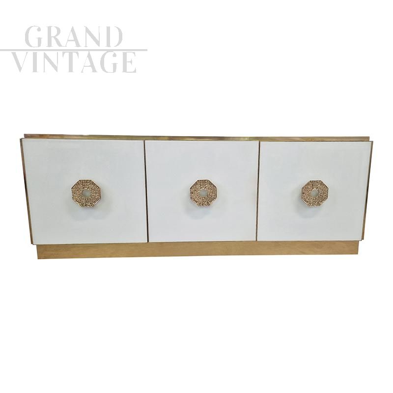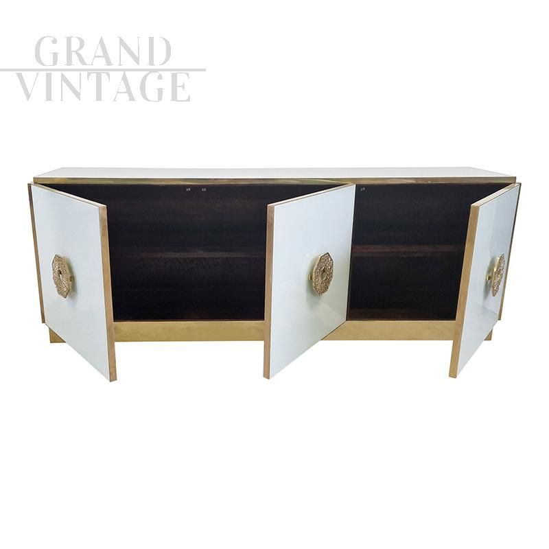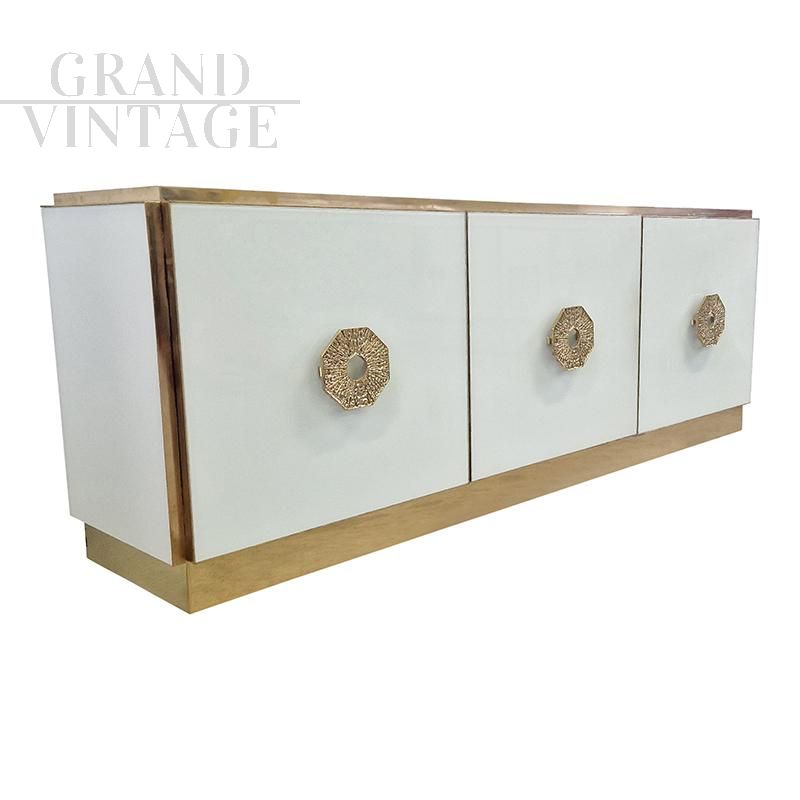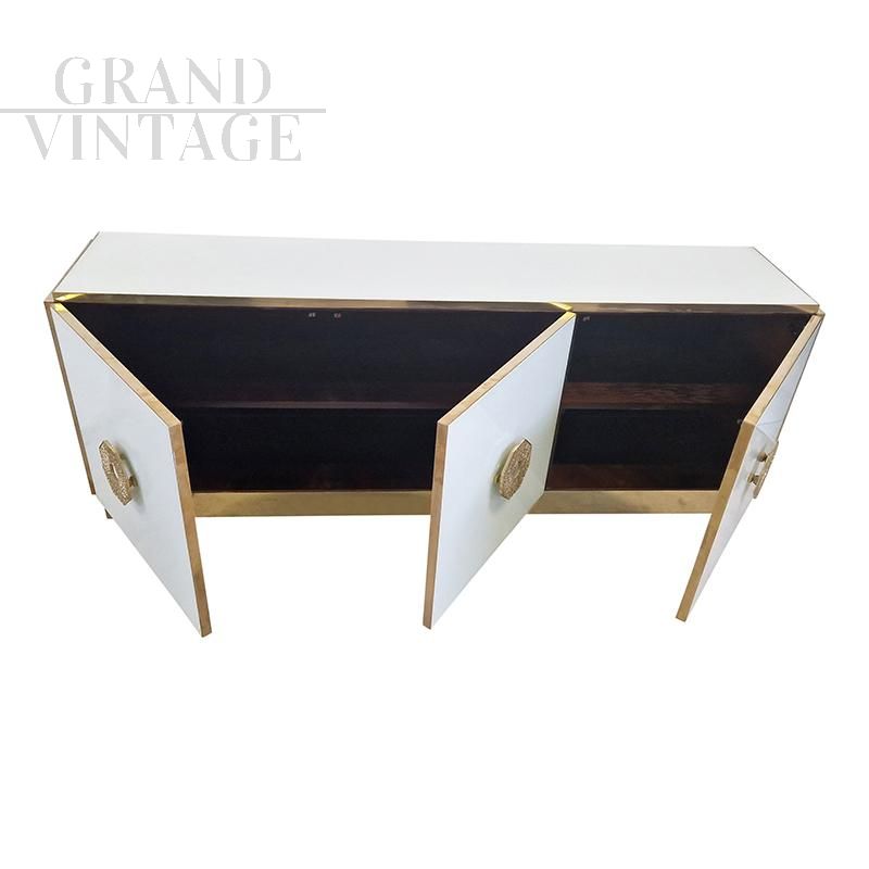 Sideboard with two compartments closed by three doors, entirely handmade, with wooden structure covered in white Murano glass. Profiles, handles and plinth are in golden brass.