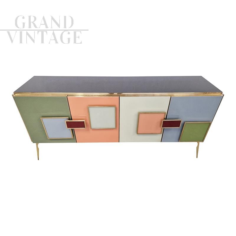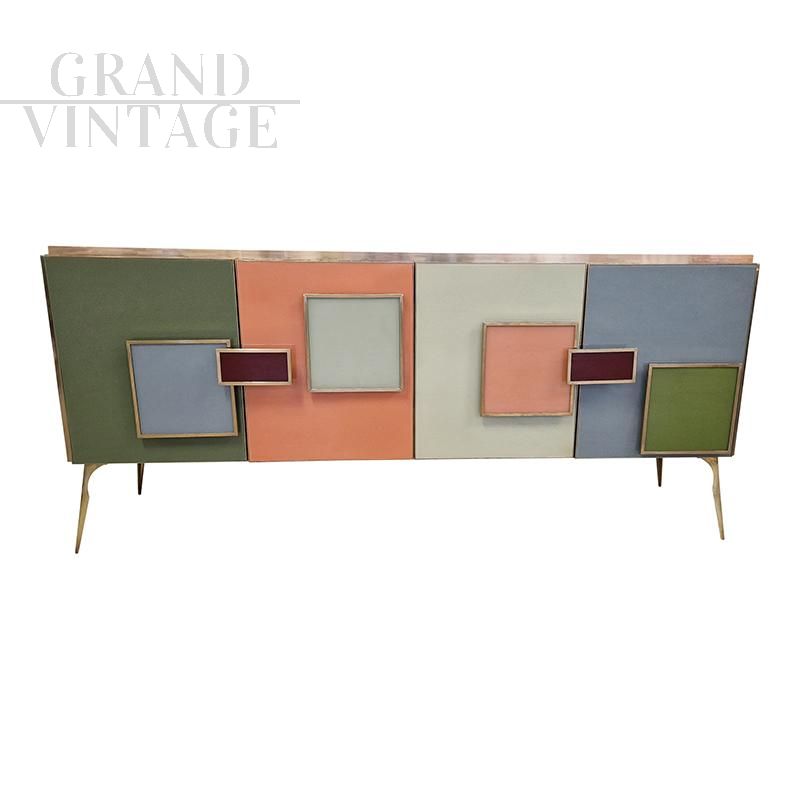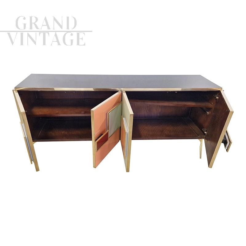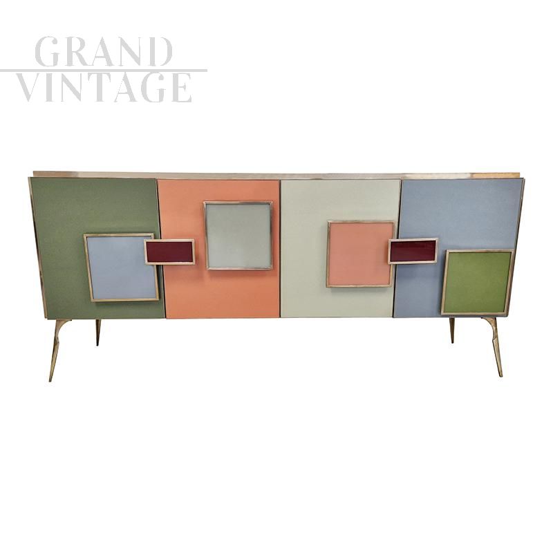 Four-door design sideboard with internal shelf, entirely handmade, with wooden structure covered in colored glass in pastel tones. Profiles and feet in golden brass. Colorful square handles.