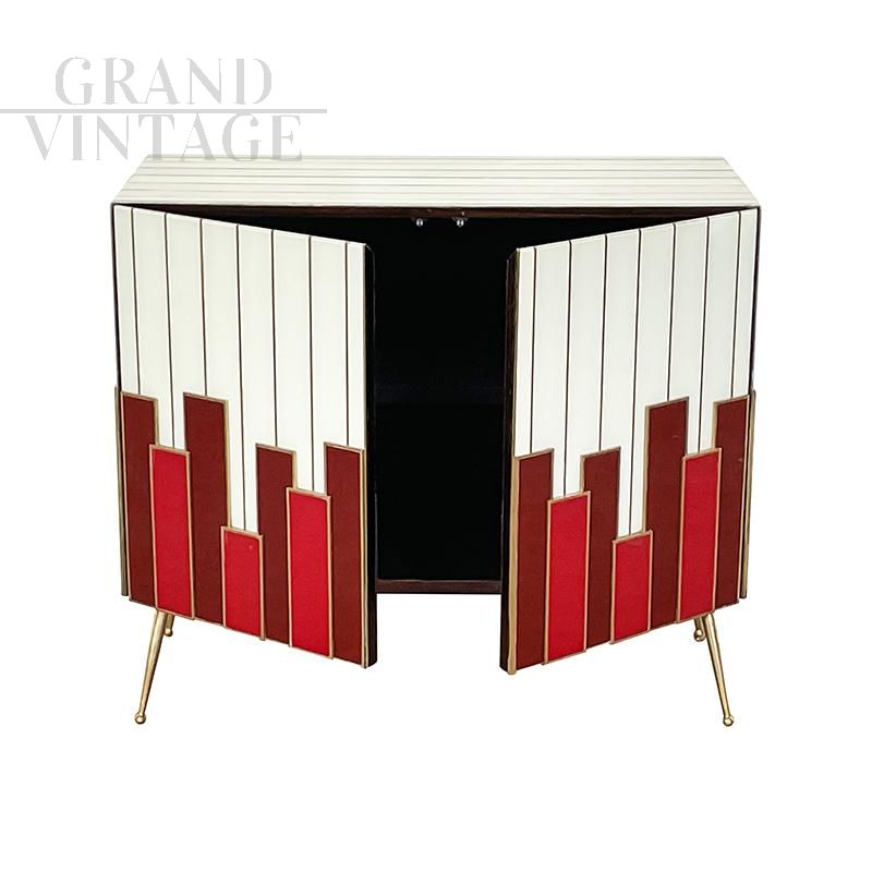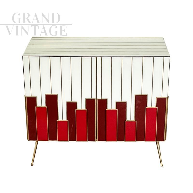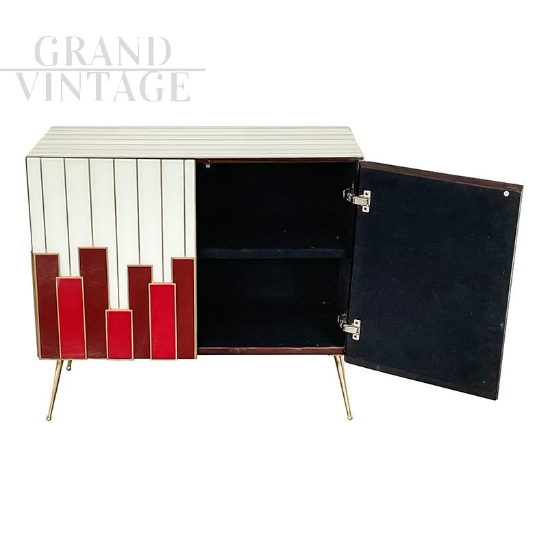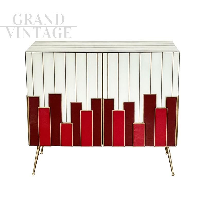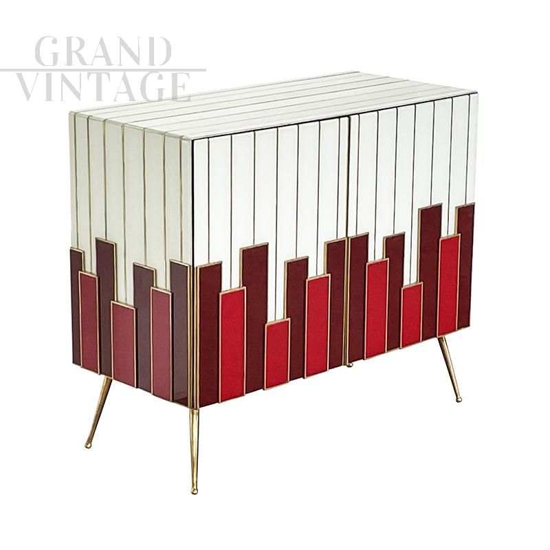 Small design sideboard entirely handmade with wooden structure covered in glass in white, red and maroon colours, doors with push-pull opening and an internal shelf. Brass profiles and feet.