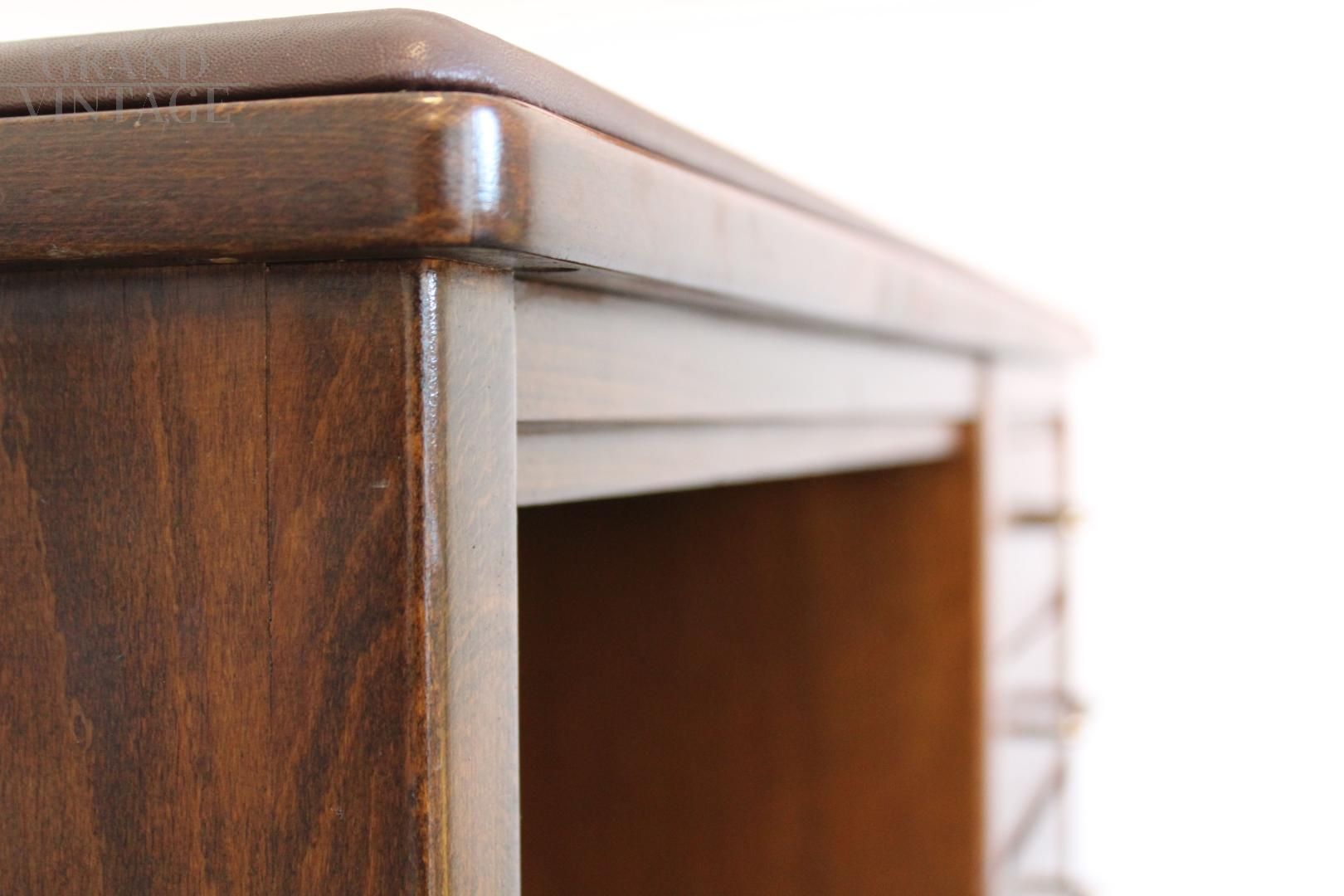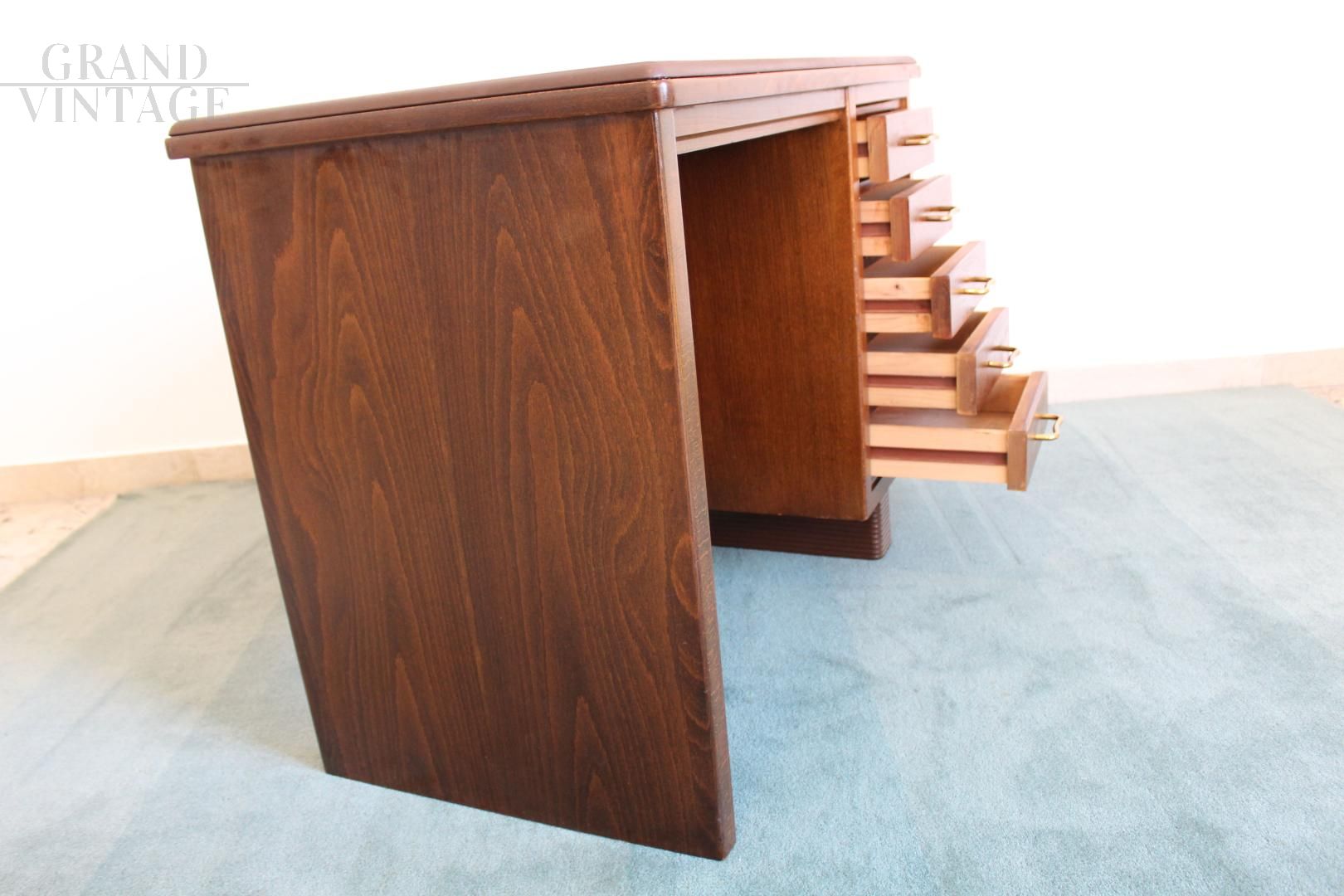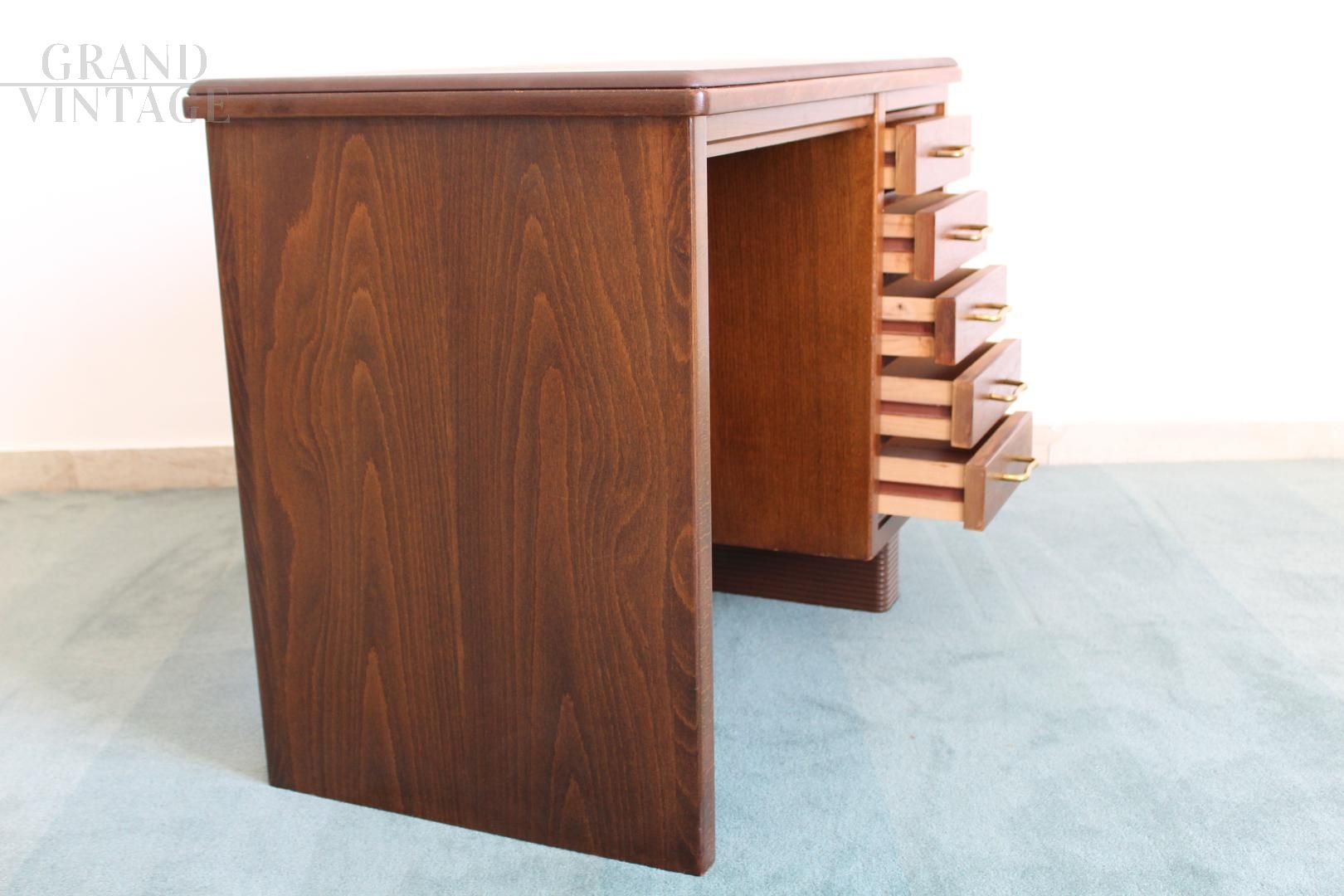 Desk with Italian design by Antonio Ferretti Milano, made of wood covered in high quality laminate, with 5 drawers with brass handles and a shelf covered in ecological leather, all original of the time. The drawers rest on the unmistakable design of Antonio Ferretti with this leg worked in a particular way. The object is in excellent condition, fully functional and with an impressive scenography that excites you when you find yourself in front of it.