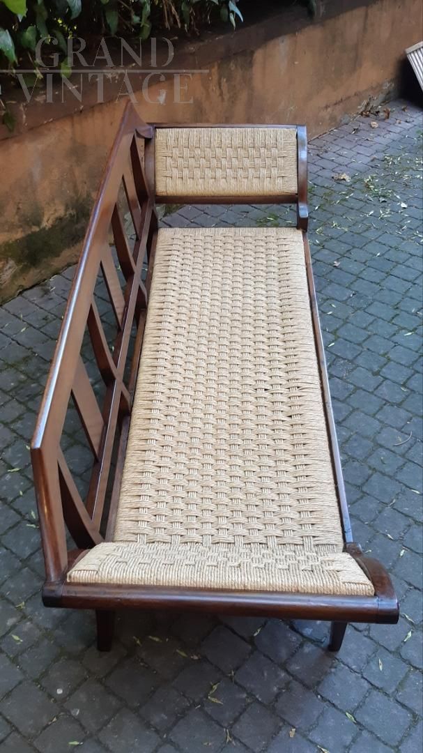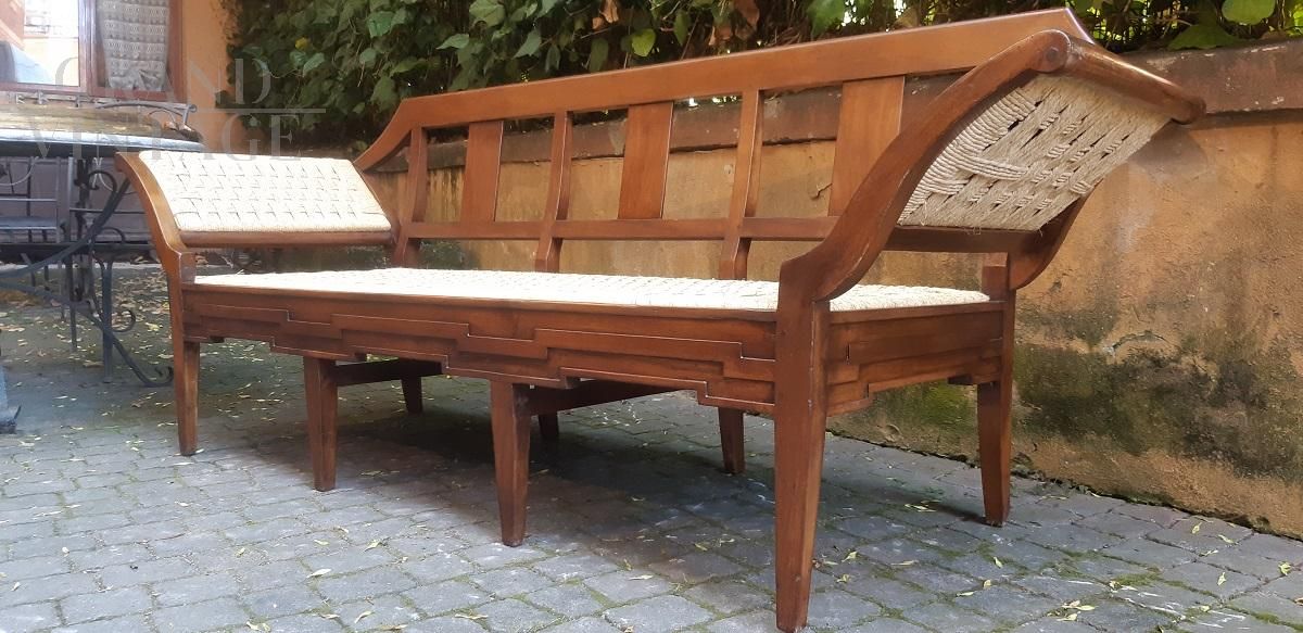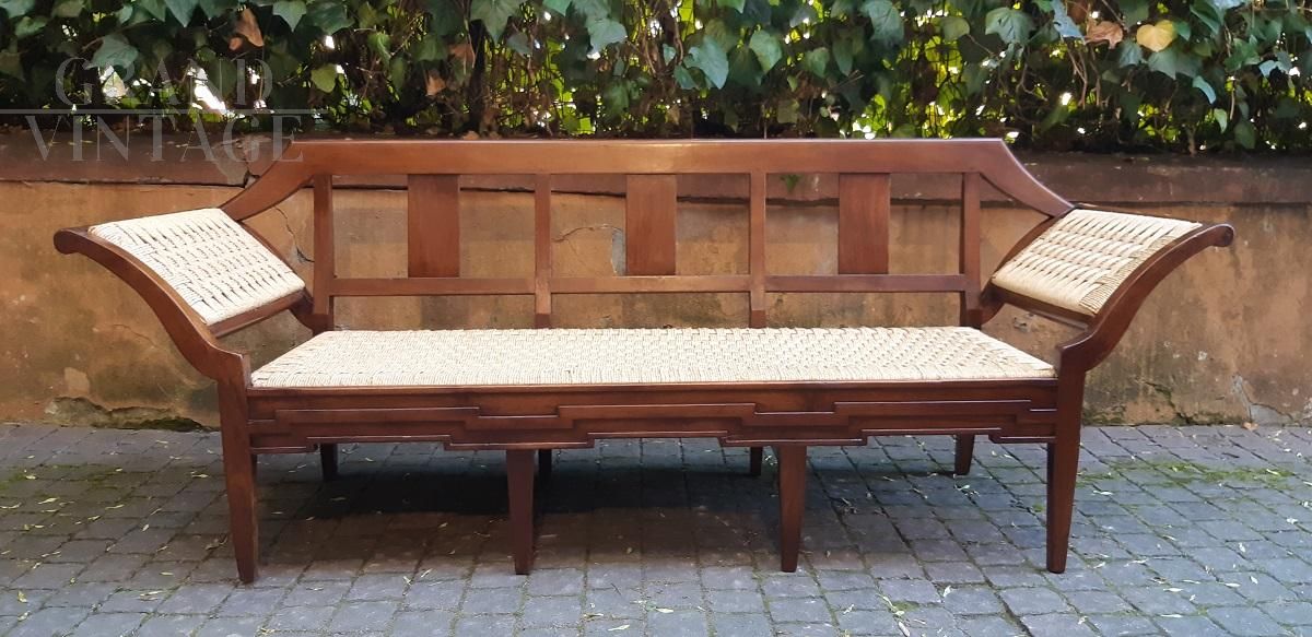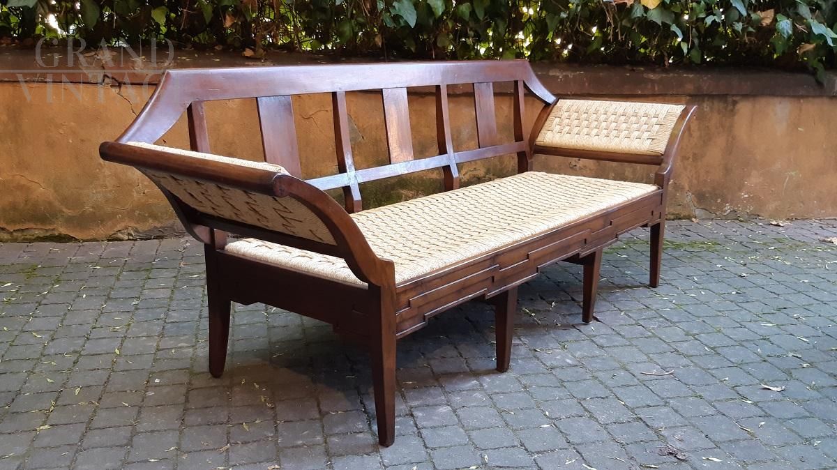 Antique settee sofa of Italian Turin origin from the end of the 18th century, in walnut wood with carvings on the front and woven straw seat. Refined sofa complete in all its parts, the beautiful lines combined with the right proportions allow it to set up the most refined environments. The neoclassical feet and protruding handles characterize it.