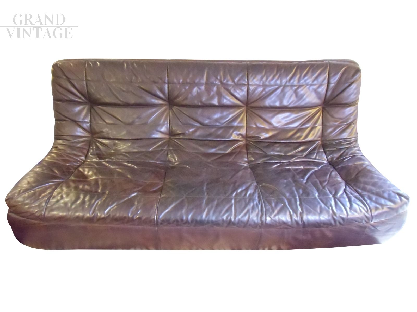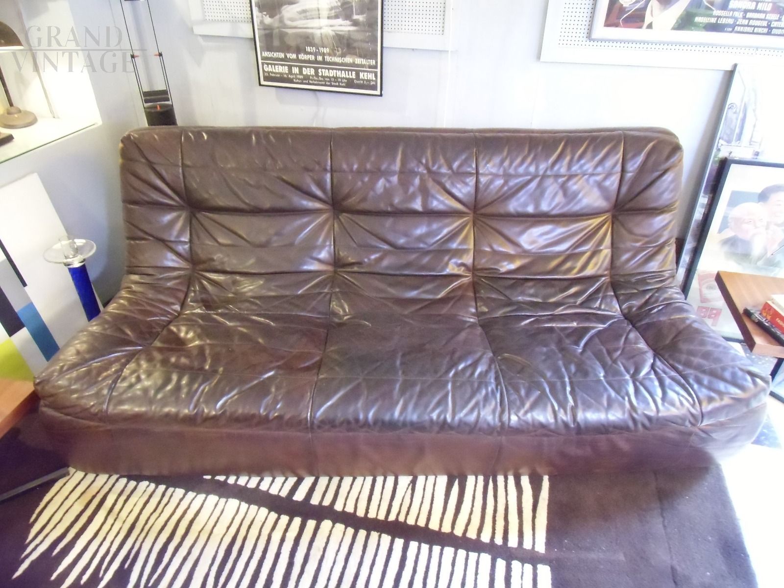 Bellissimo ed elegante divano del 1972 attribuito a Michel Ducaroy, in pelle color cioccolato.